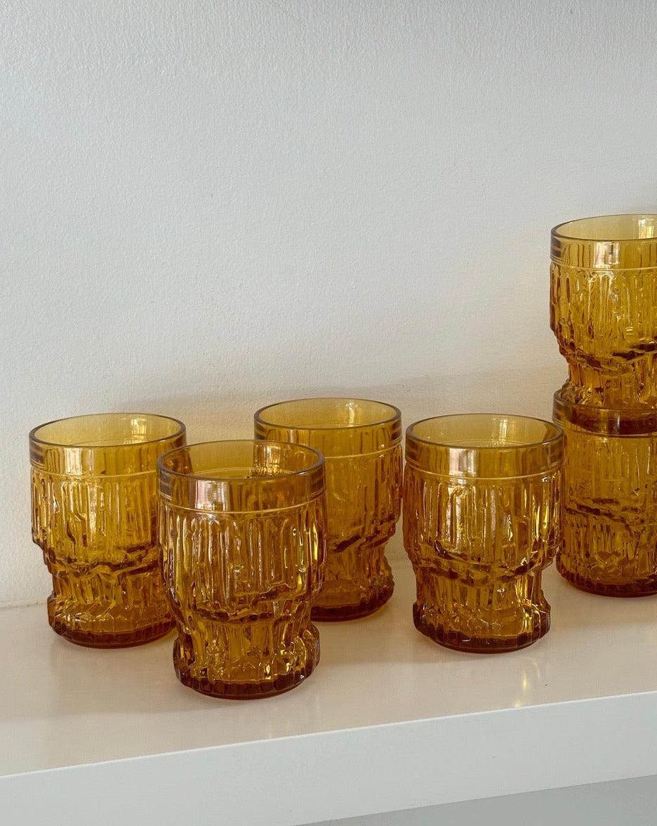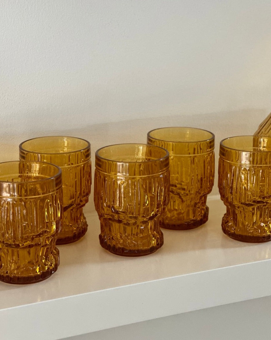 Amber Glass Jug and Six Matching Glasses