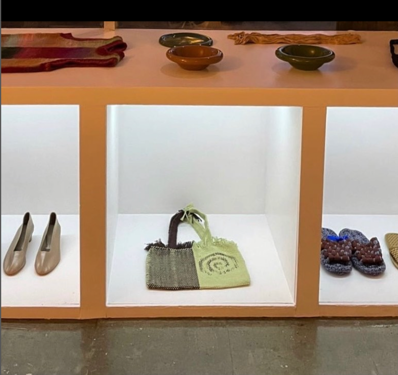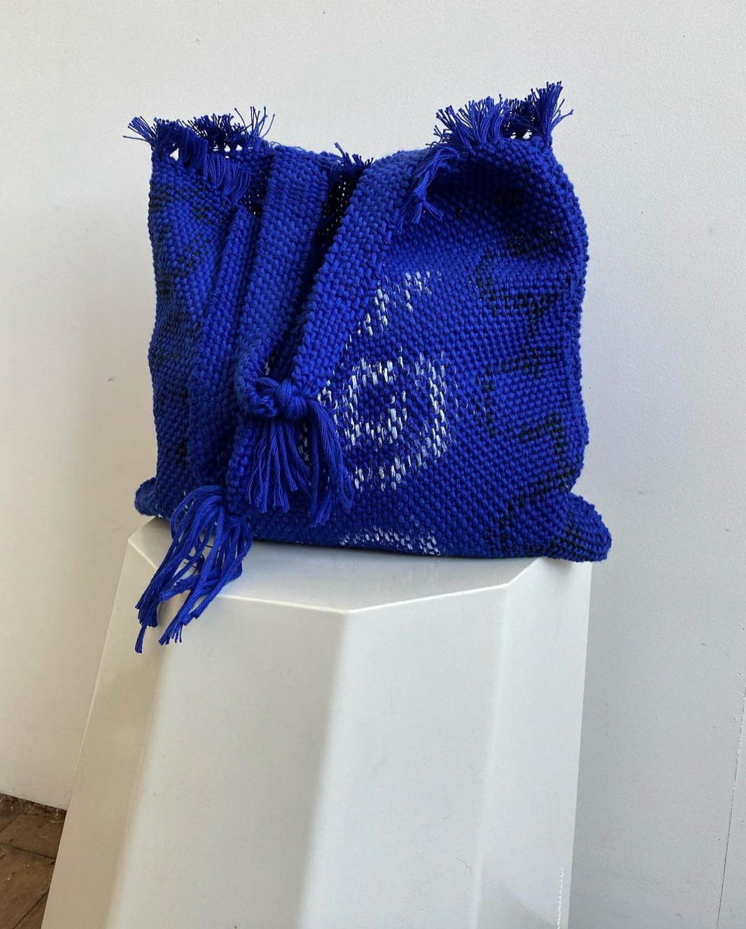 Each bag is woven on a table loom in one continuous piece, connecting the handles with the body seamlessly. The warp threads are then utilised as a fringe around the opening of the bag. Anna paints the warp threads before being woven, a predominant technique in her practice.