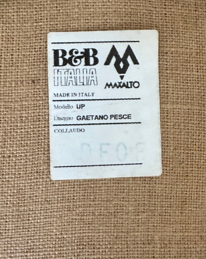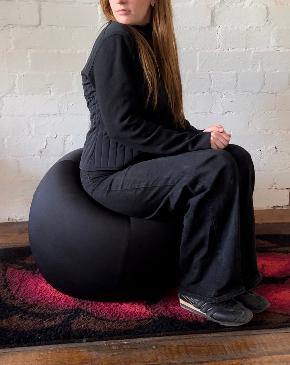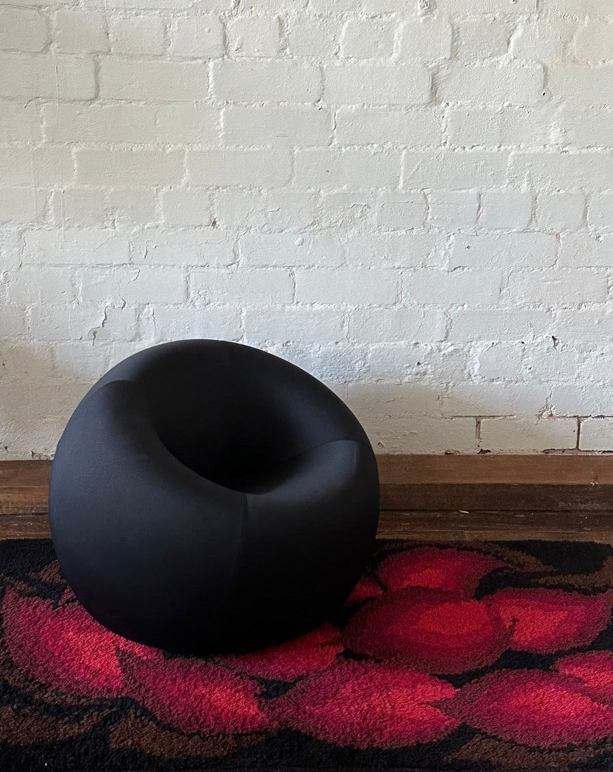 Made from soft polyurethane foam obtained by cold moulding, covered with a black elastic fabric decorated with two buttons.