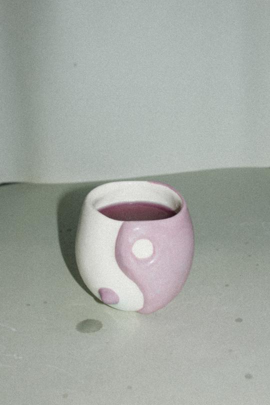 The Balanced cup in lilac. Hand formed from clay embossed with the yin yang symbol. Representing the balance of two opposites, for a well balanced beverage.