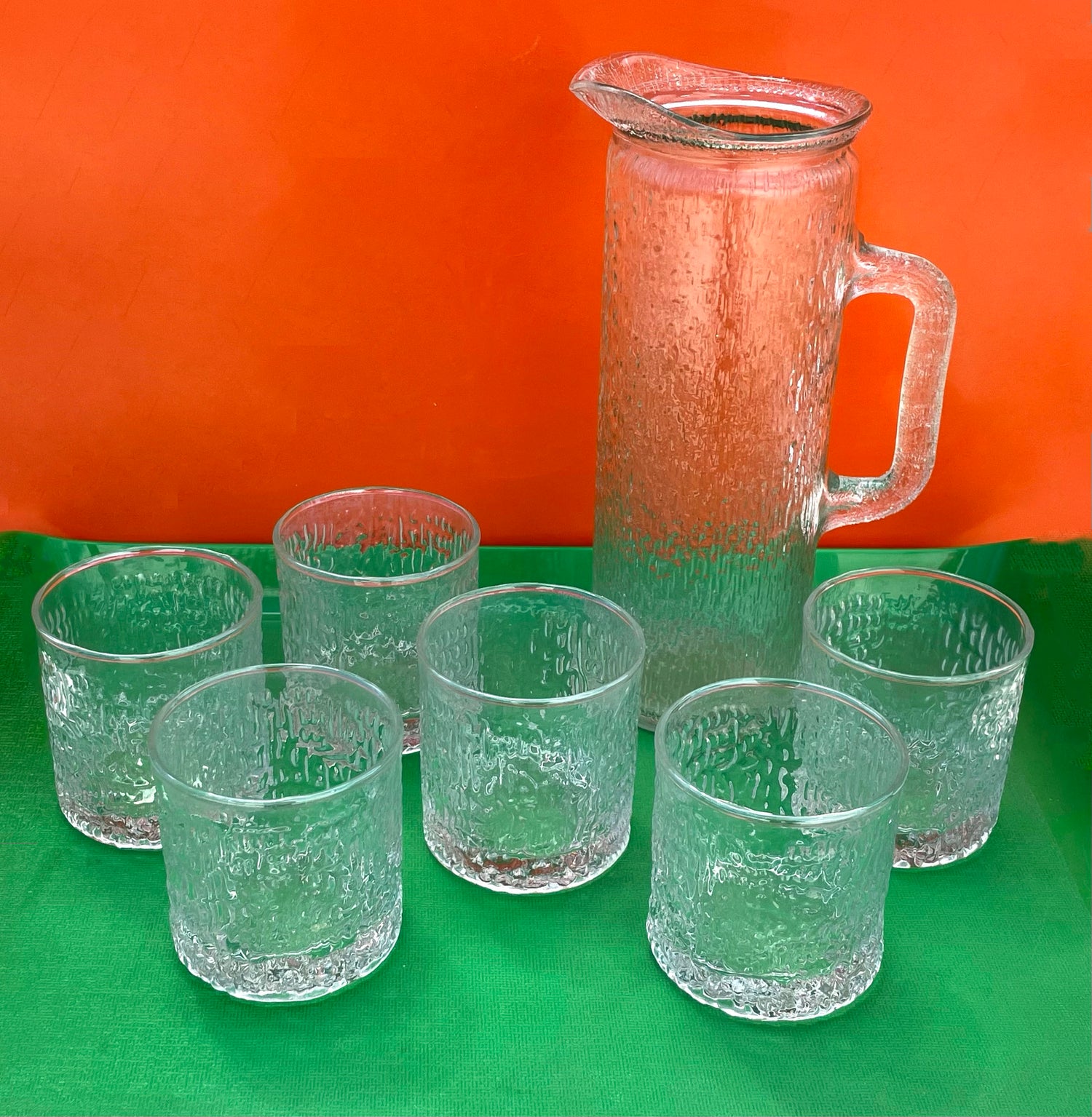 Press moulded tumblers featuring a bark texture, circa 1970s.