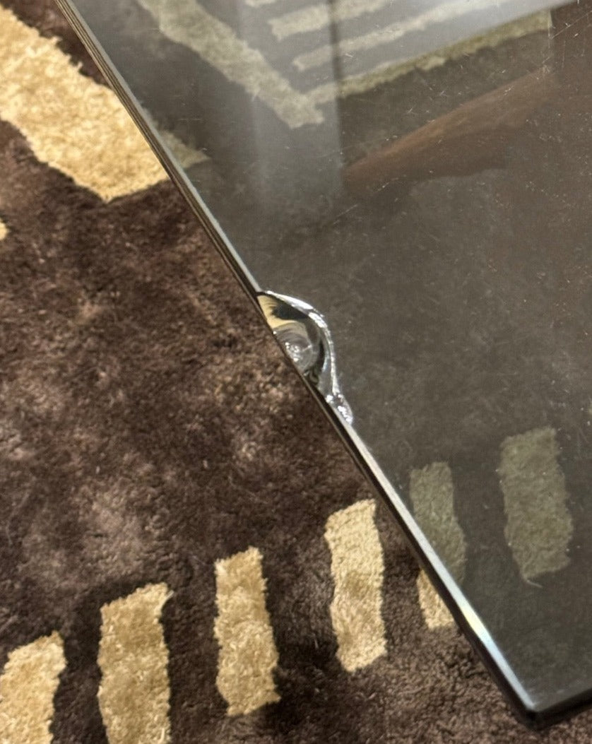 Good condition. Base is in great condition, however the smoked glass top does have some light scratches as well as a chip (shown in last photo). The glass top can be replaced.