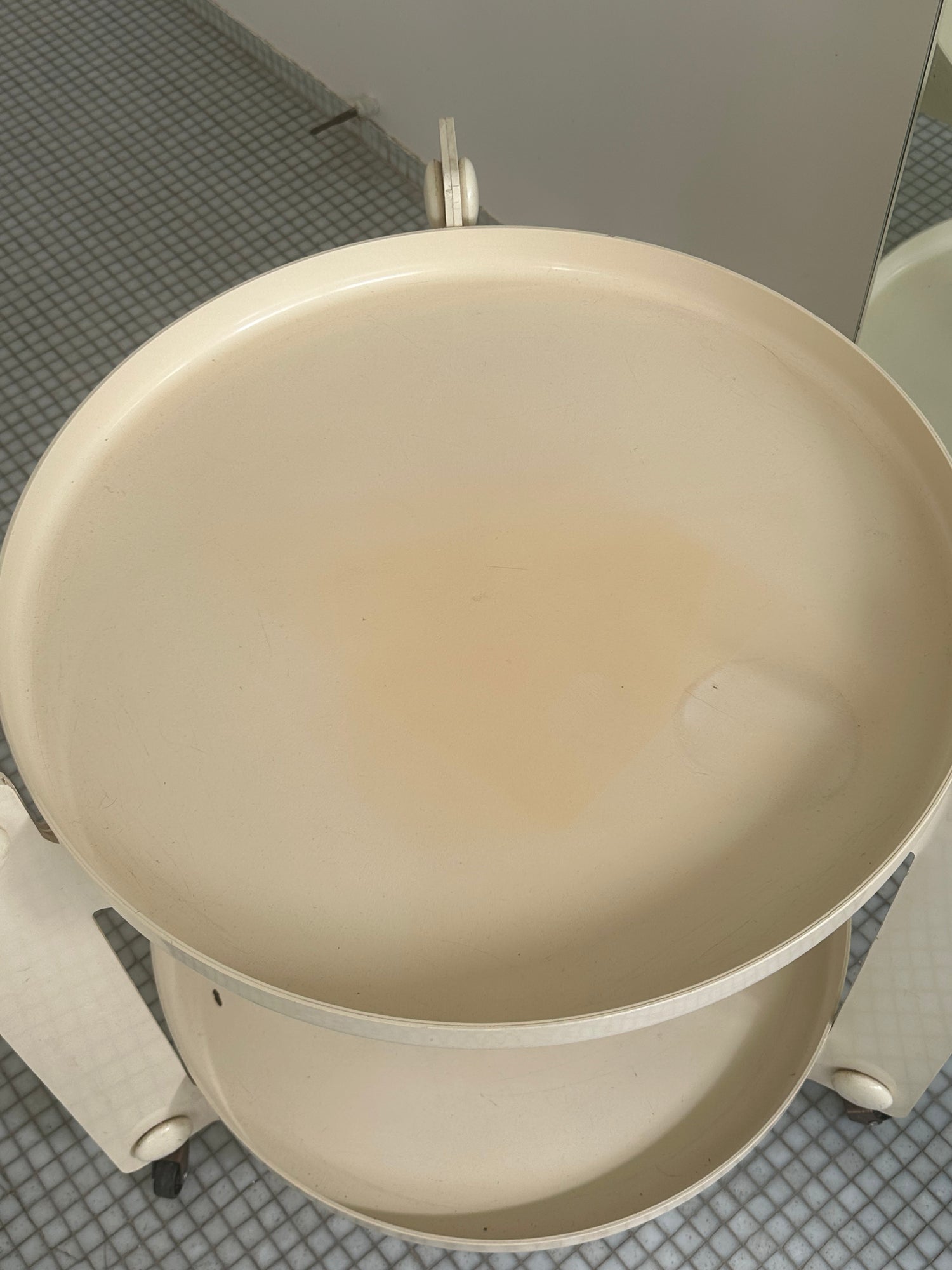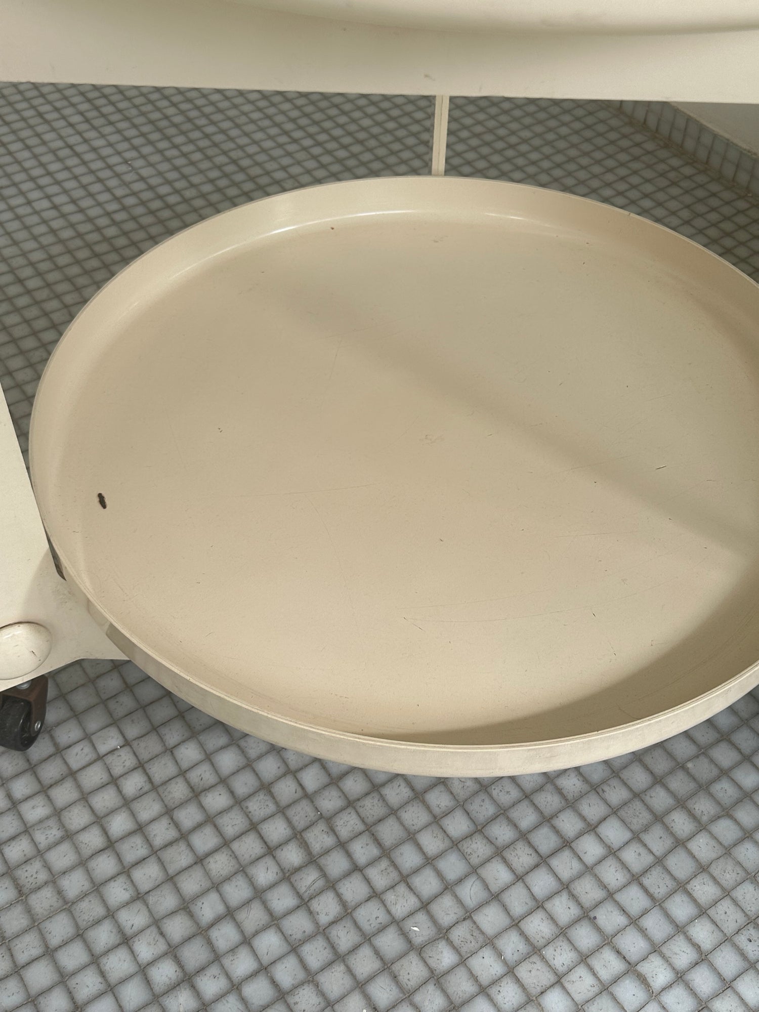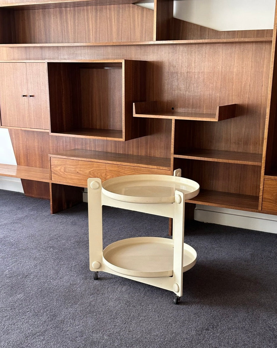 An Italian space age drinks trolley designed in the 70s for Guzzini. The trolley features two removable circular trays that sit within the triangular structure.
