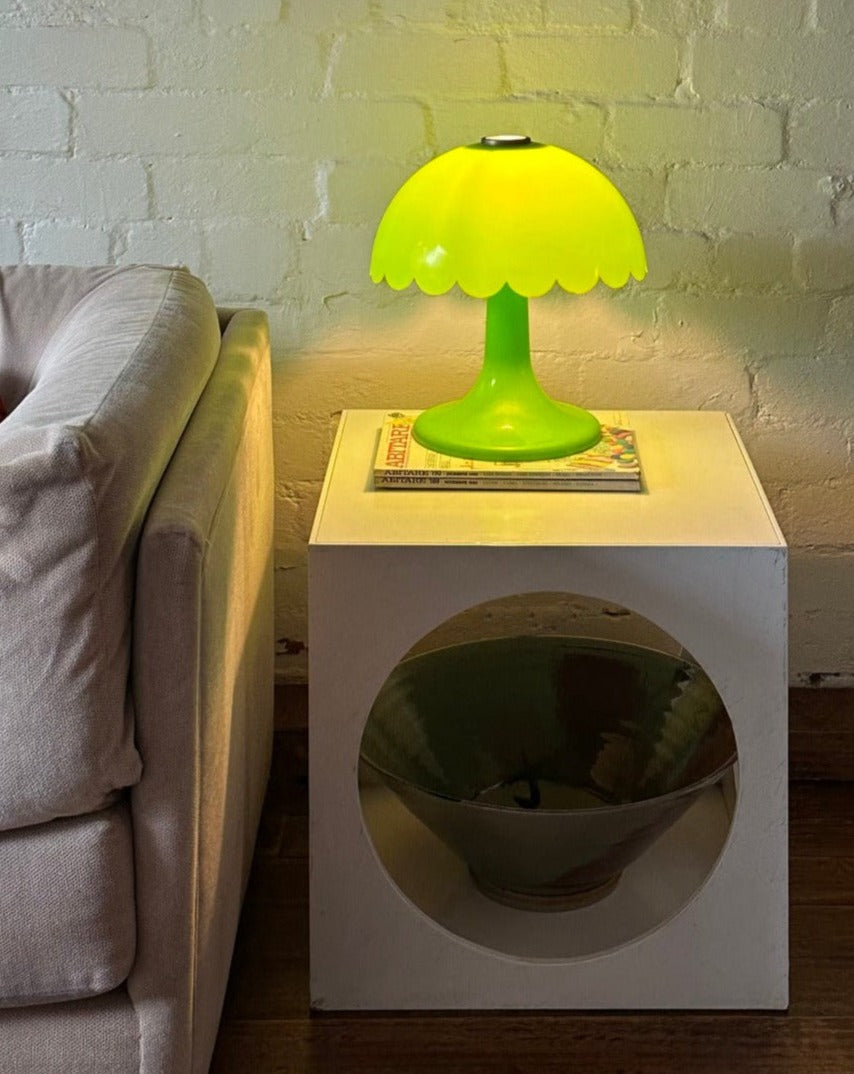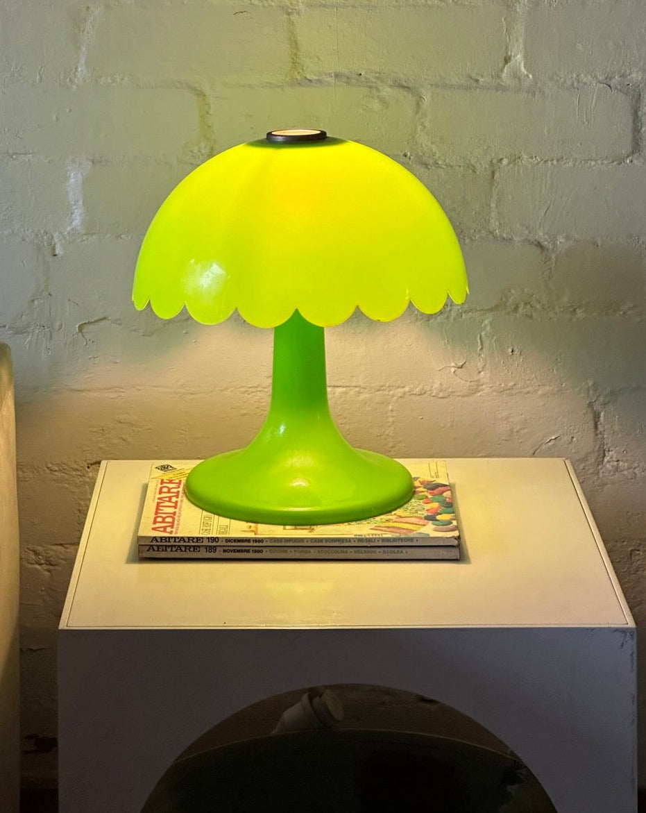 1970s plastic mushroom lamp in green with scalloped shade detail.
