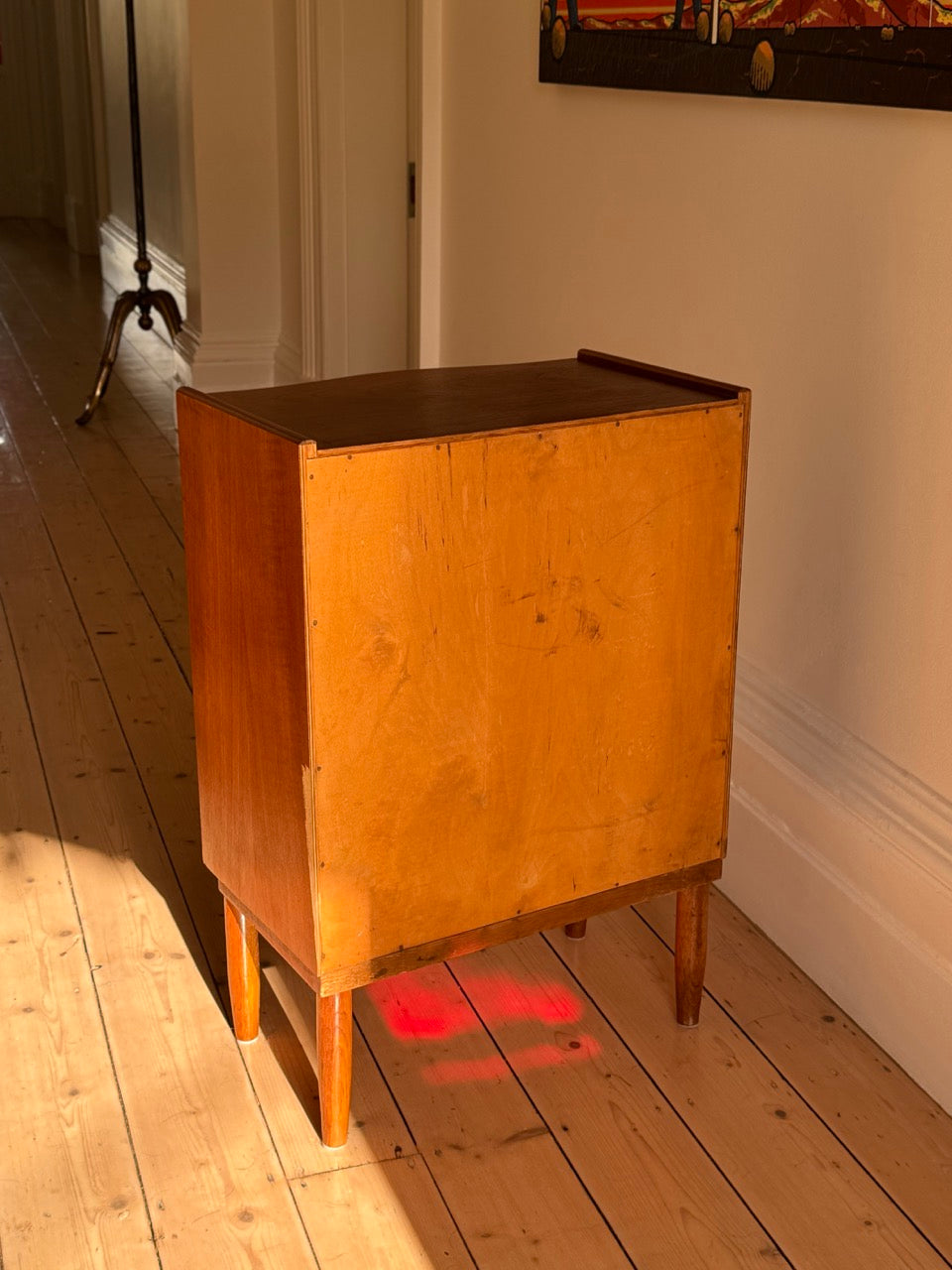 Great condition with one issue to note. The back right side of the drawers have lost some teak, as shown in photo 9. This is not visible when facing the drawers.