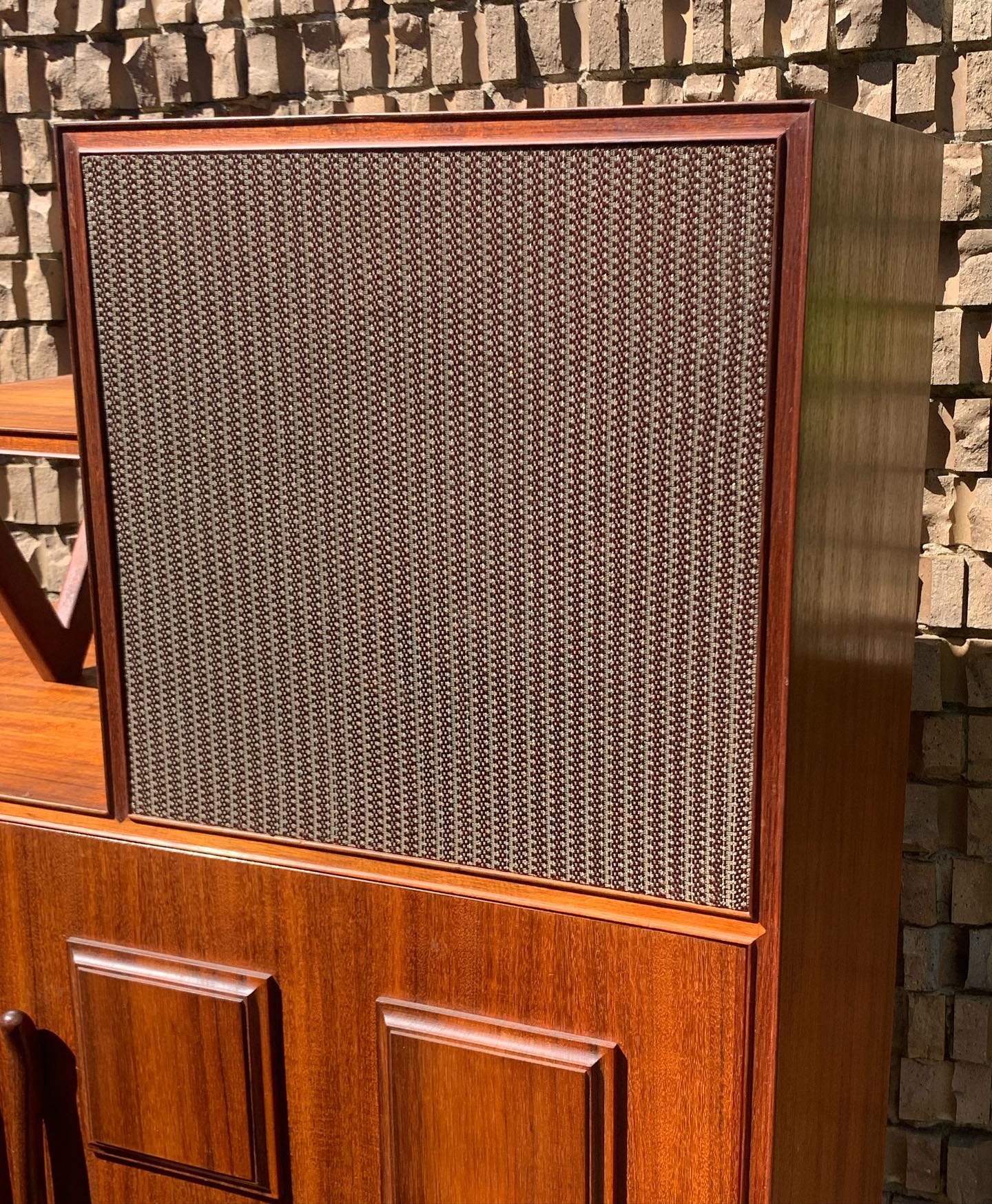 Four doors with decorative parquetry inlay and two inbuilt speakers. Includes an inbuilt plant or lamp stand on the left side.