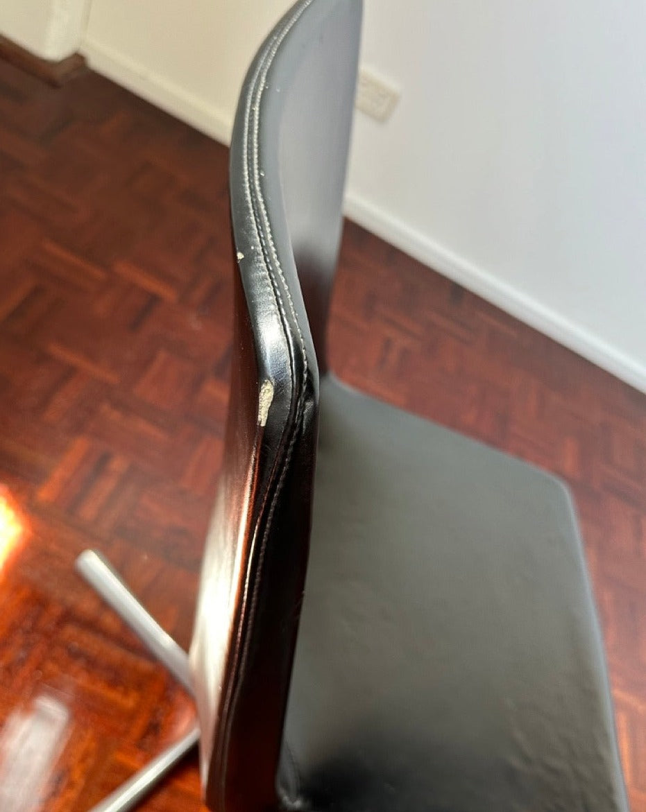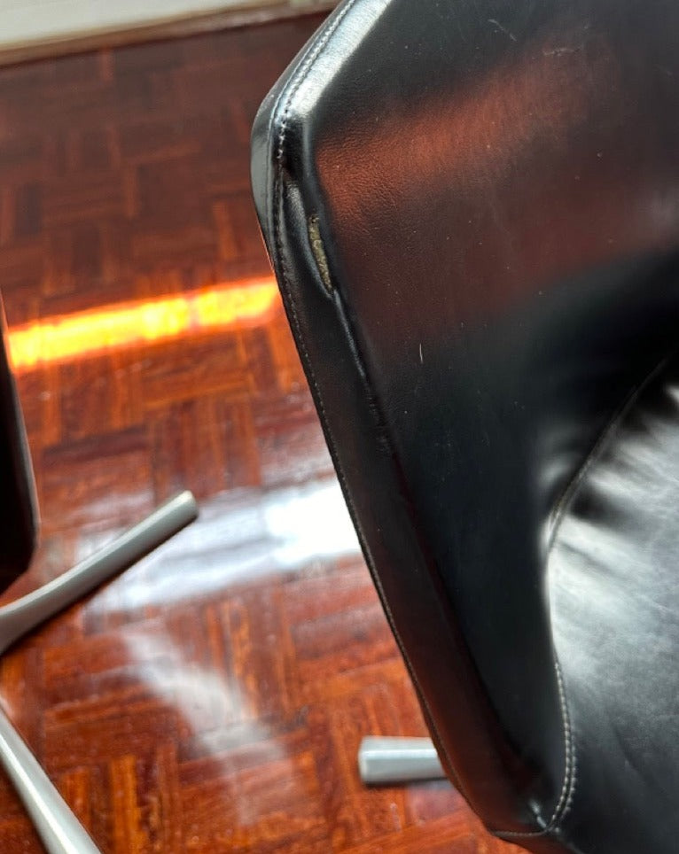 2 of the chairs have a small nick/ split in the vinyl approx 1cm long as shown in last 2 photos. All 6 chairs retain their original labels and are numbered. The foot mechanisms are in perfect working condition to raise and lower the seat height. The chairs are solid with no structural issues.