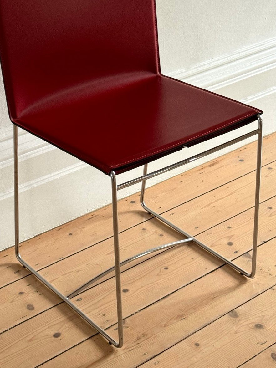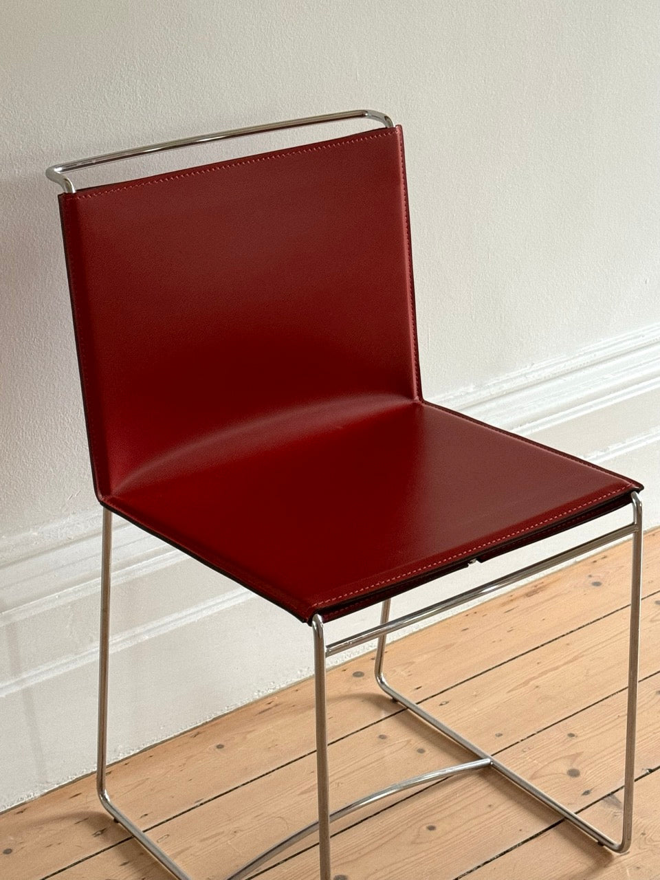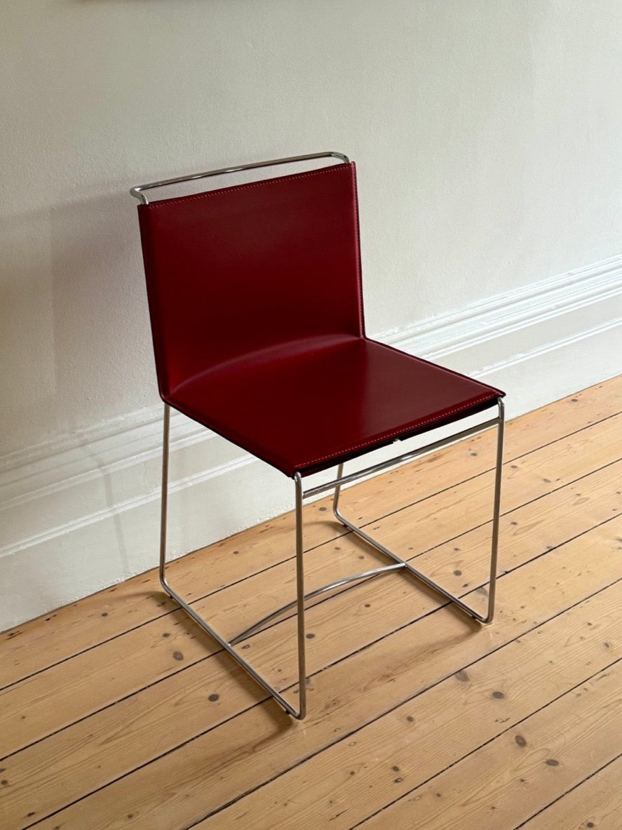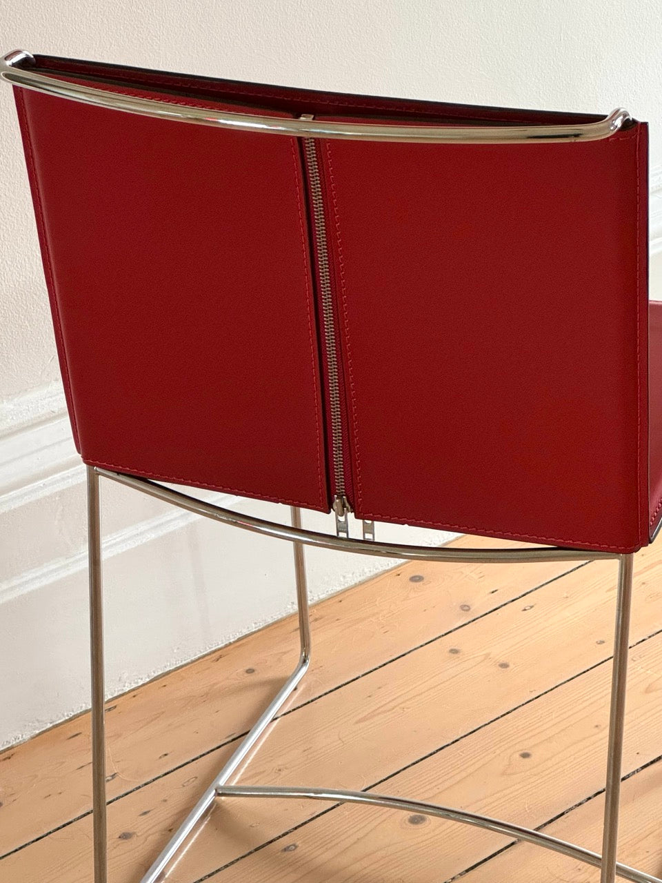 The chair features a chrome-plated steel sleigh base with a red leather seat and a chromed zip