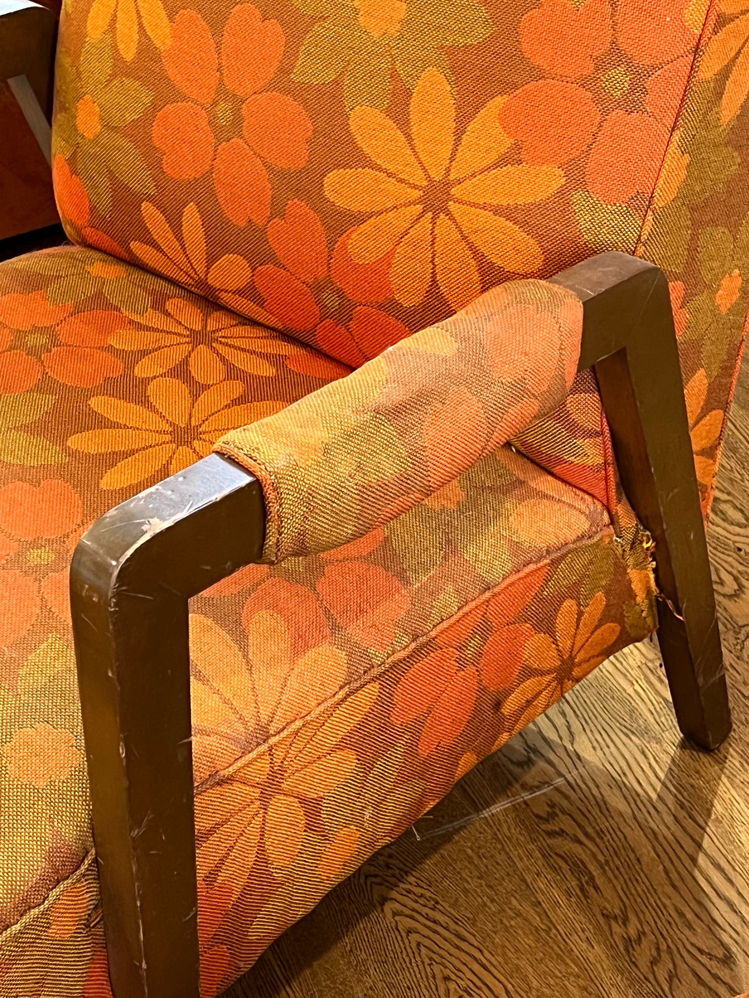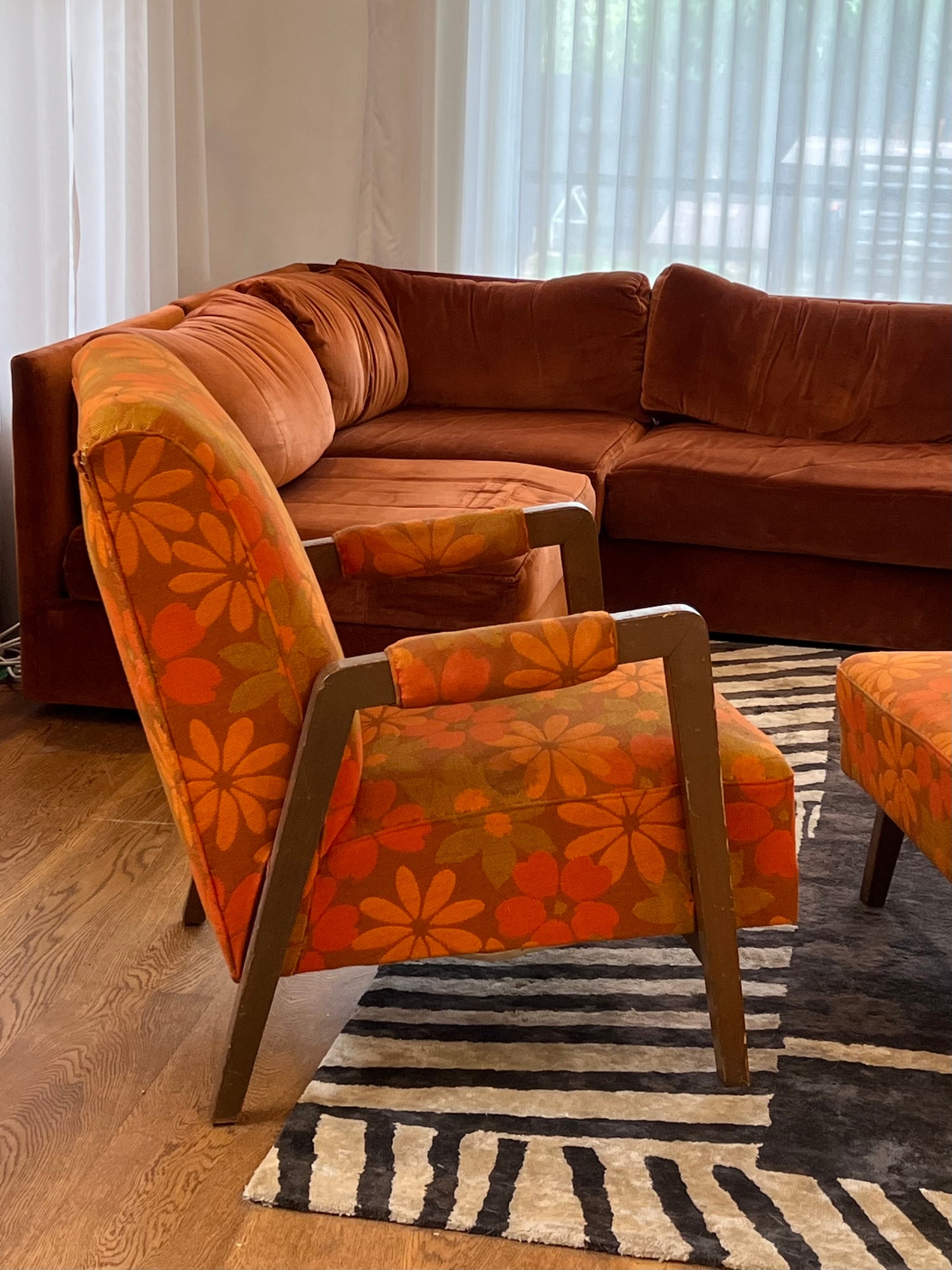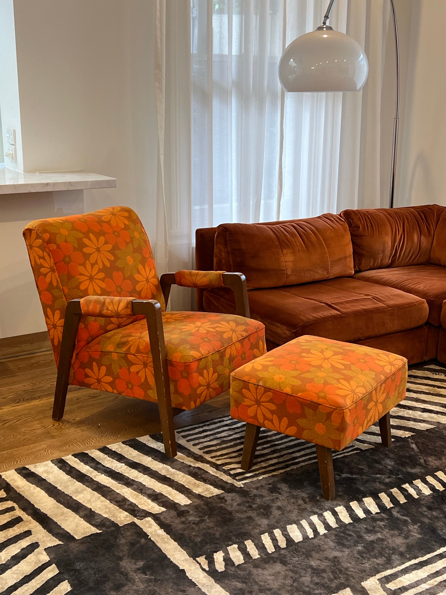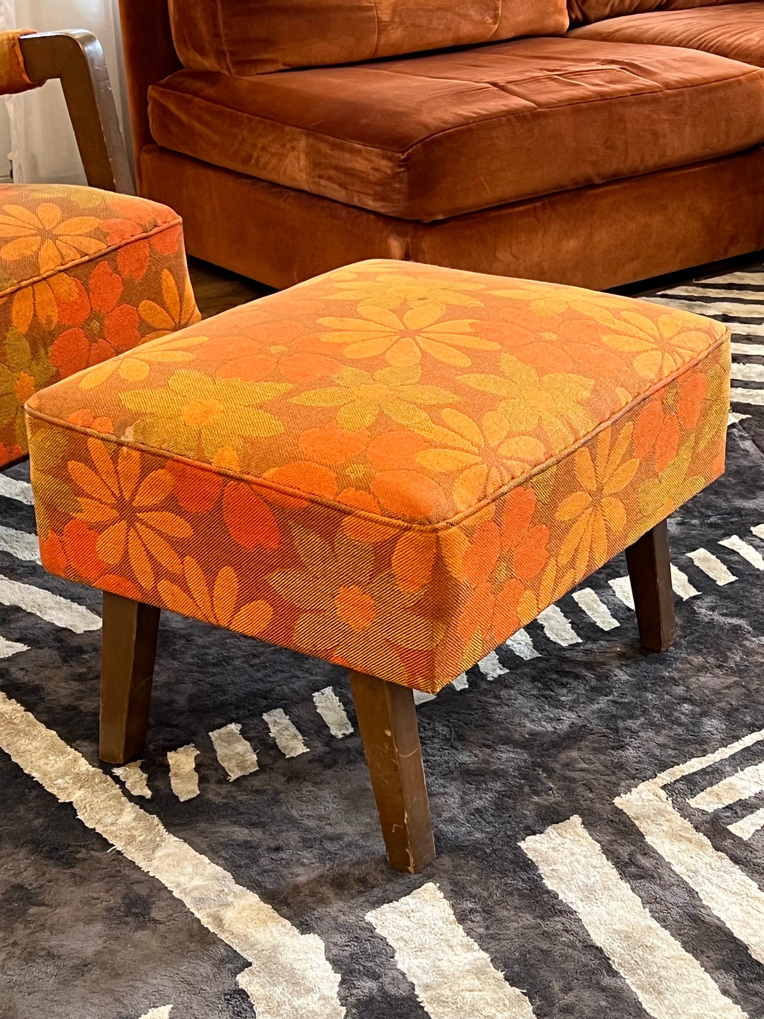 1960s armchair and foot stool - both structurally sound. In fine vintage condition, see photos for condition. Some markings to wood and stains on material. Still very aesthetically beautiful.