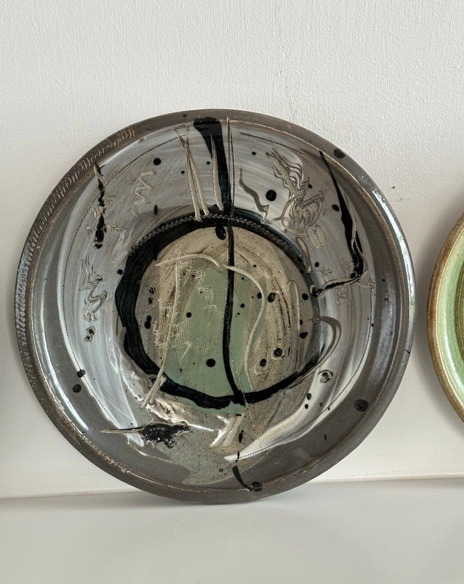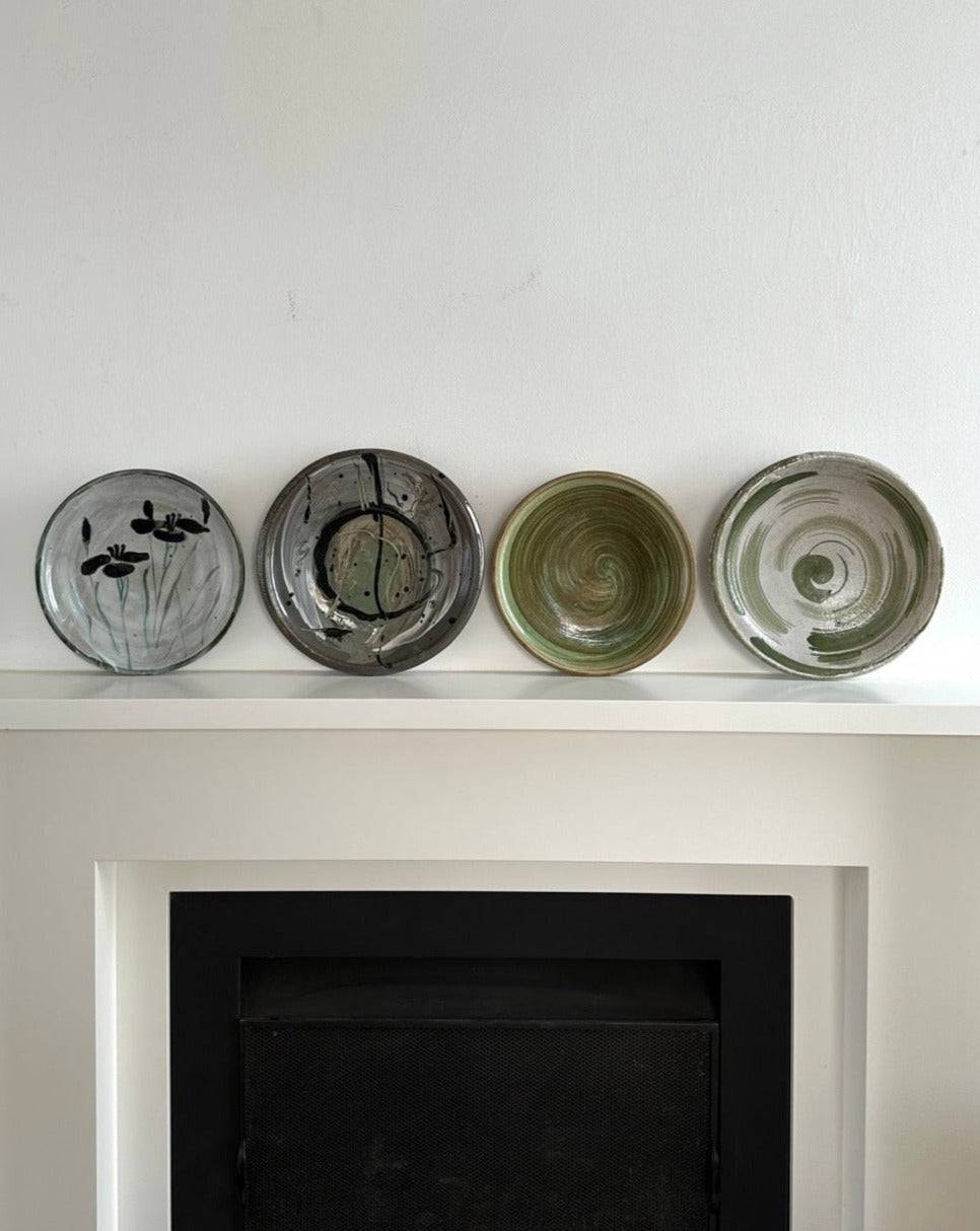 Glazed earthenware decorative platters with floral and swirl detail