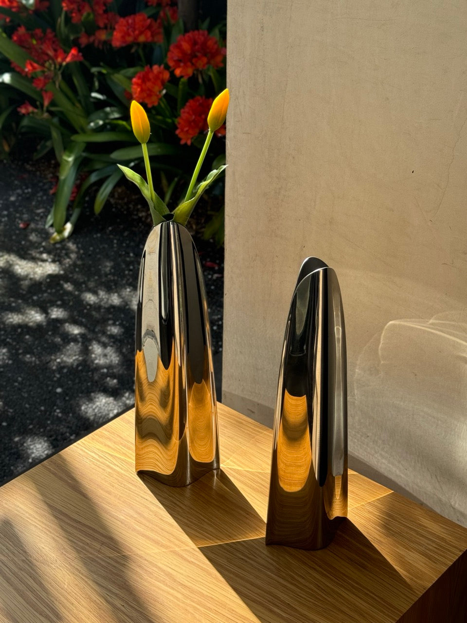 With a narrowed neck and relatively small opening, this vase is designed to hold just a few flowers at a time. A small bouquet or even a single flower ensures that the sleek design language of the vase is as important a decorative element as the flowers are. The mirror polished stainless steel reflects the contents of the vase.