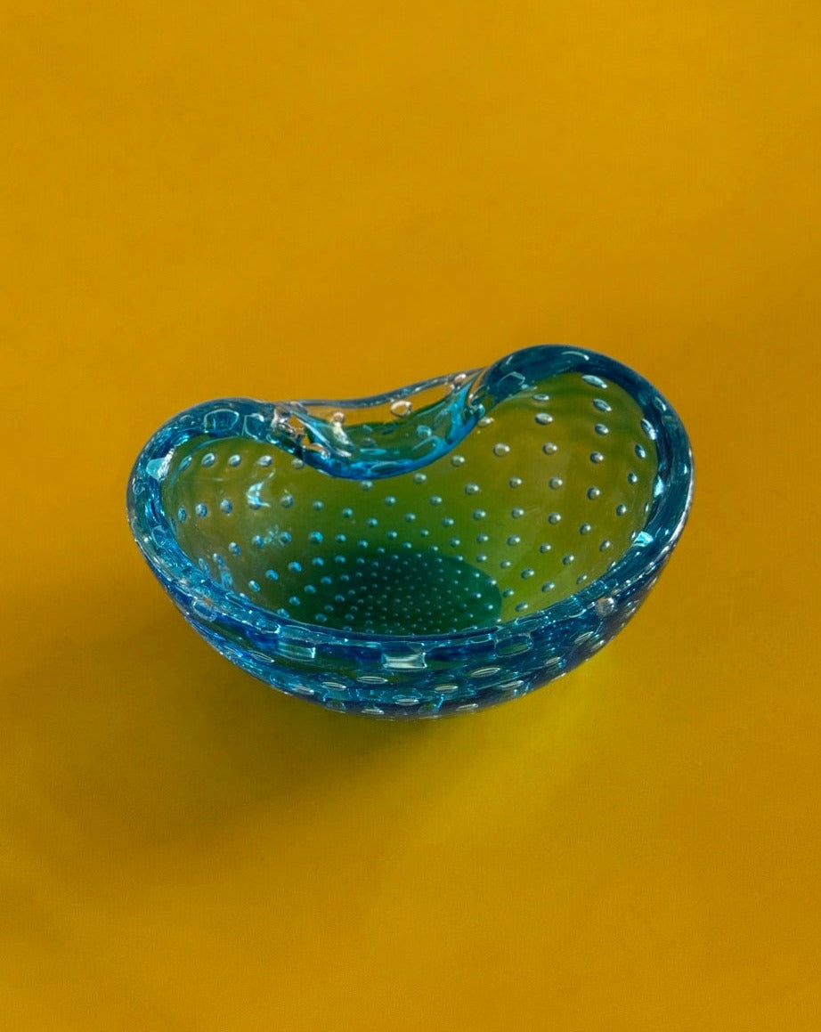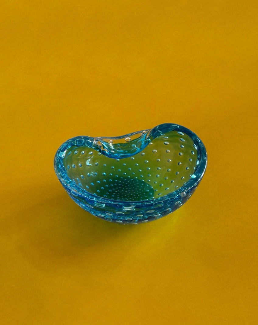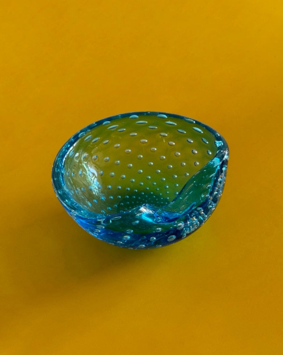 The sea blue bowl is embedded with bubbles and is shaped in the form of a sea shell