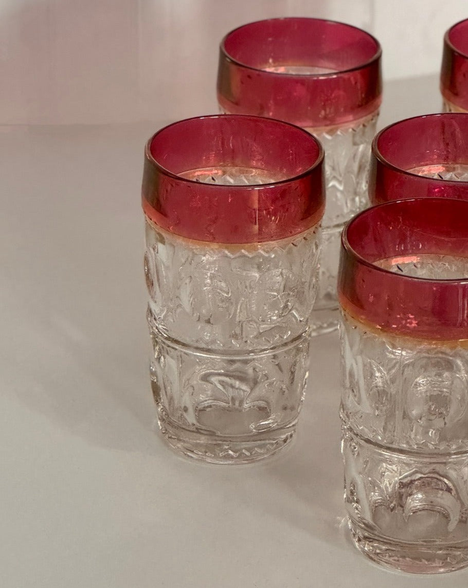 In a cranberry colour around the rim and a thumbprint and chevron pattern (King's Crown pattern)