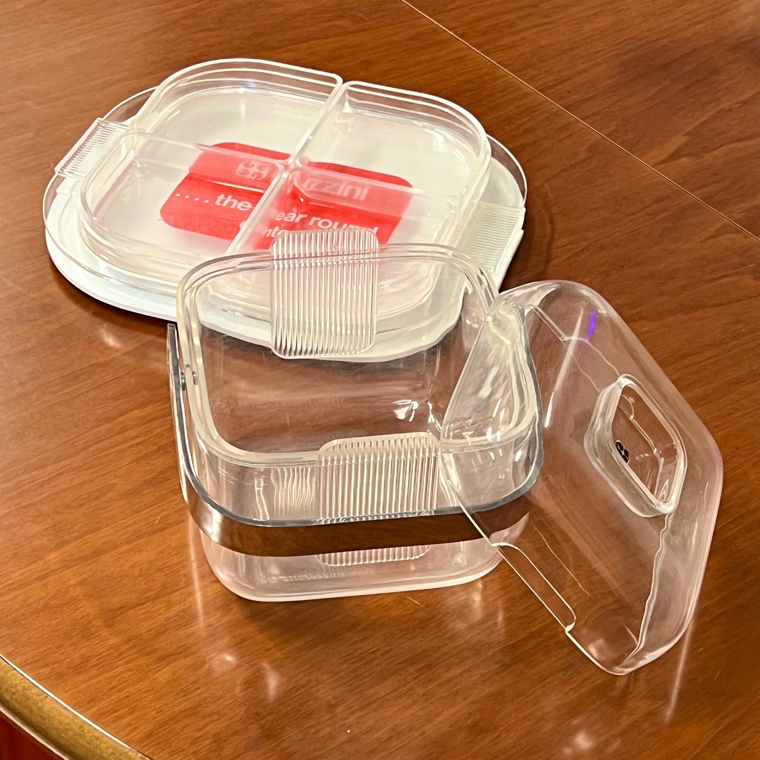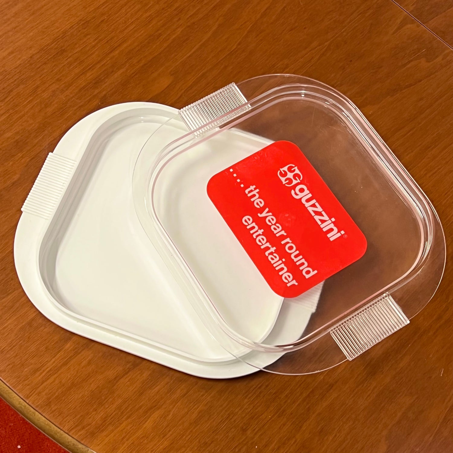 Mid Century Modern pack includes 2 platters (one lucite and one white) with 4 small lucite compartments that slot perfectly into the platter. Light markings all over, in good vintage condition.