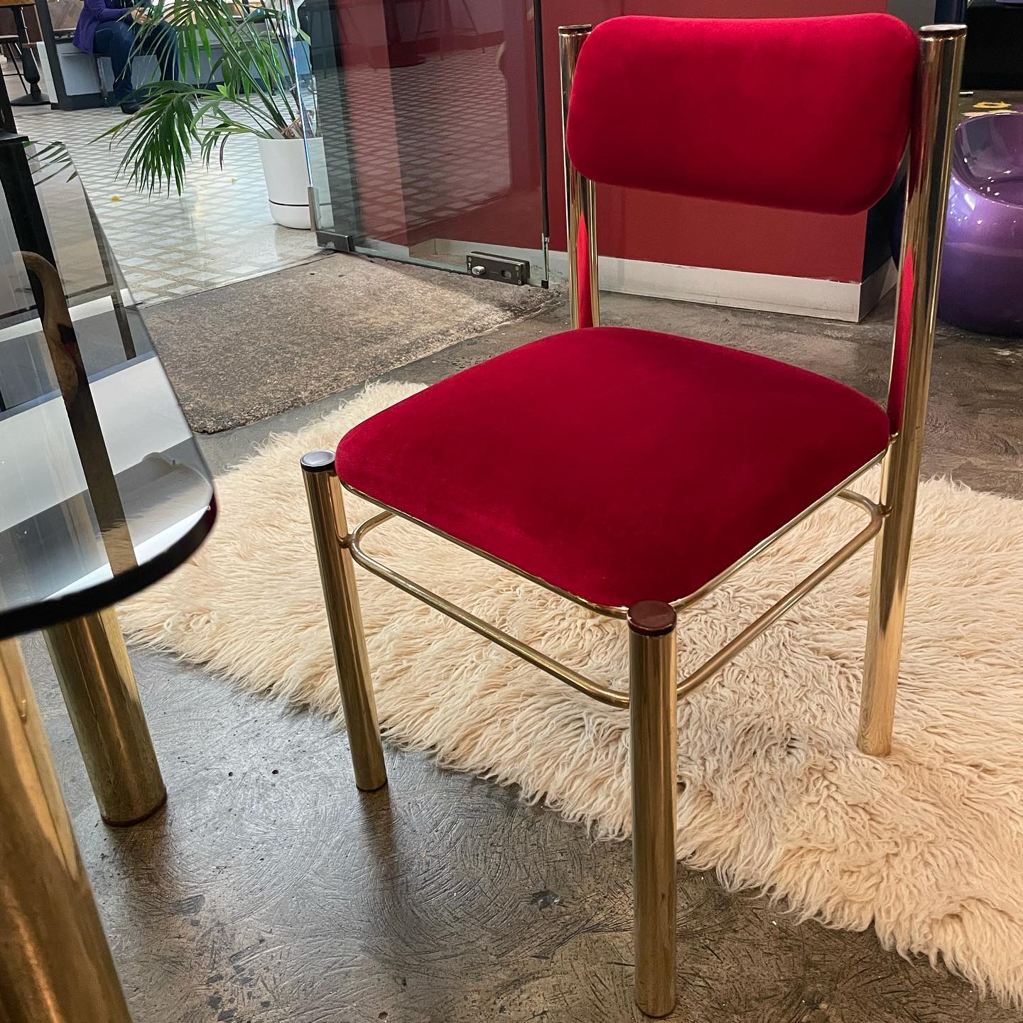 Smoked glass table and 6 ruby red velvet chairs with reclining back rests