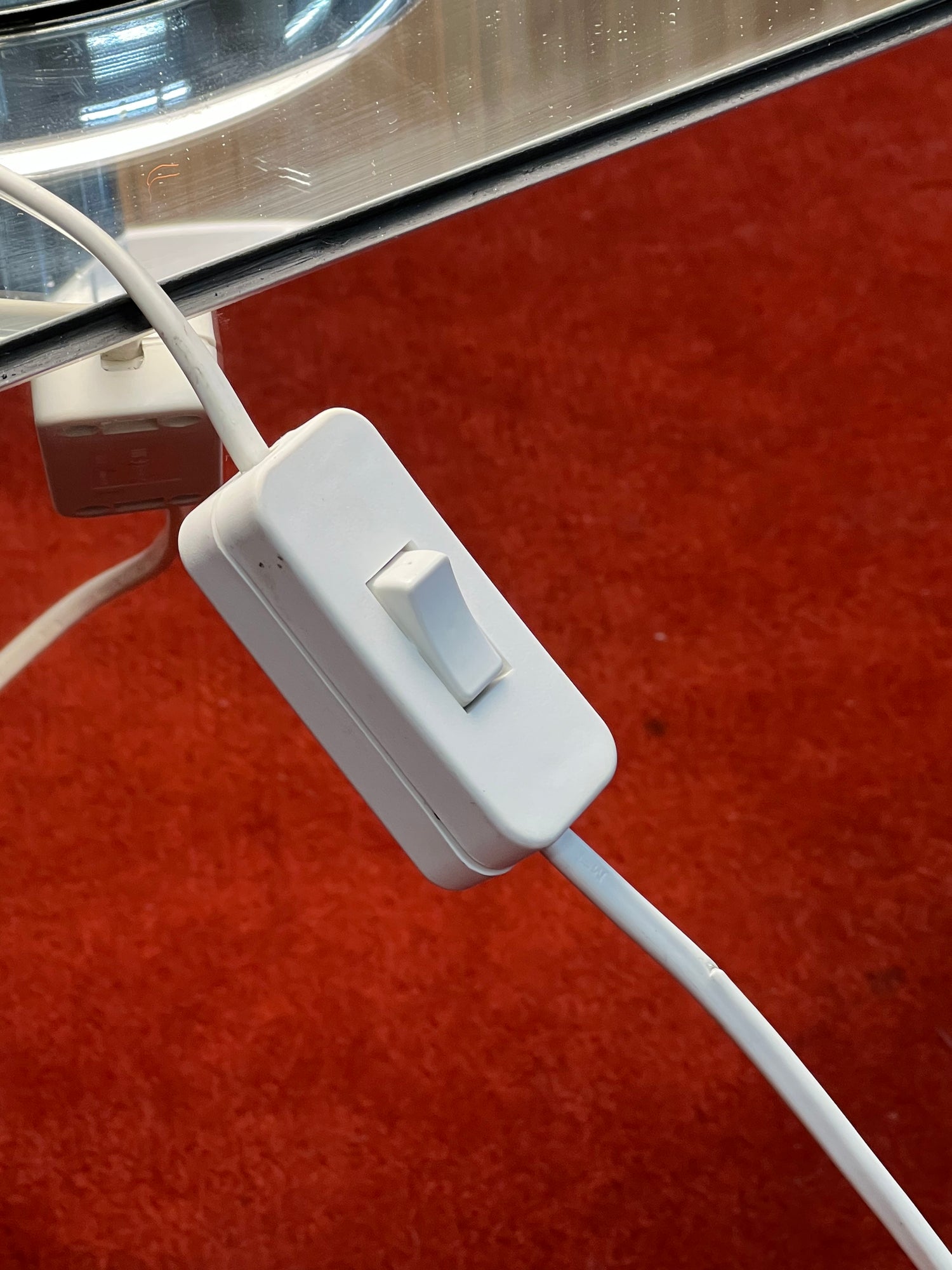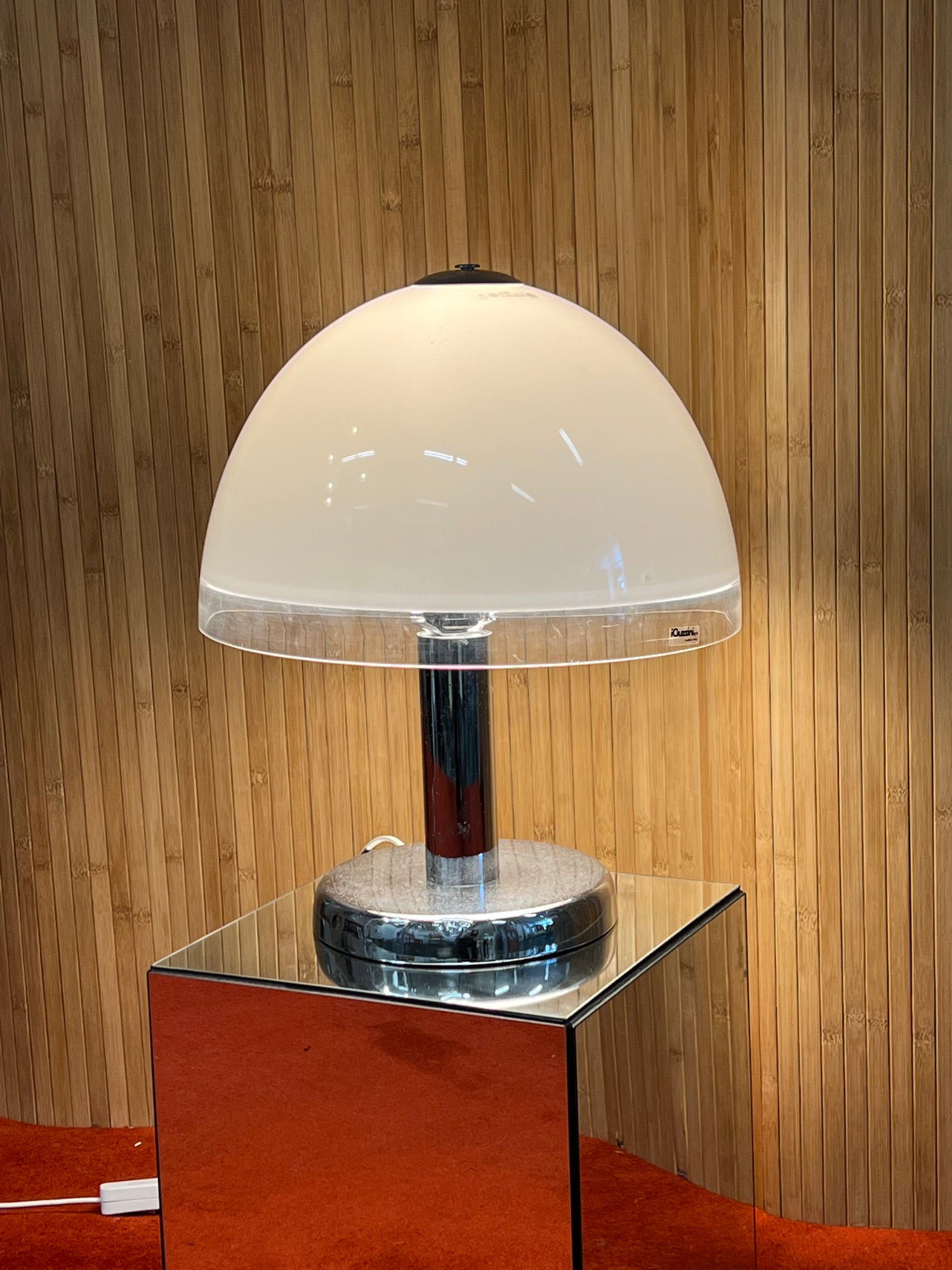 In fine vintage condition, some texture to the metal chrome base and a few dents (photographed) mushroom shade has some light scratches on the Perspex. In good working order. Base is not iGuzzini brand.