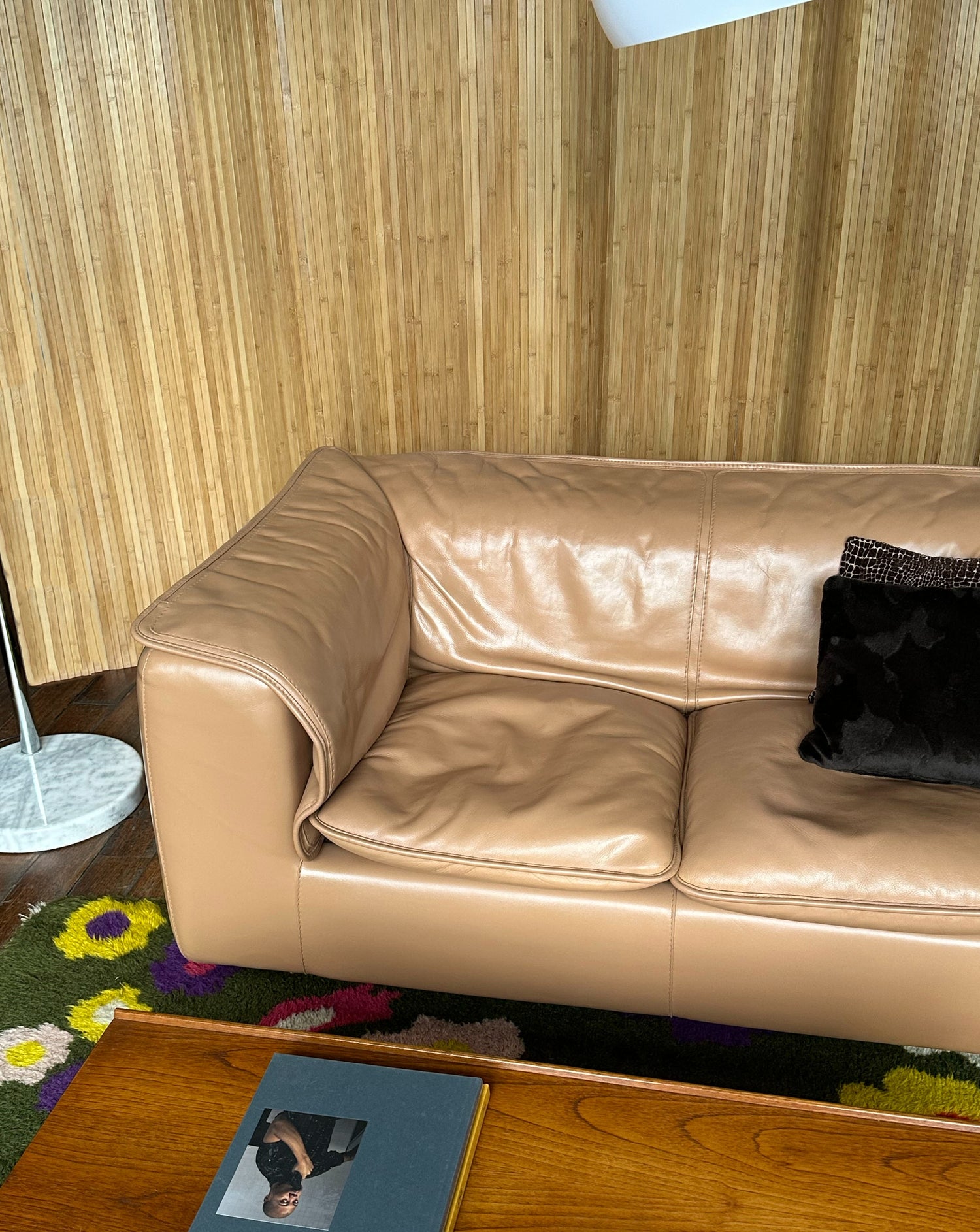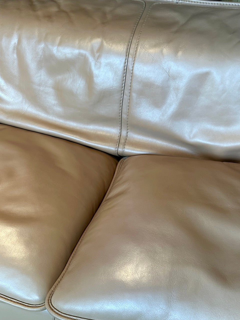 Beautiful tan colour. Super comfortable and cushiony. This sofa has had a full restoration and is in excellent condition.