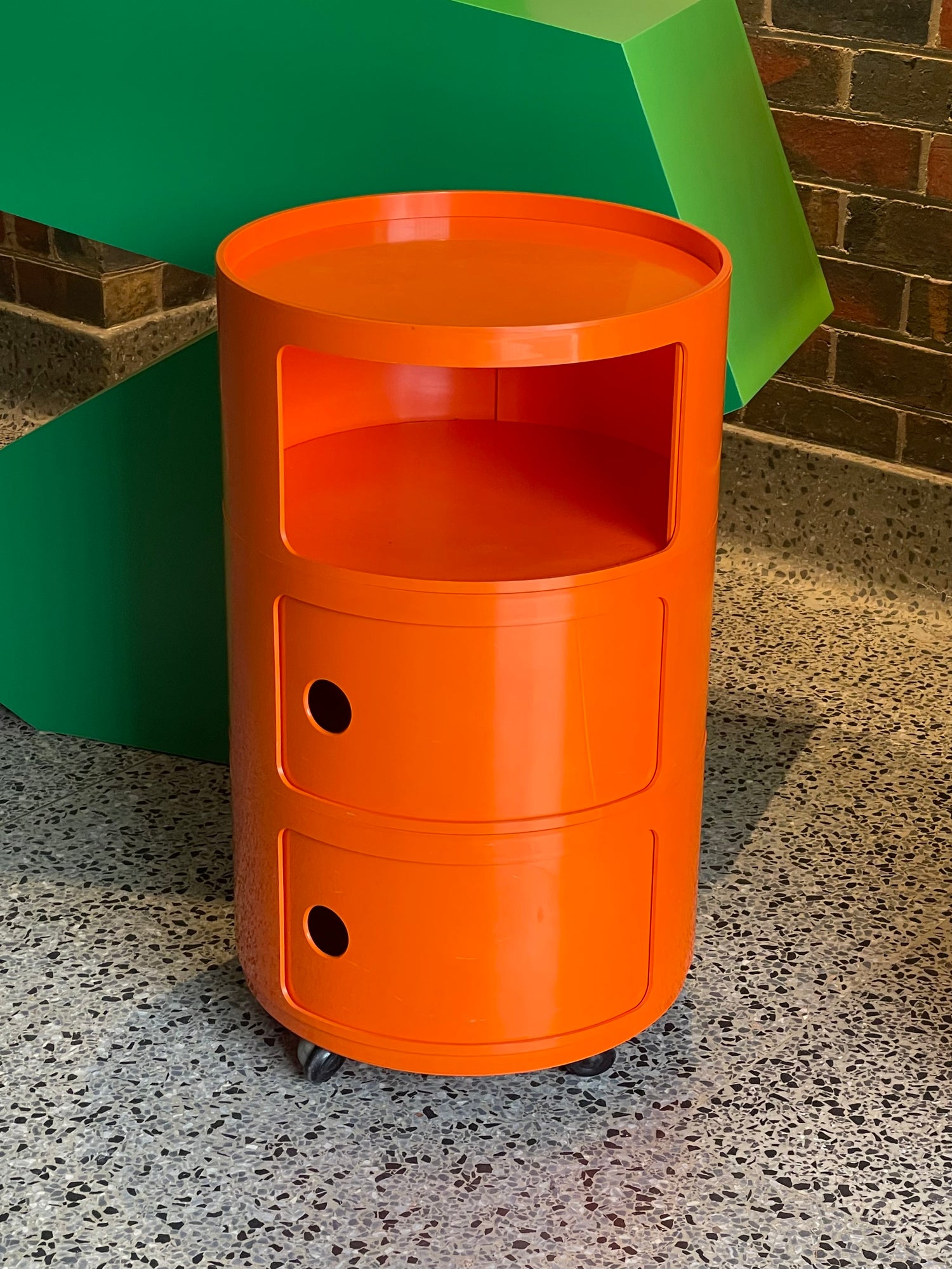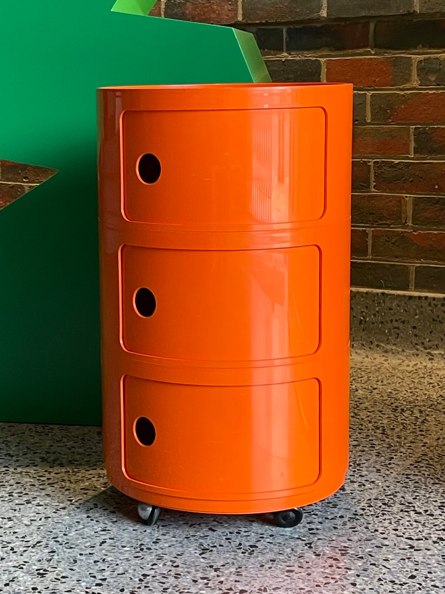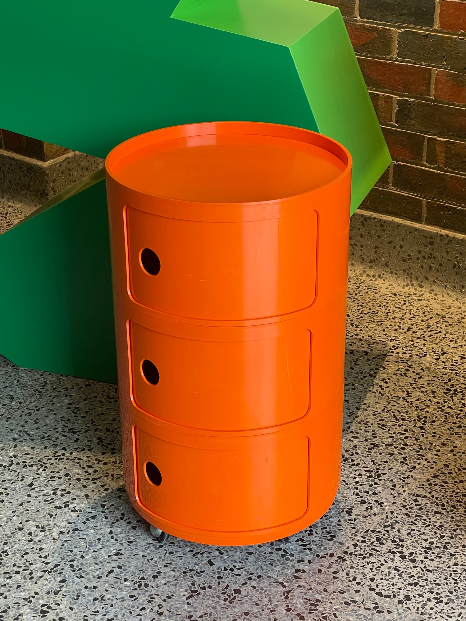 Componibili side table on castors, in orange, designed by Anna Castelli Ferrieri for Kartell. Consisting of 3 drawers stacked on top of one another.