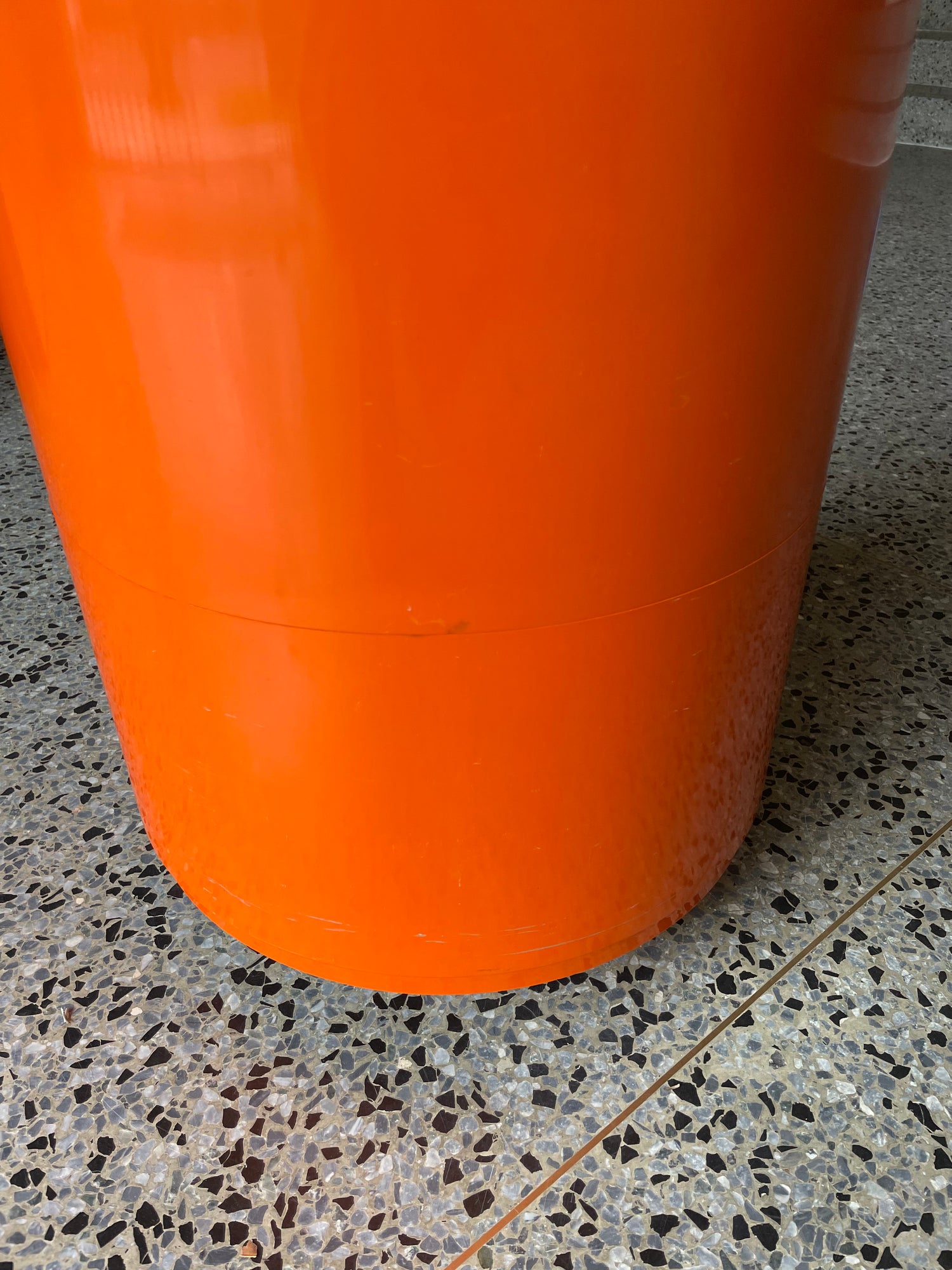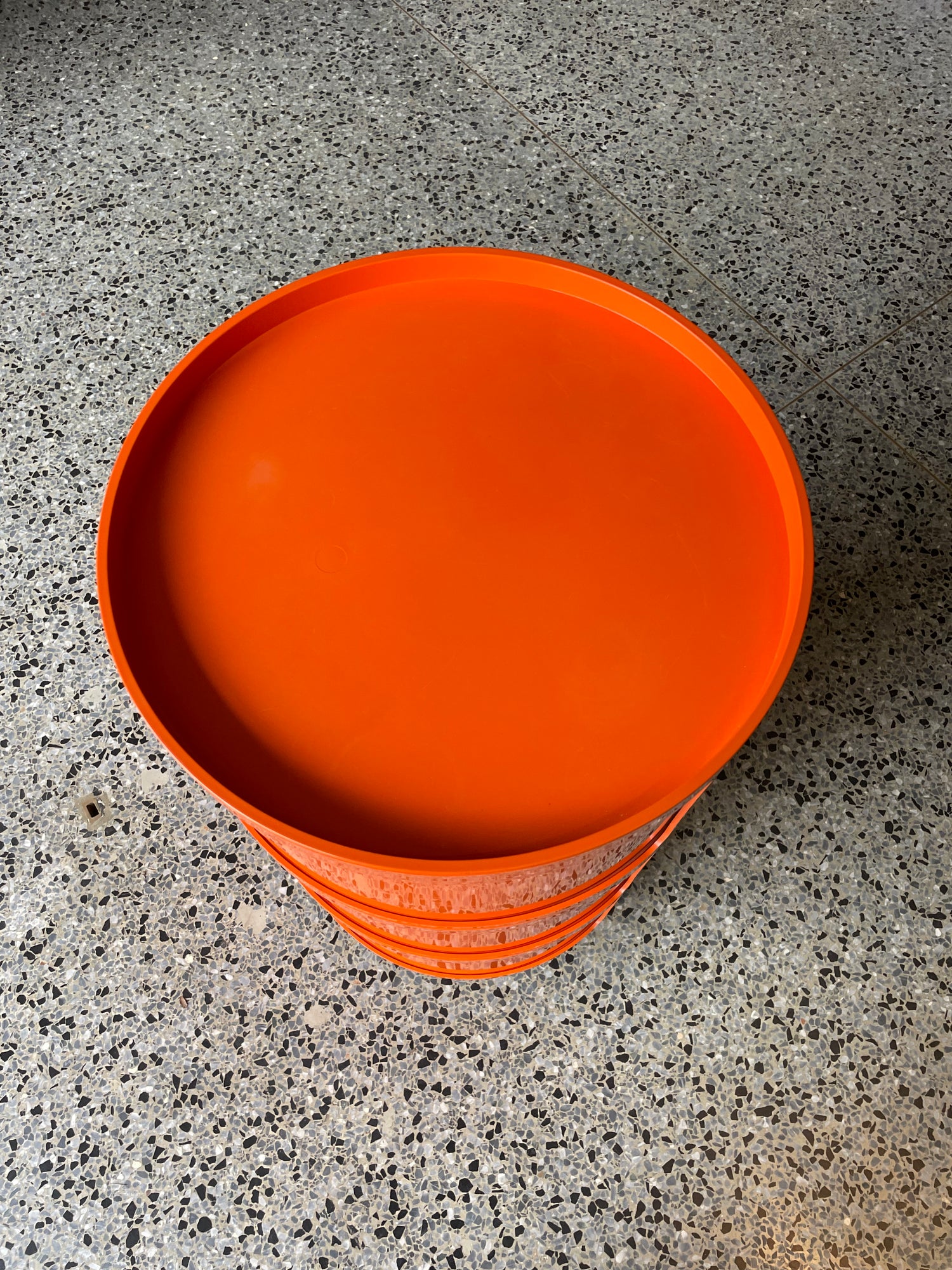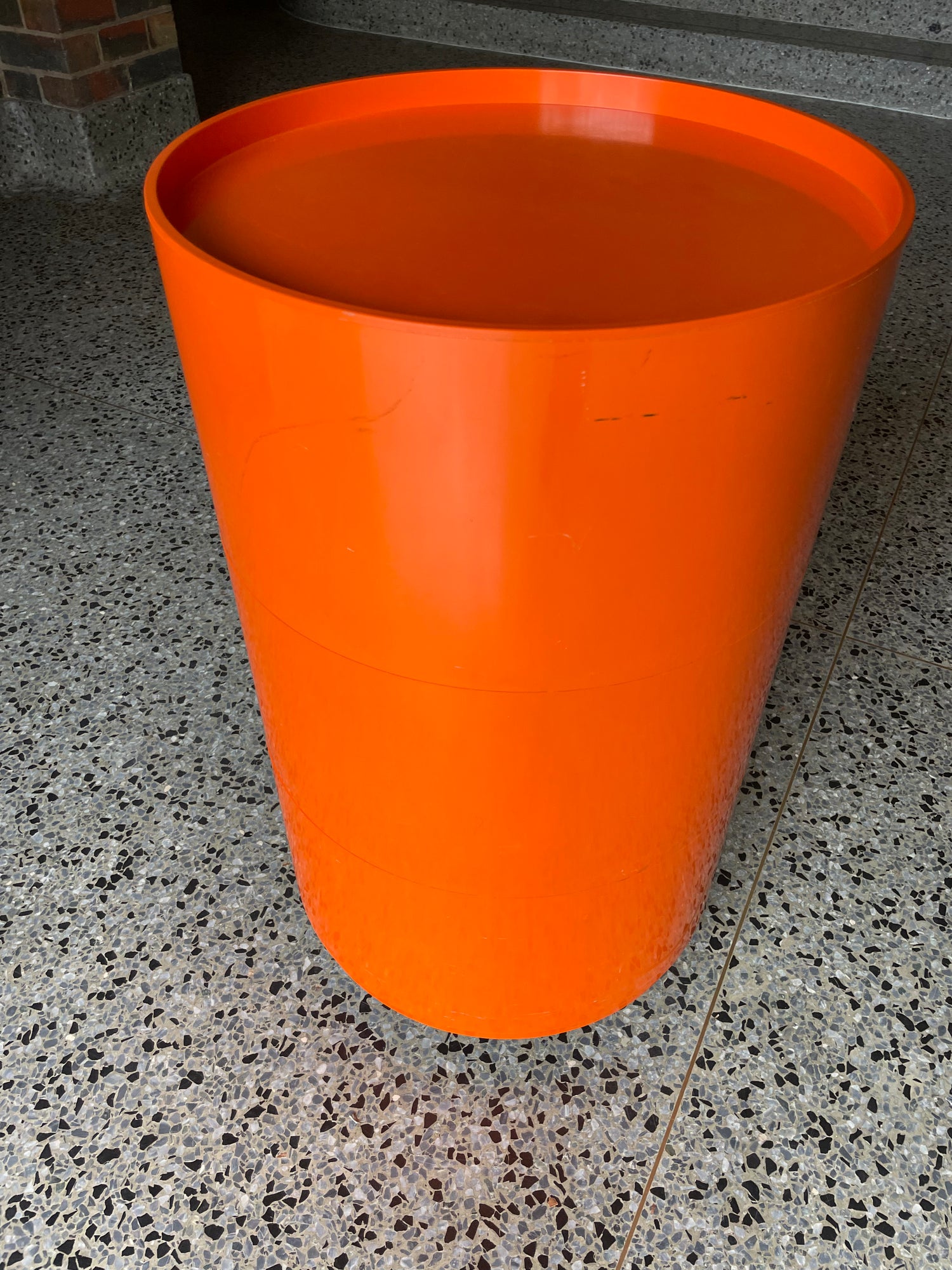 Componibili side table on castors, in orange, designed by Anna Castelli Ferrieri for Kartell. Consisting of 3 drawers stacked on top of one another.