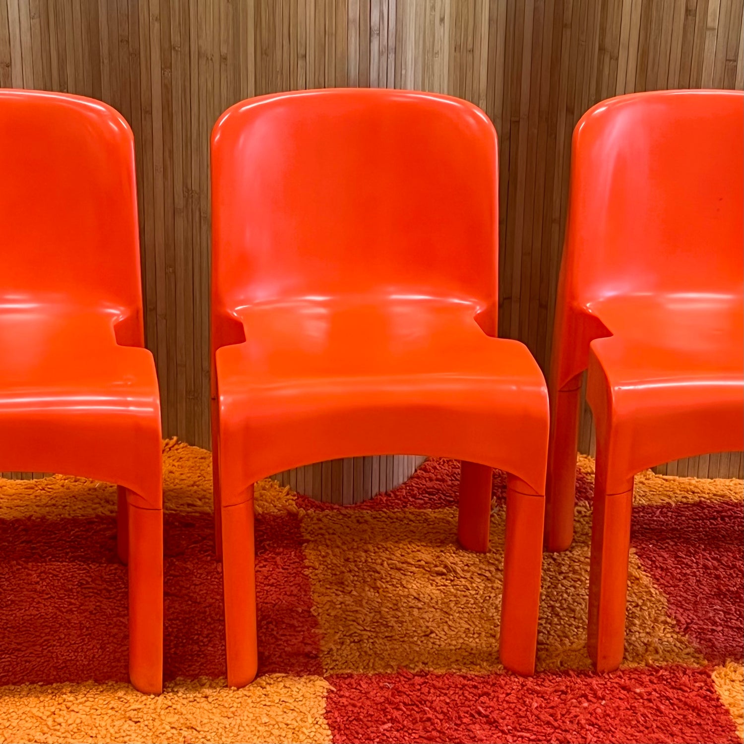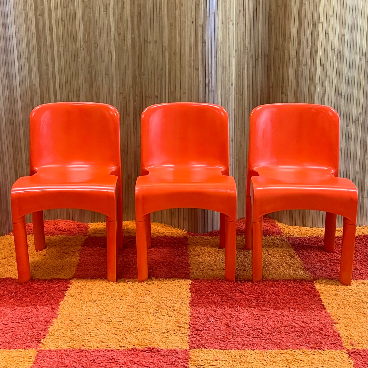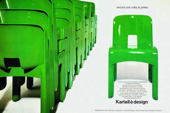The 'Universale' was the first all-plastic chair to be made by the injection-moulding technique. It was also one of the earliest plastic chairs to be commercially available. The Italian manufacturer, Kartell, was an innovative firm whose main production was plastic laboratory and industrial wares. They marketed the 'Universale' as a multi-functional chair that was stackable, portable, and suitable for both indoor and outdoor use. The design included detachable feet, which allowed the height of the chair to be adjusted.