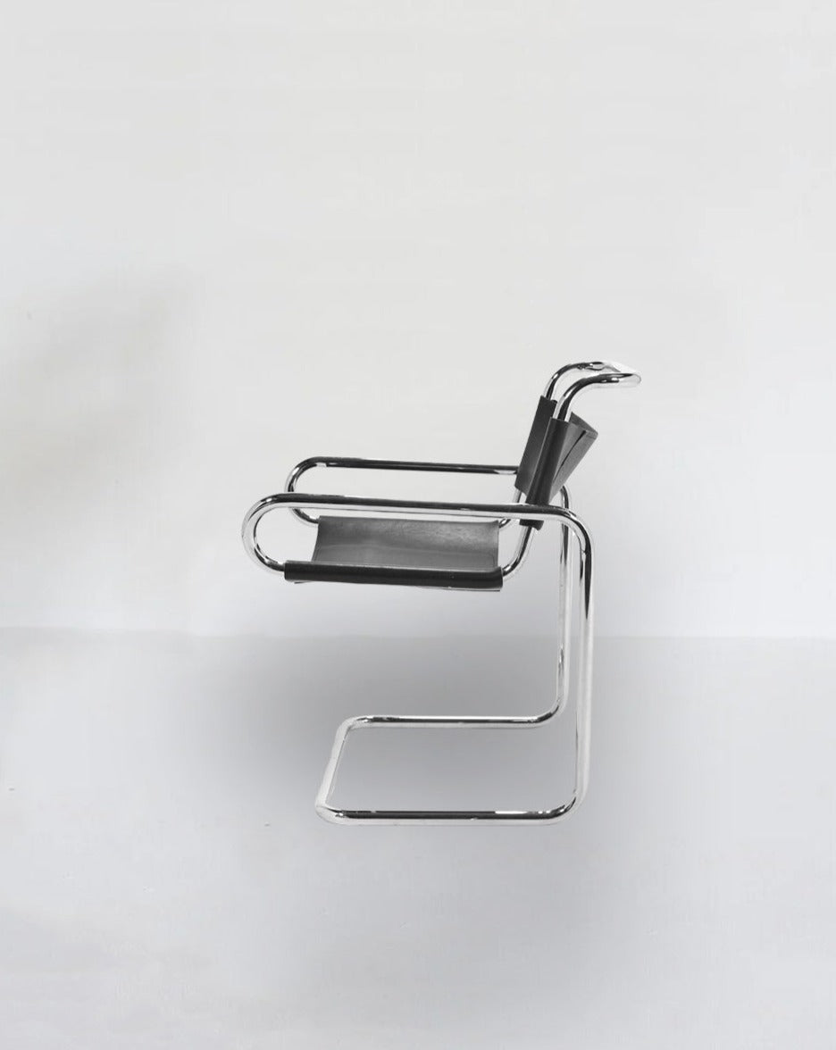 Rye's elegant version of the traditional cantilevered chair reverses the cantilever and creates an armrest for the sitter. The tubular frames support seats and backs of slung black saddle leather