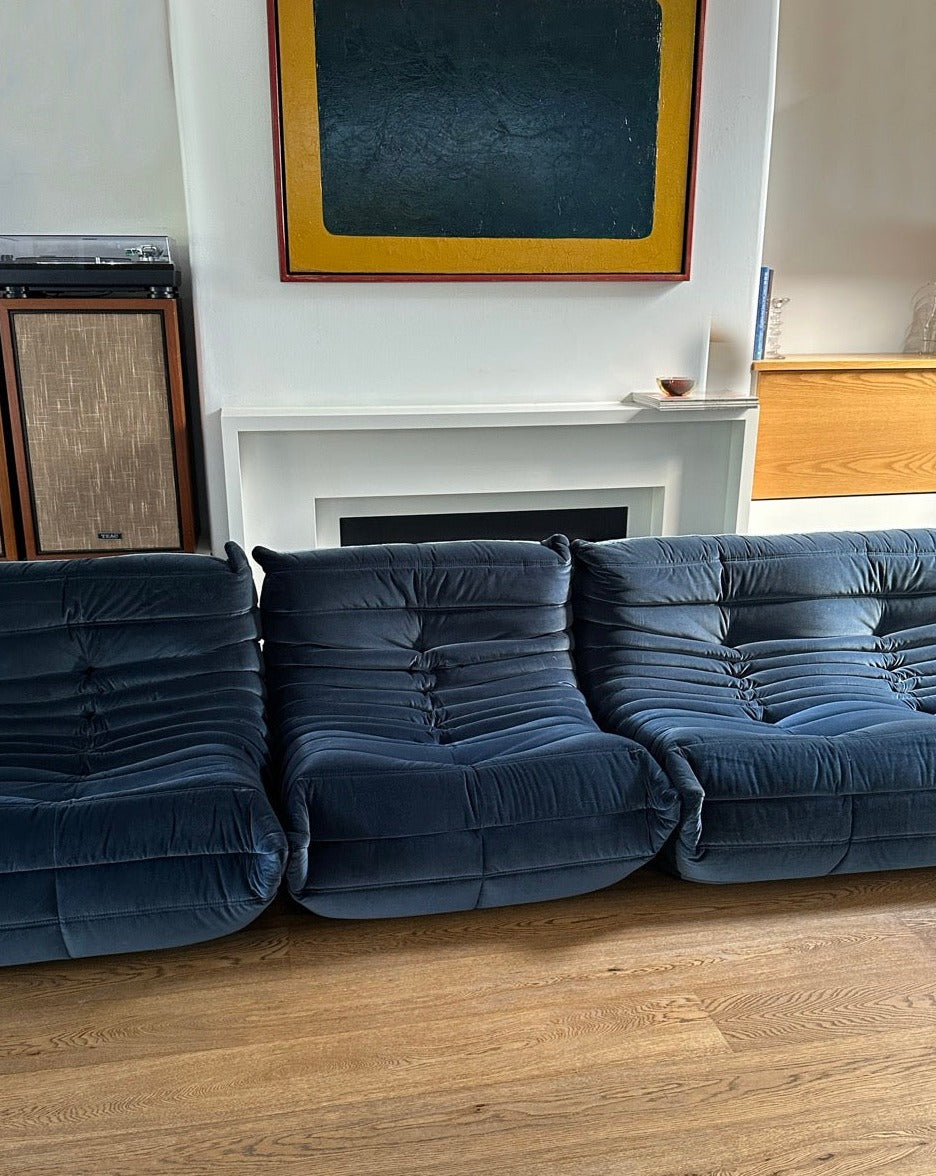 Dreamed up especially for afternoon siestas or lazy evenings spent in the greatest of comfort, the Togo sofa is a statement piece of furniture hand-made in France. The Togo is hand-sewn and features pleats of folded fabric. Its ergonomic design comprises multiple density foam constructions and quilted covers, making each piece both visually attractive and physically inviting.