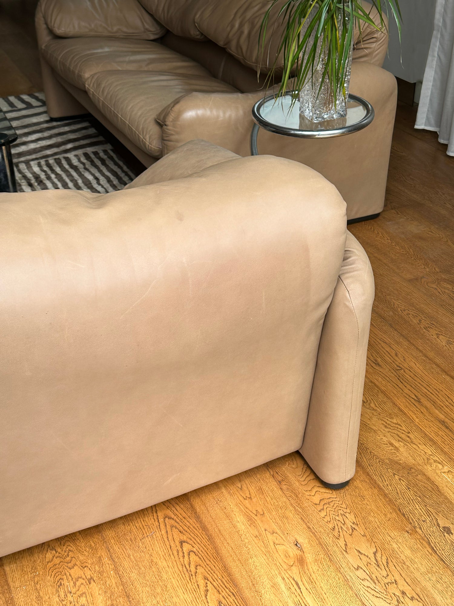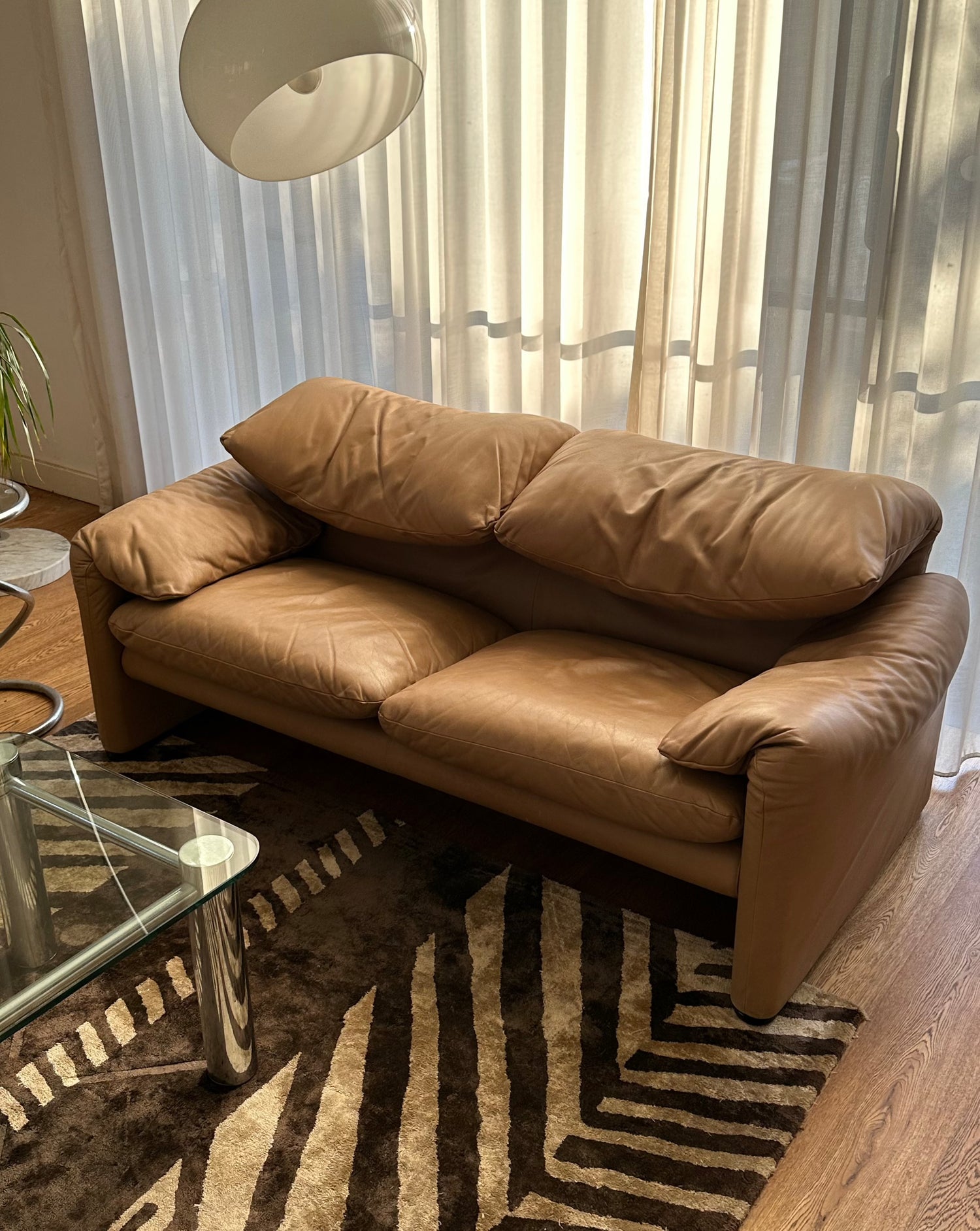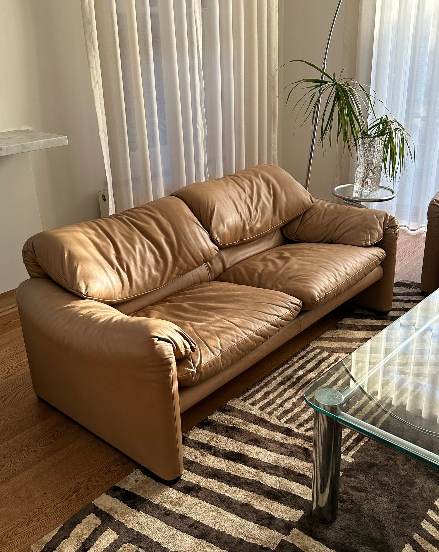 Two seater Maralunga sofa in a buttery soft pale tan leather.