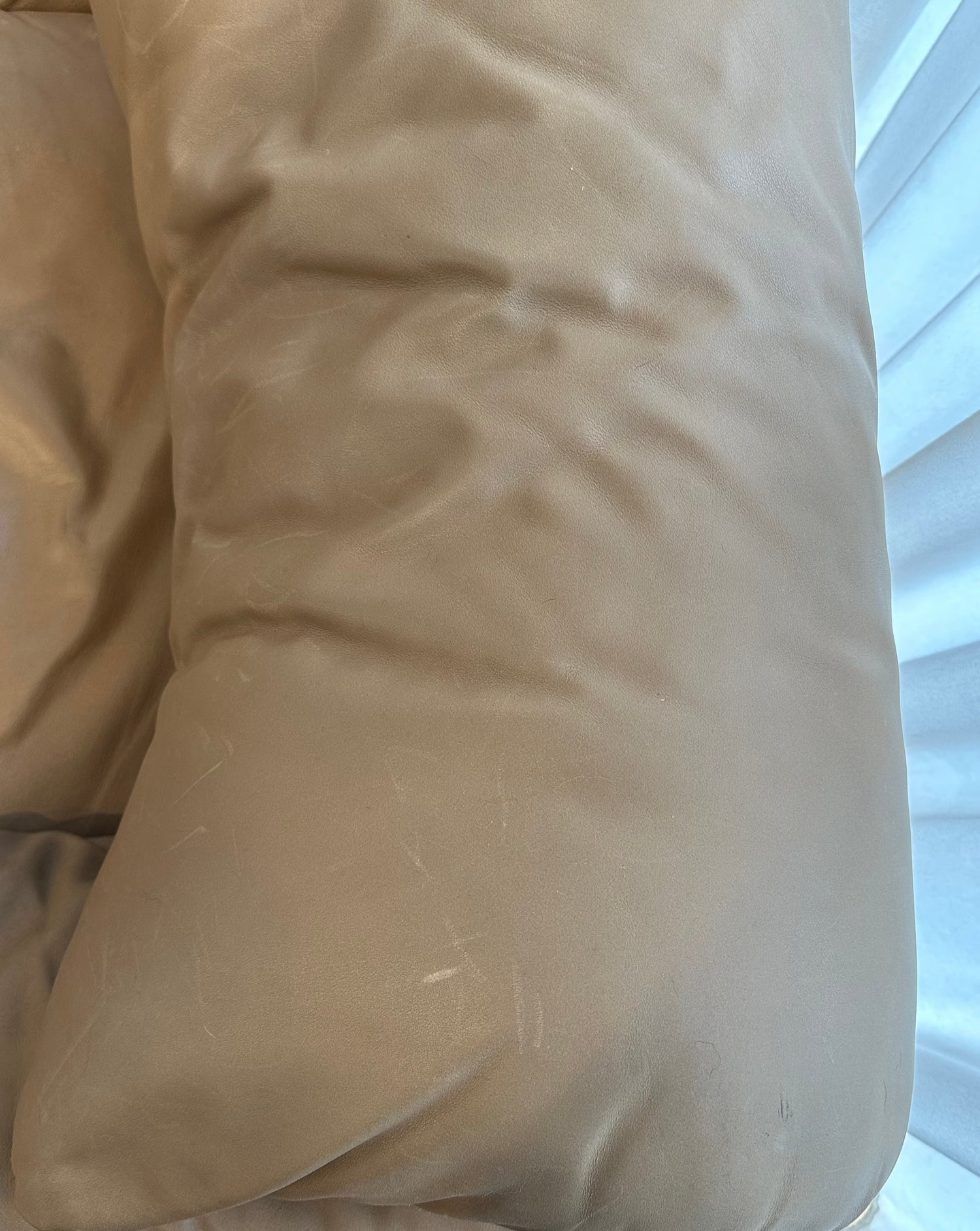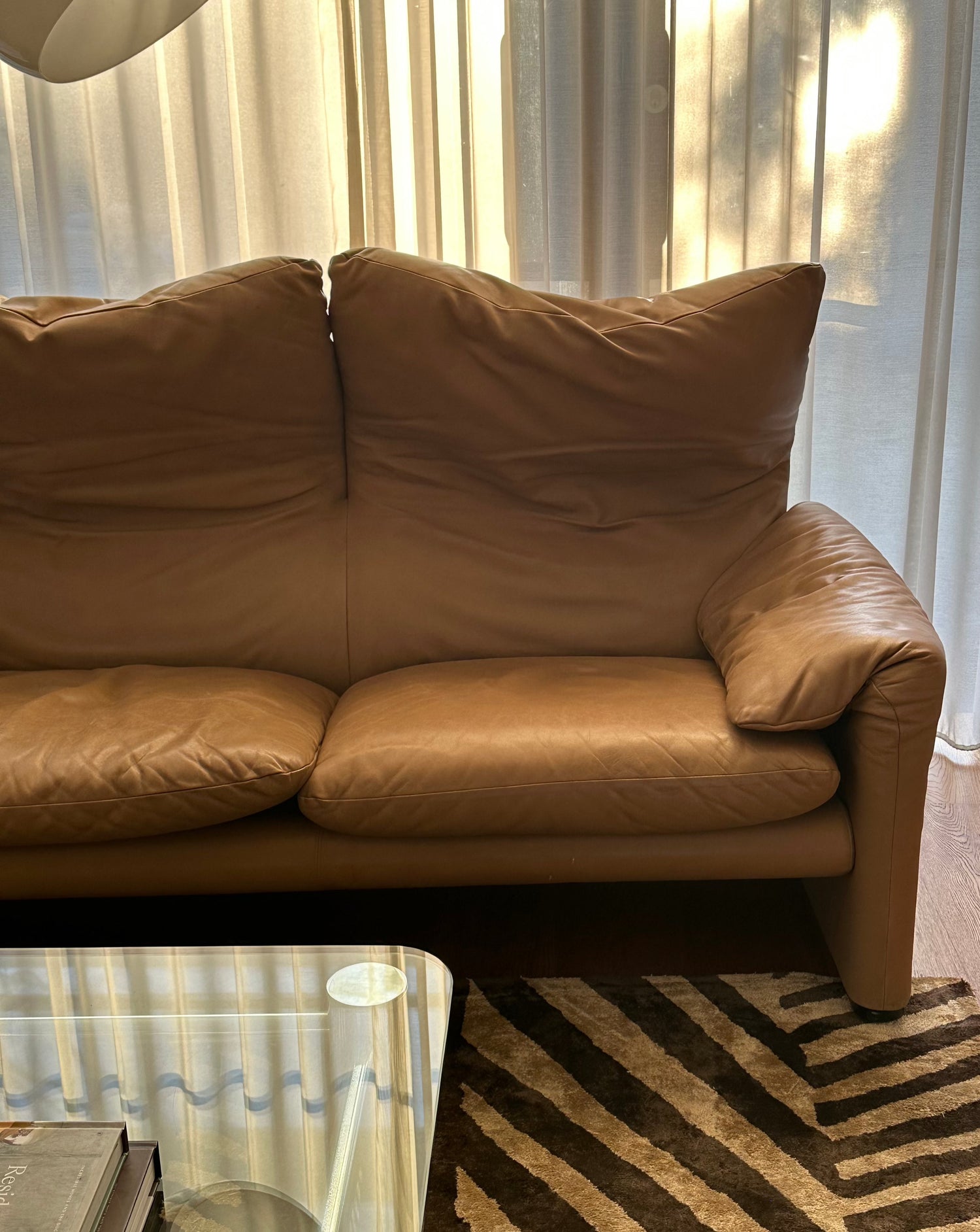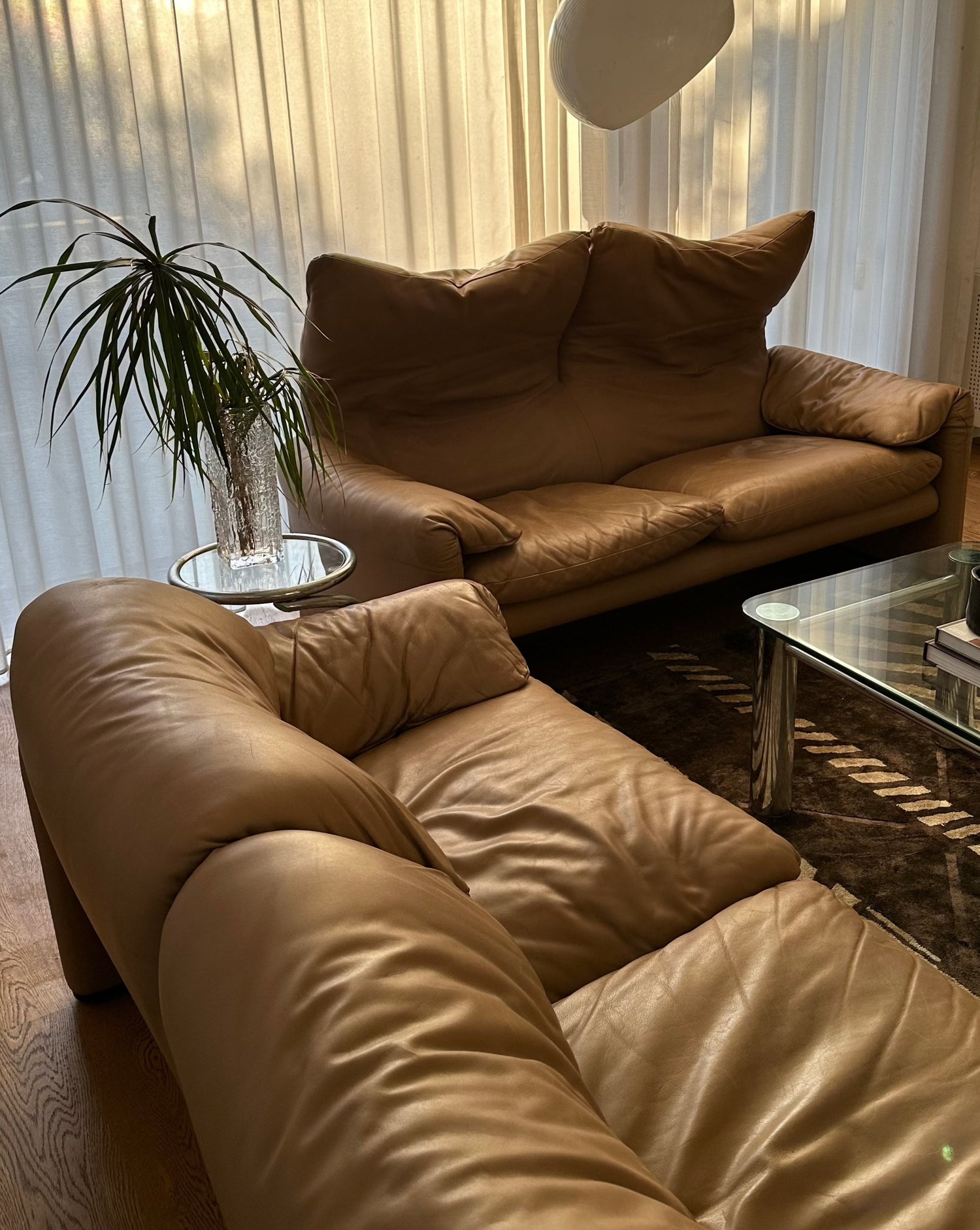 Two seater Maralunga sofa in a buttery soft pale tan leather.