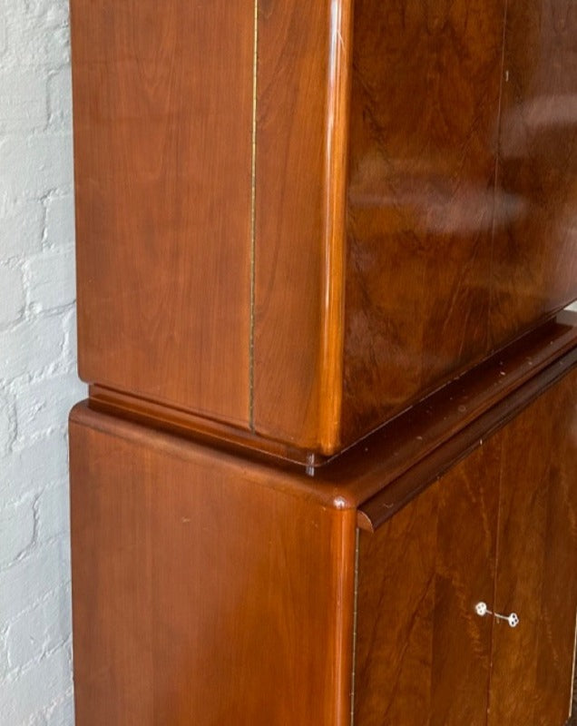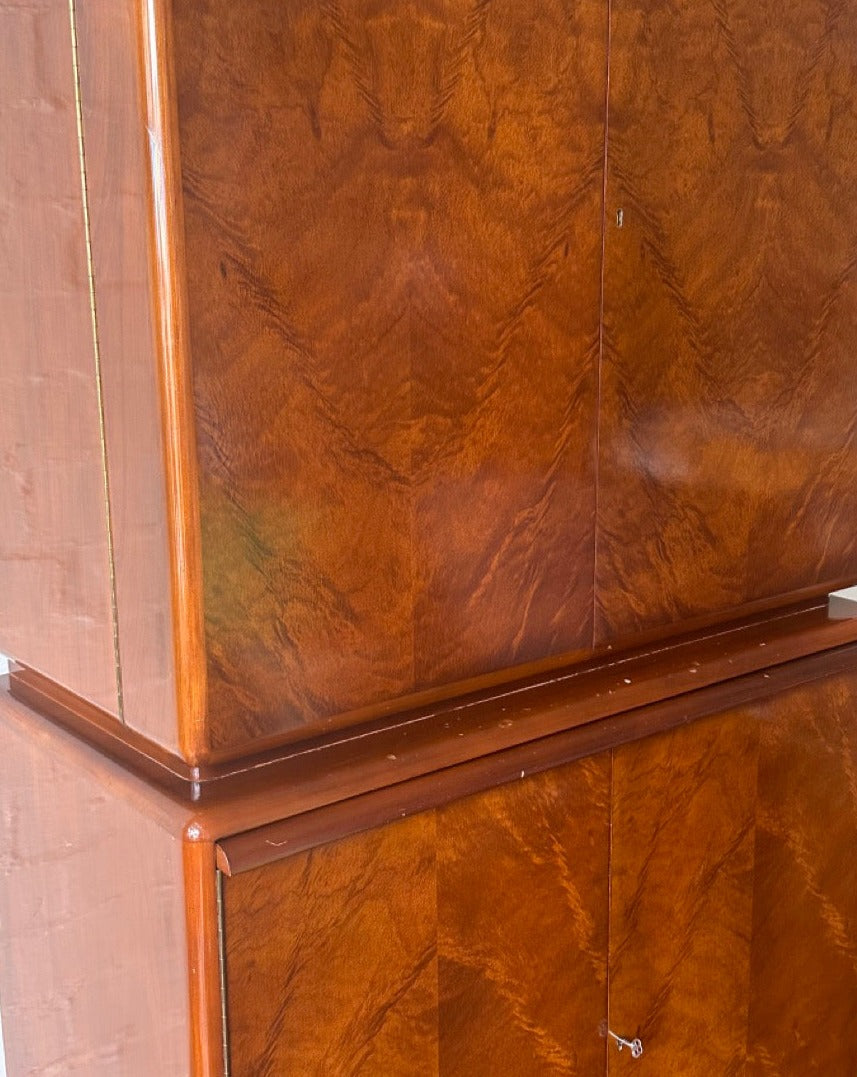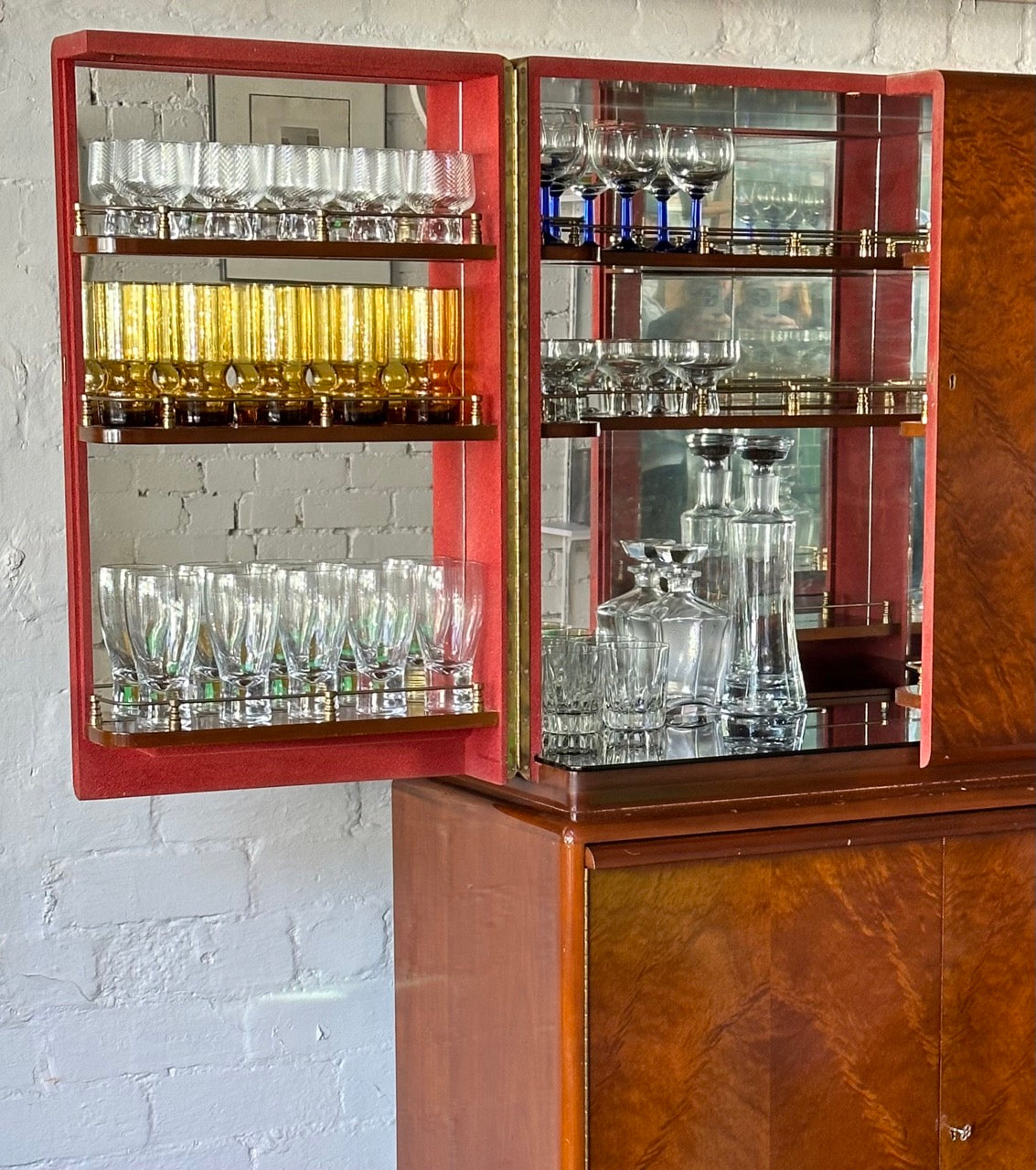 There is a slide out shelf for mixing cocktails and the upper section steps in slightly from the base section. There is enough space in the lower section to fit wine and other spirits. A beautiful design with great attention to fine detail.