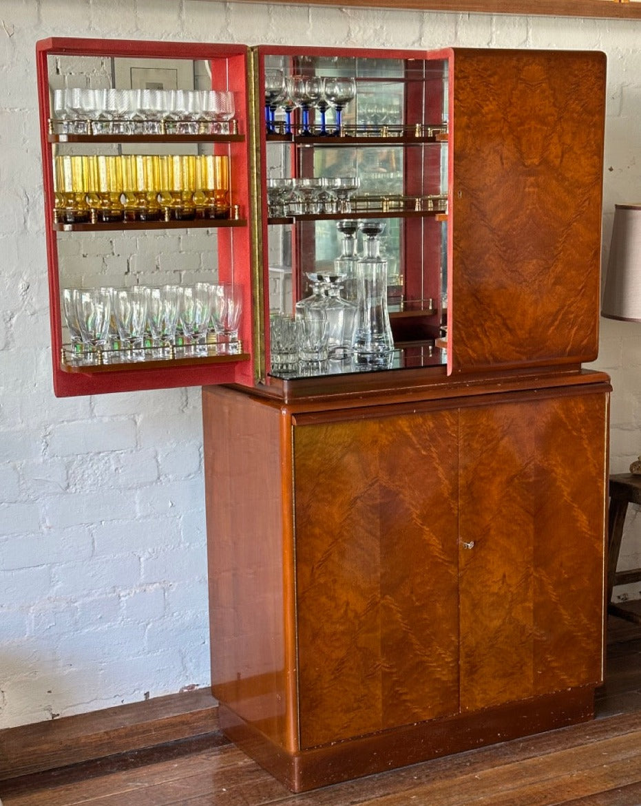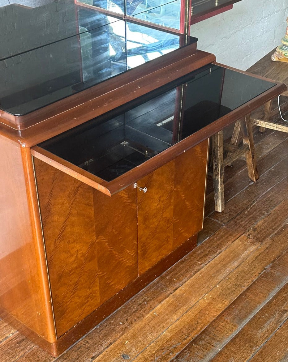Fully mirrored internally with backed black glass to the upper level and the slide out shelf and brass hinges and locks.