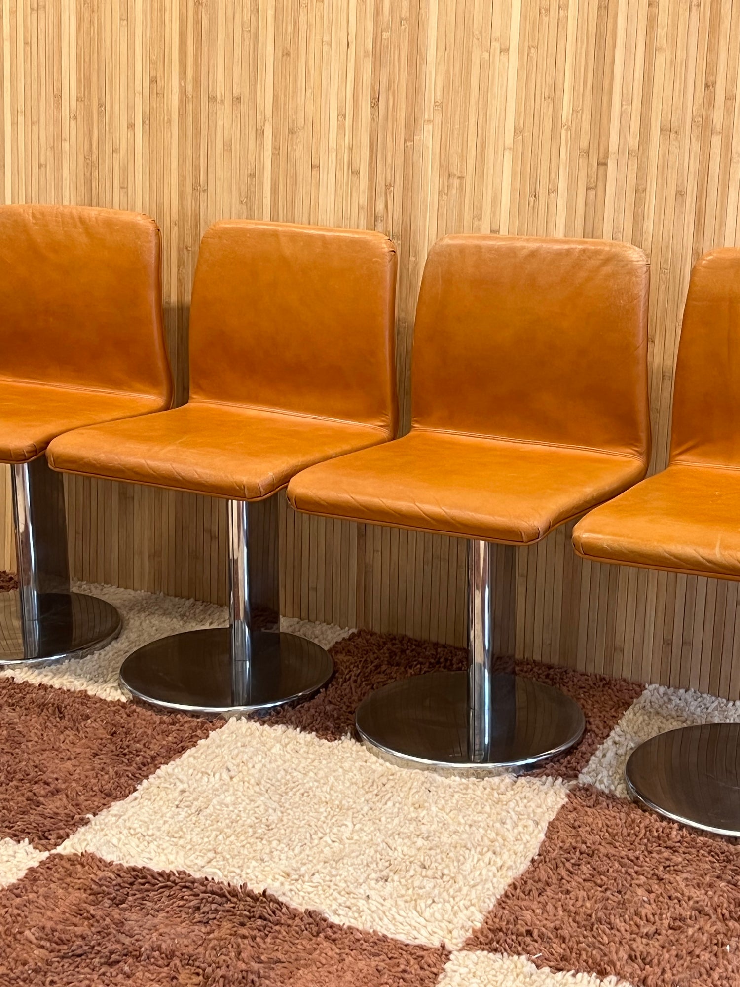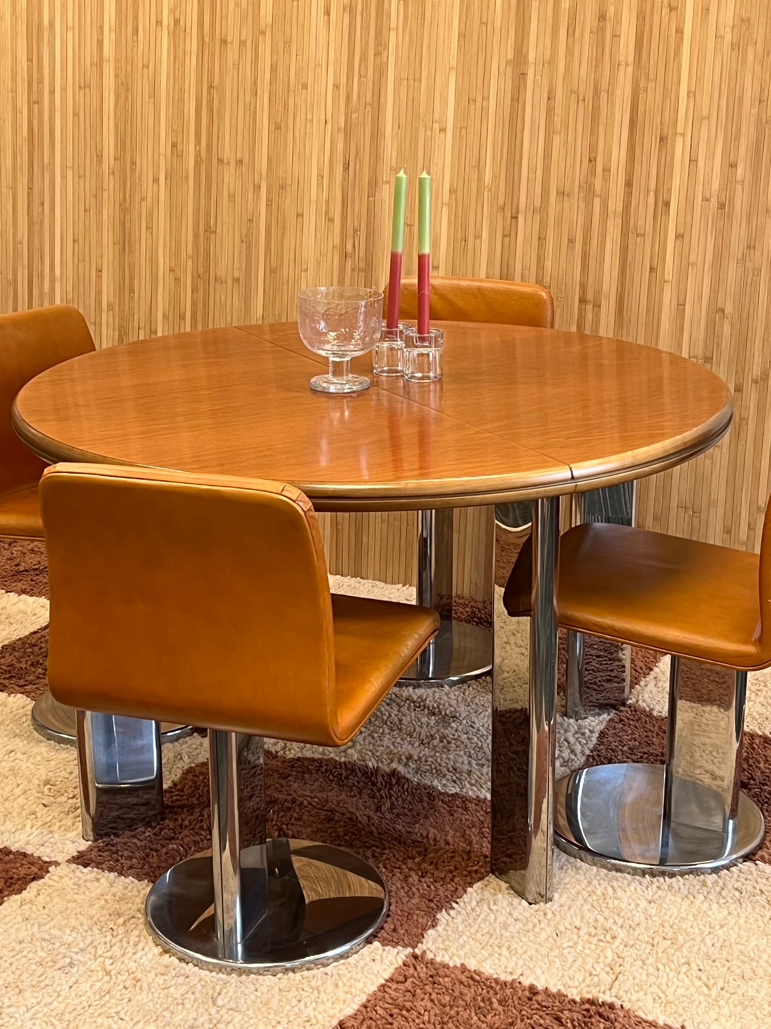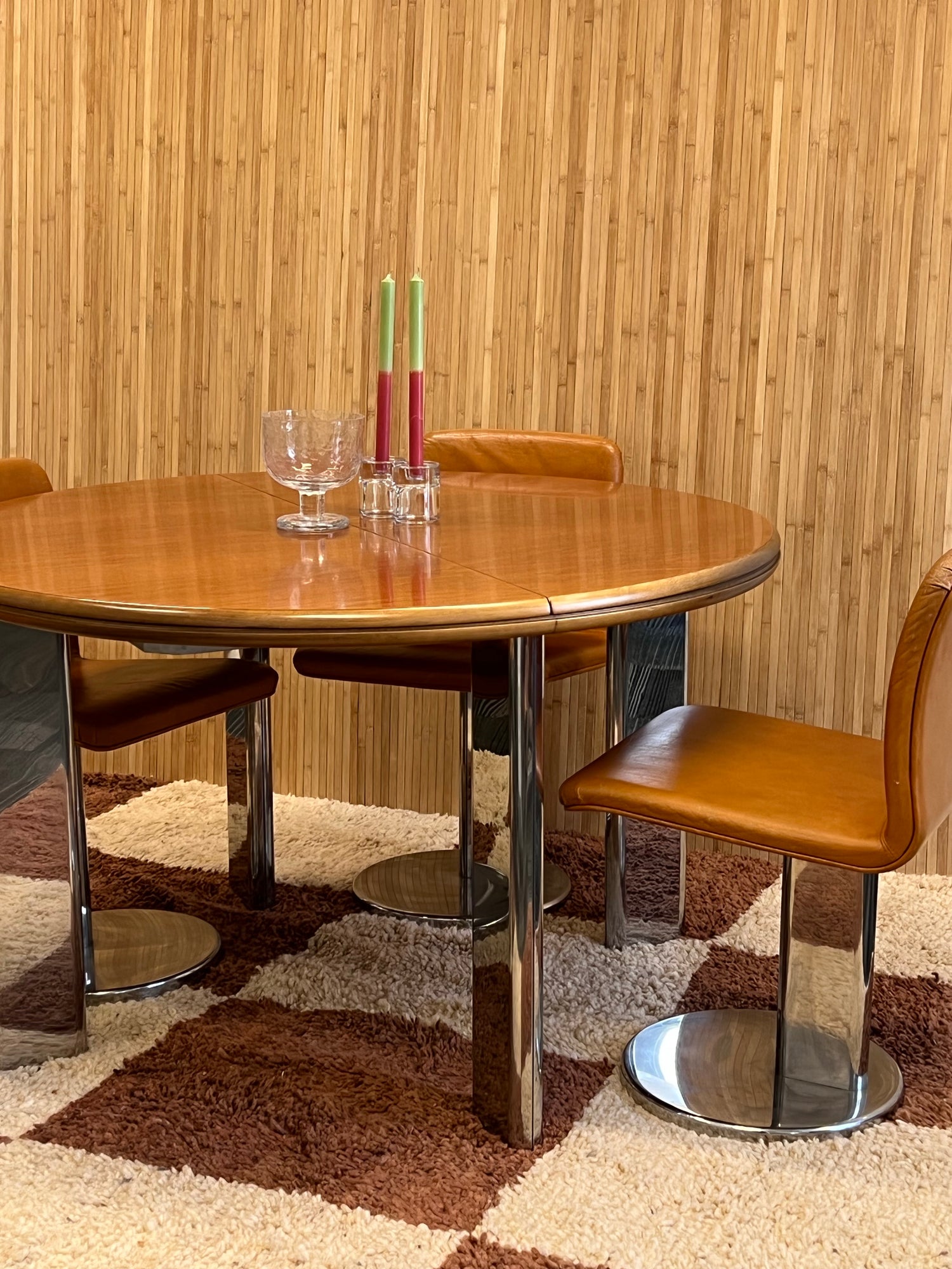 The chairs have an amazing pedestal chrome base and comfortable leather seats. The table has a stunning wooden top and chrome legs to match the bases of the 4 dining chairs. Similar look to Milo Baughman chunky chrome legged furniture.