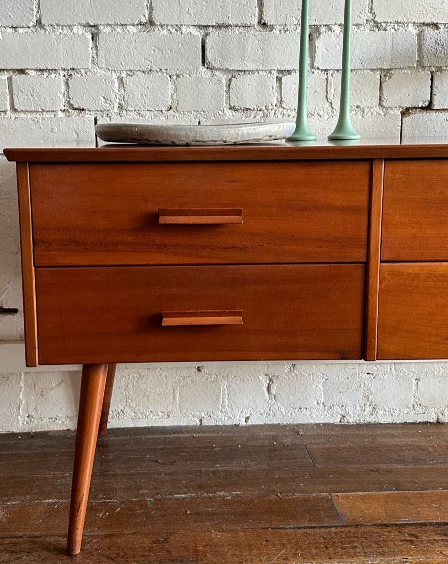 Beautiful vintage teak dresser with splayed, tapered legs, 4 doors and solid handles. Great storage space and drawers open smoothly.