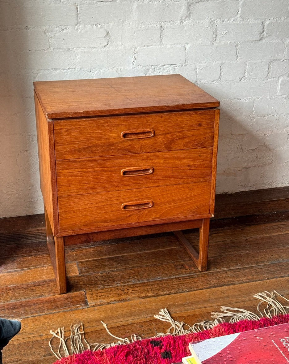 Good condition, some fading and marks to the top of the drawers consistent with age. Does not affect overall aesthetic. Drawers slide smoothly.