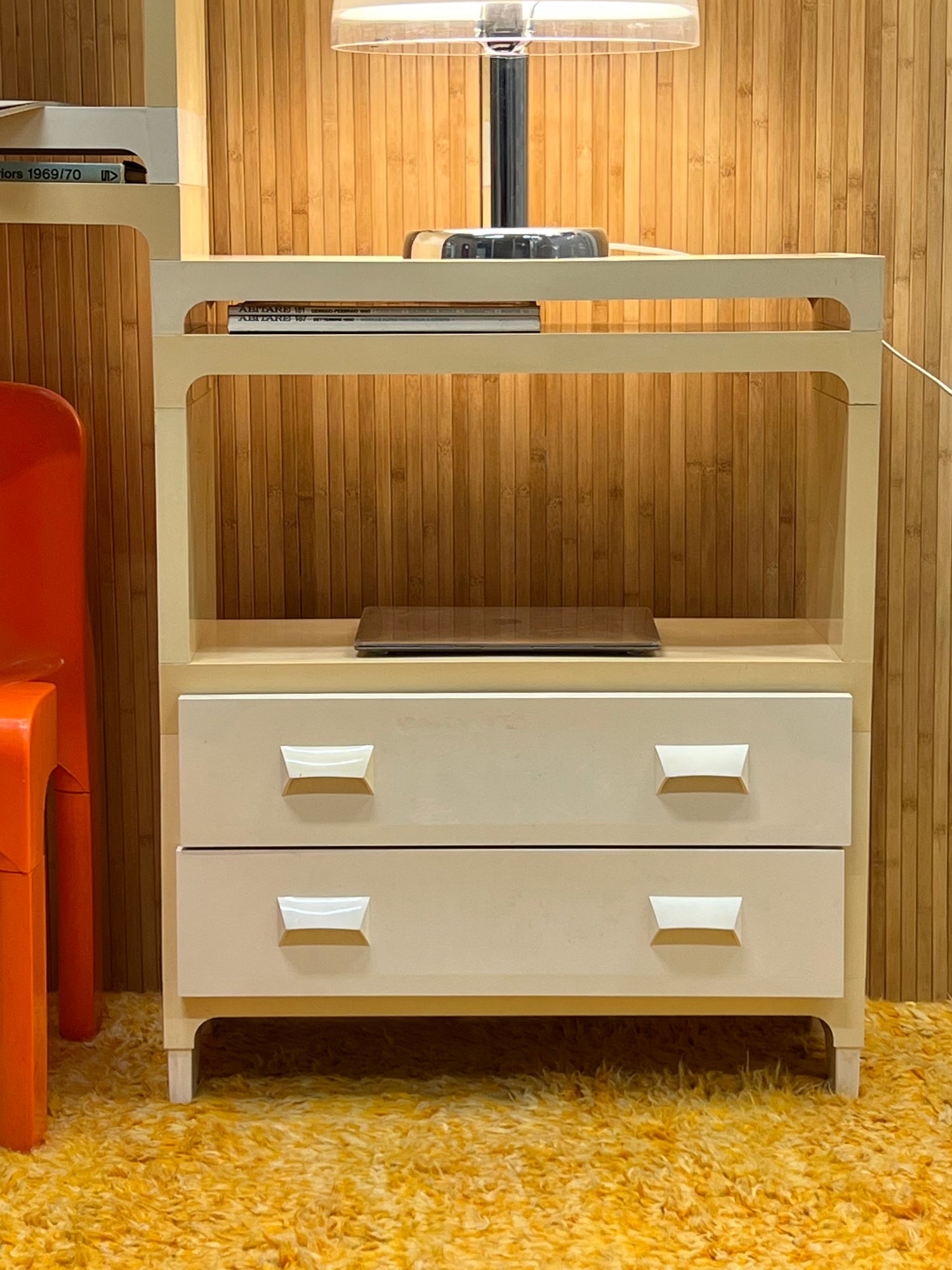 The unit consists of 9 shelves and two sets of drawers in ivory. It has 6 large divider risers between each shelf to allow for different height positions.
