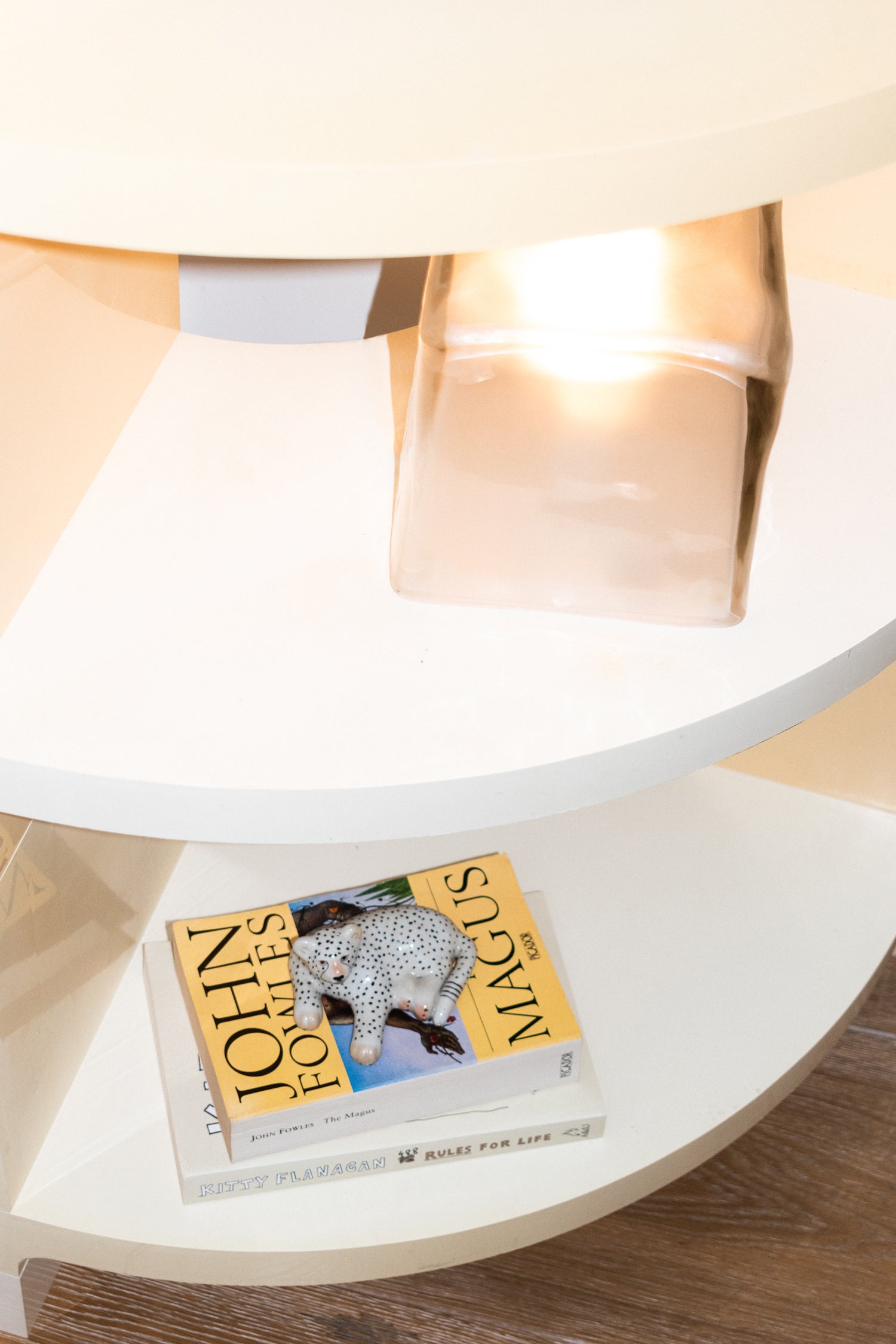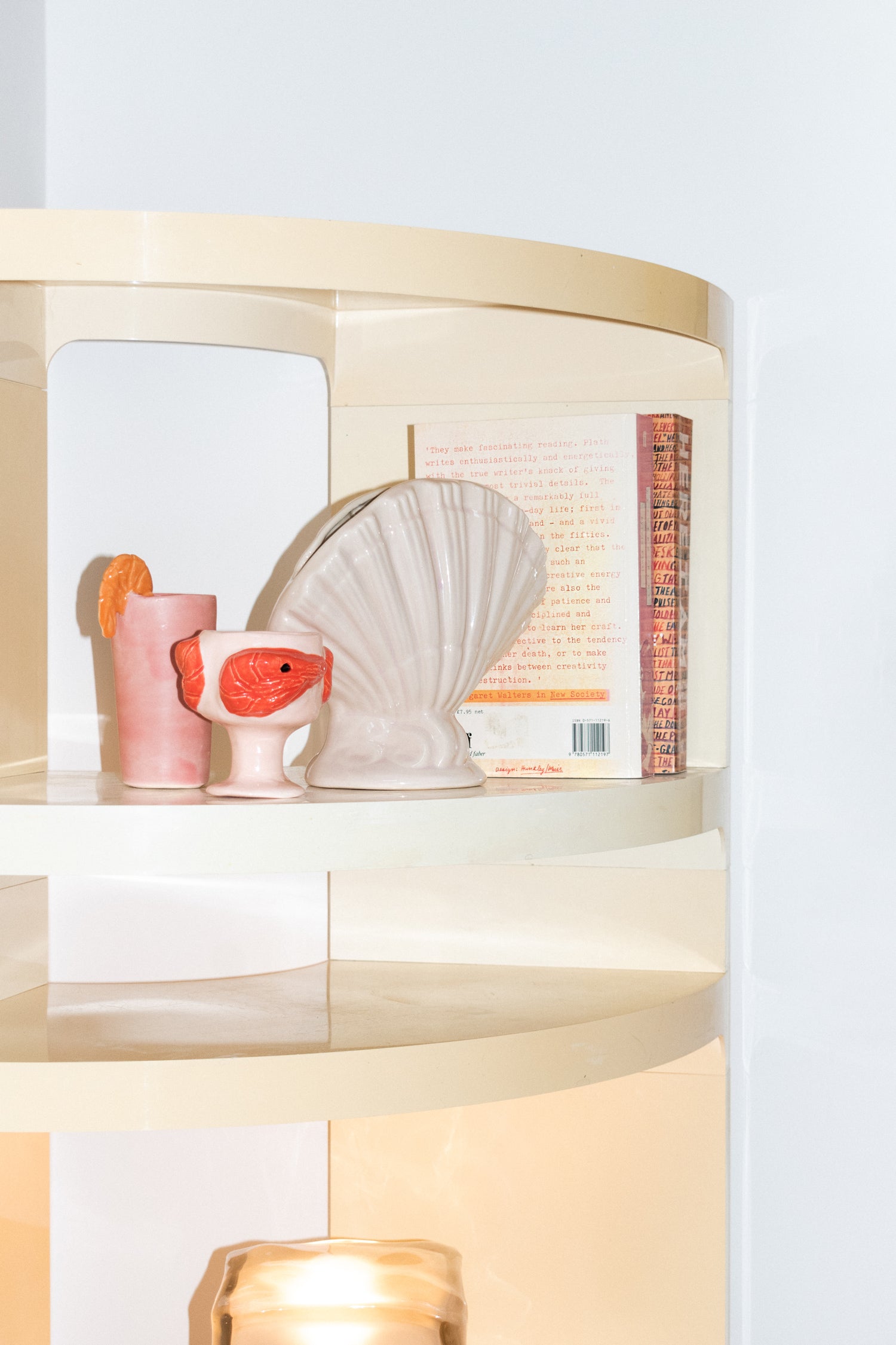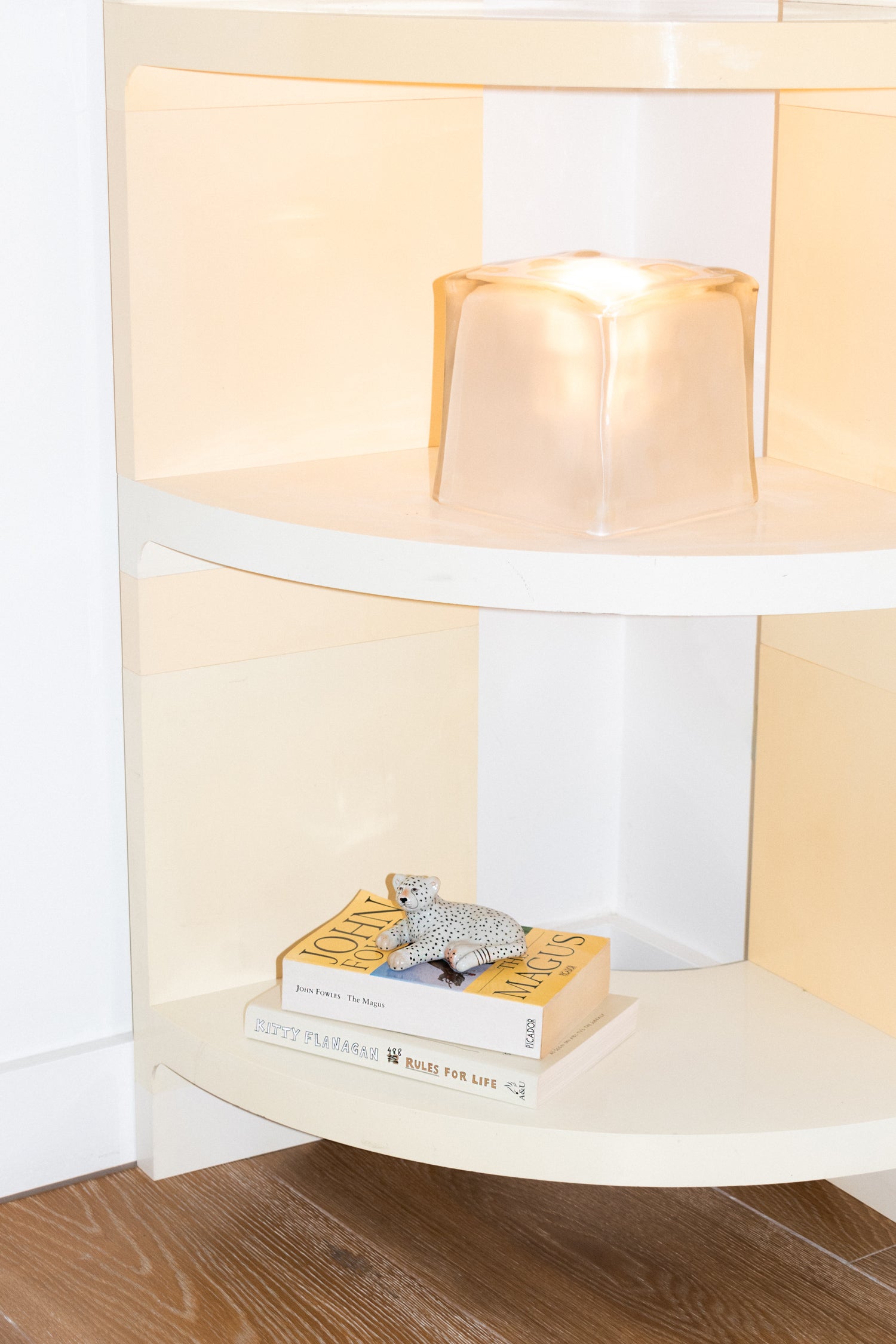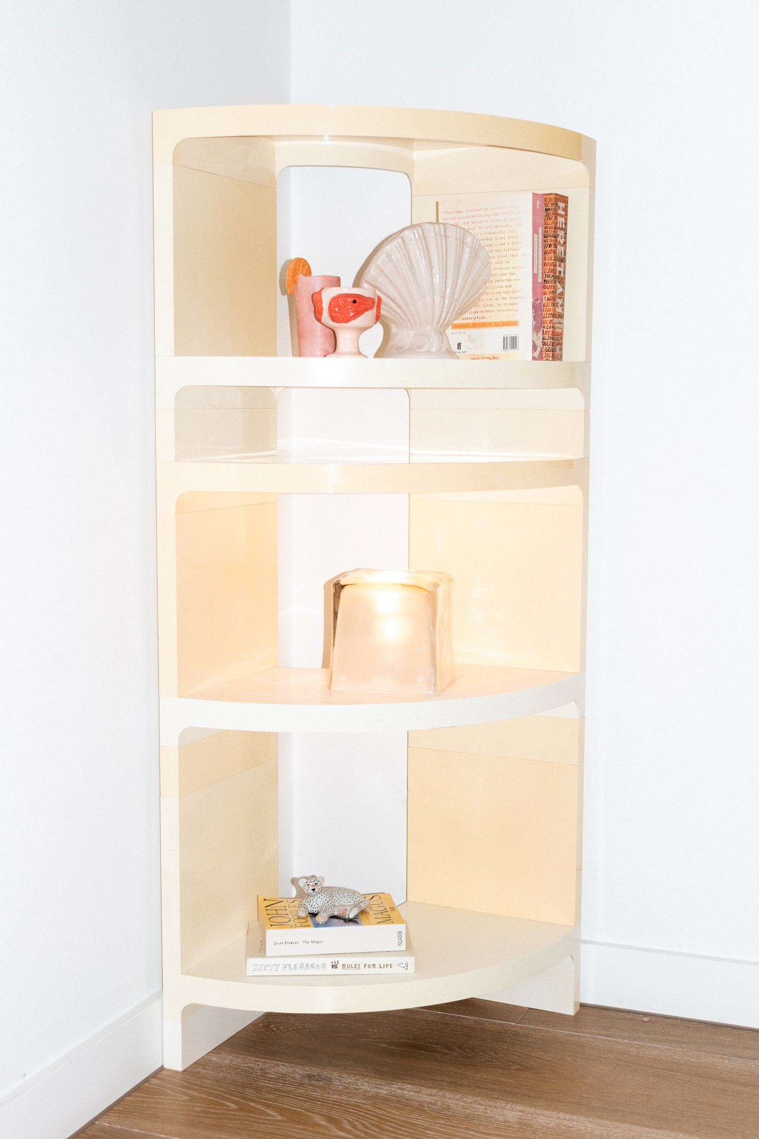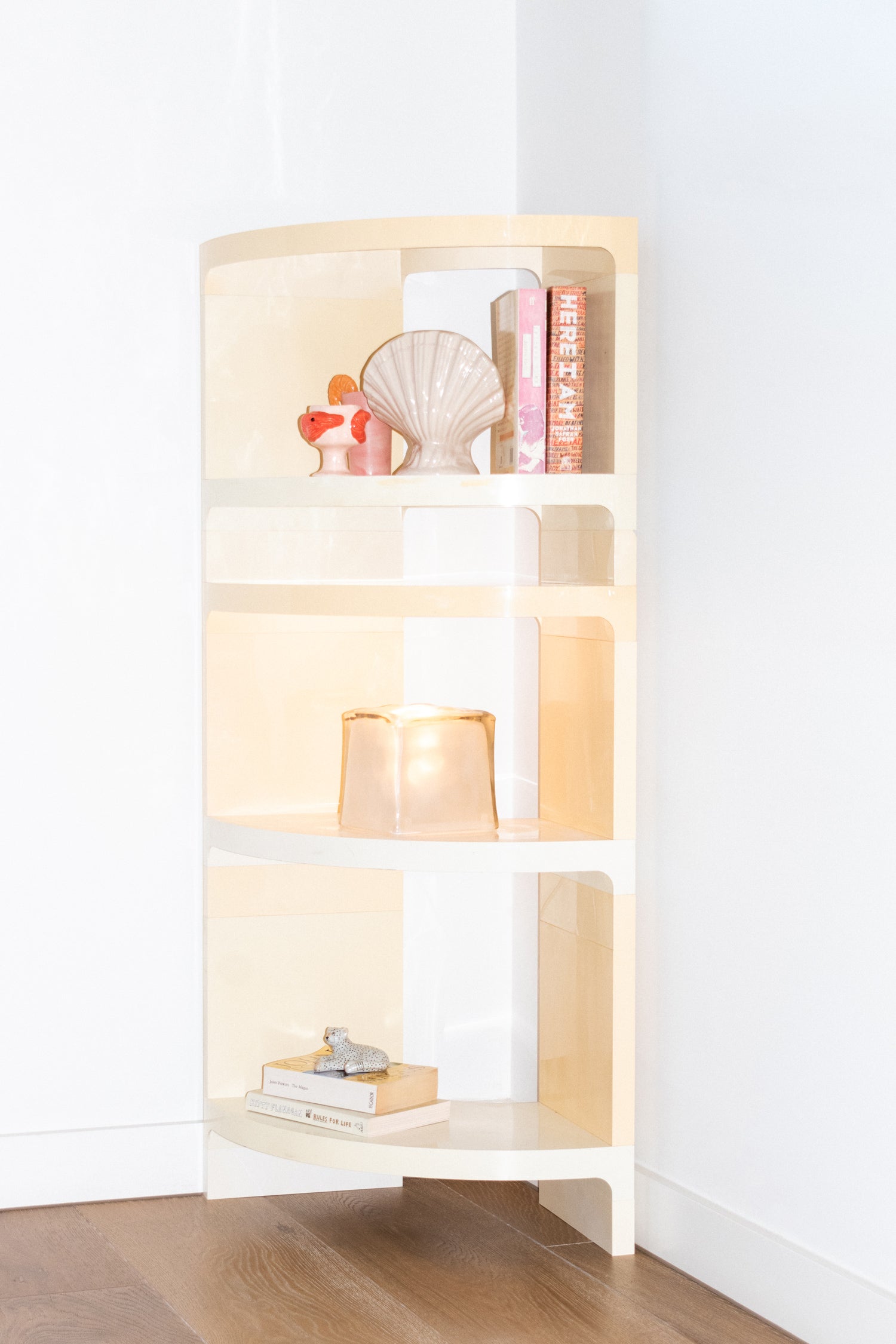 This corner unit consists of 5 shelves in ivory. It has a range of small and large divider risers between each shelf to allow for different height positions.