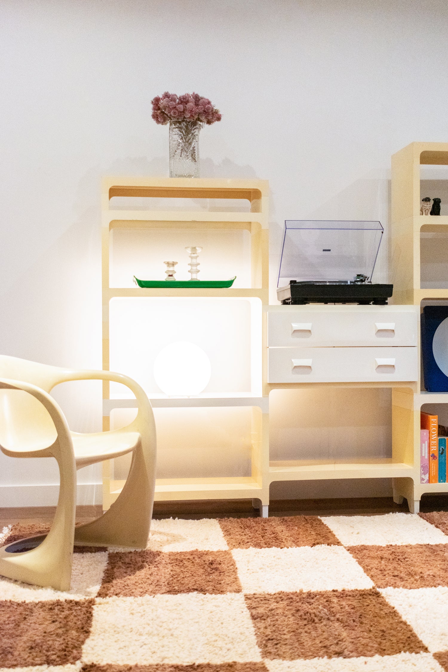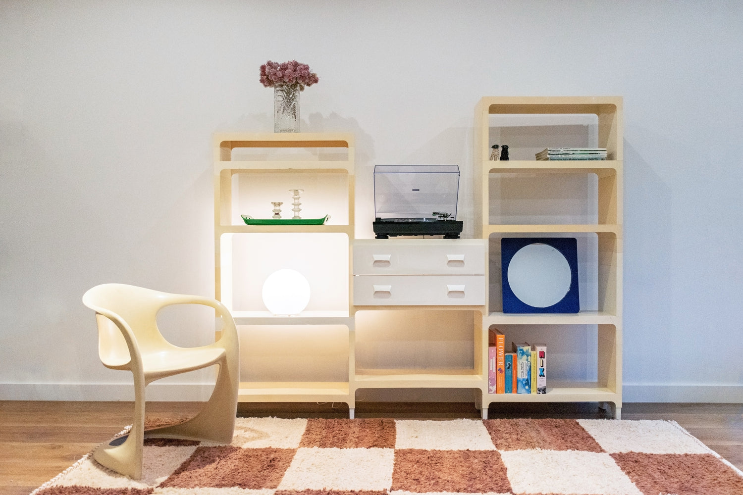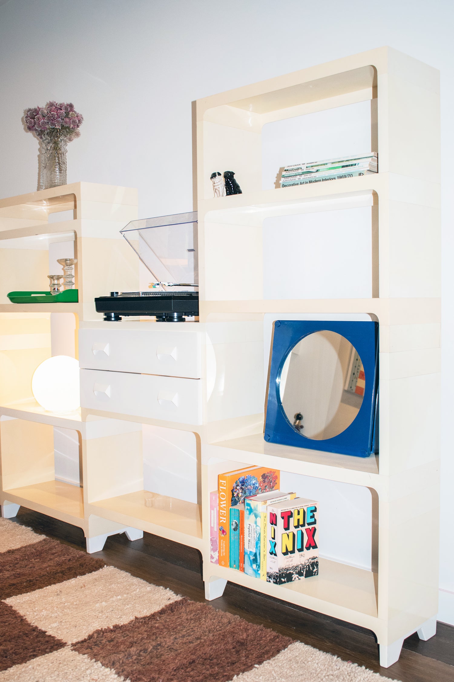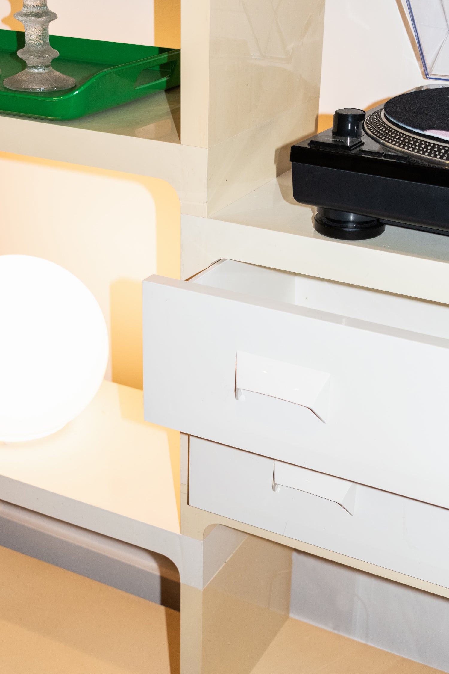 The unit consists of 12 shelves and two drawers in ivory . It has a range of small and large divider risers between each shelf to allow for different height positions.