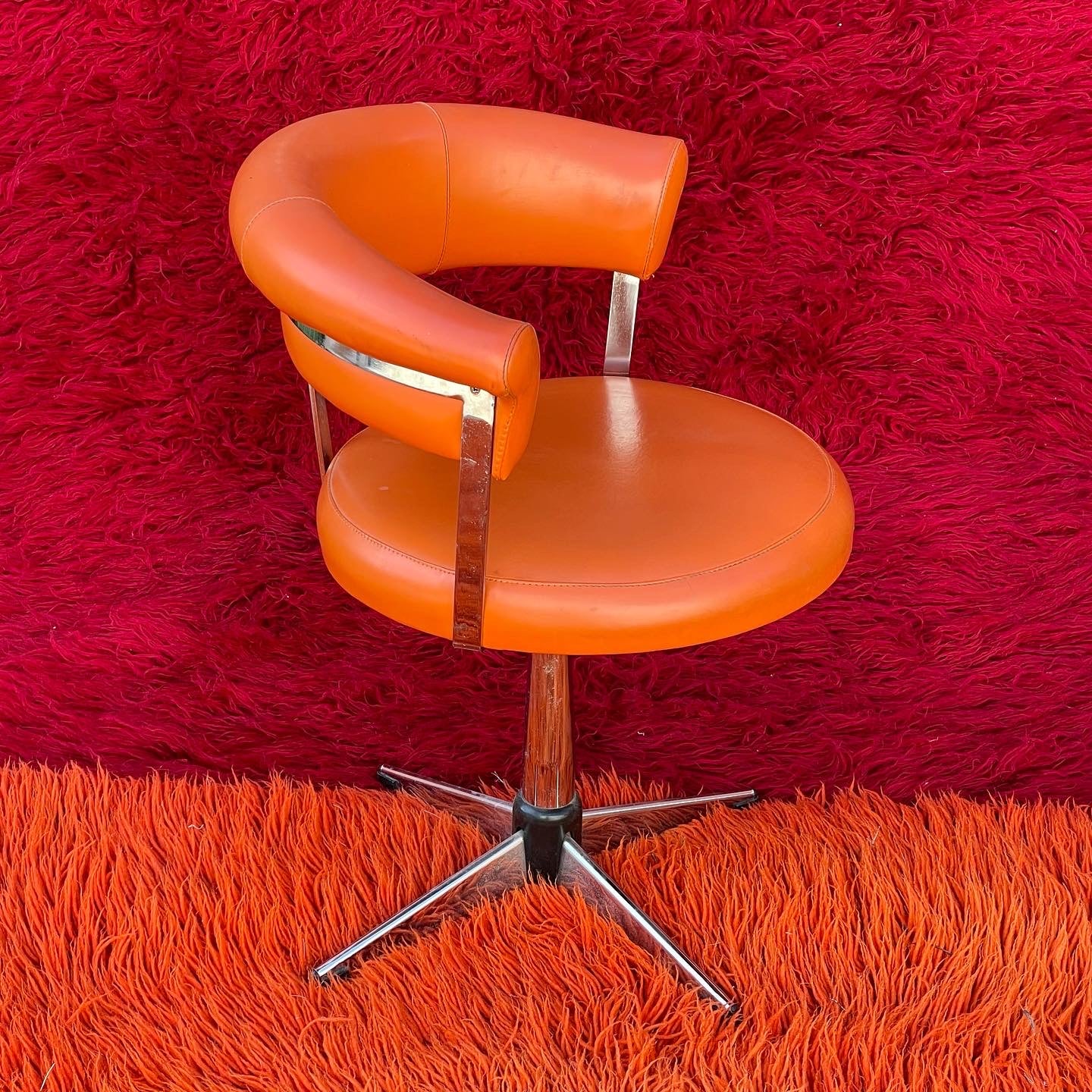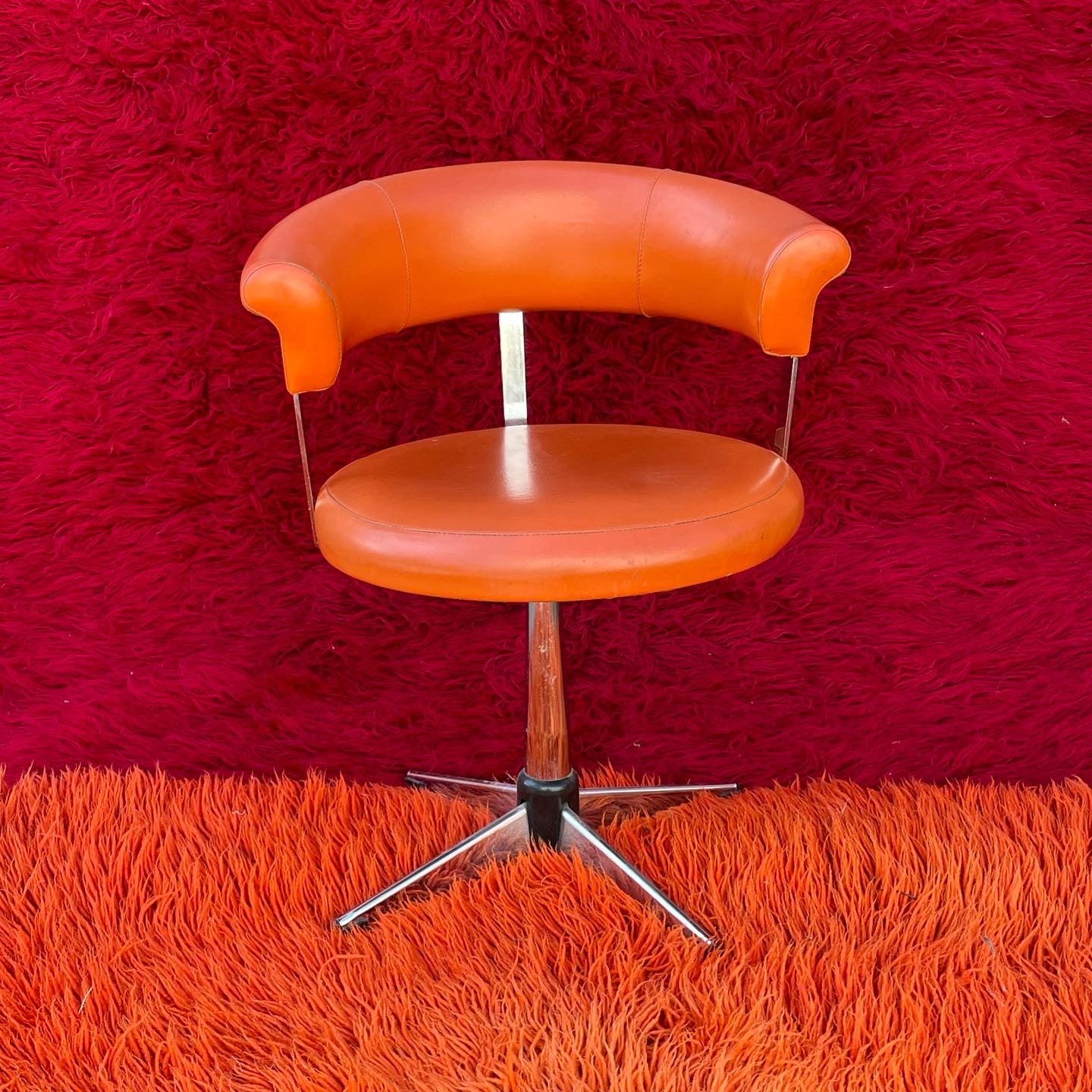 Mid Century Swivel Chair upholstered in orange vinyl.