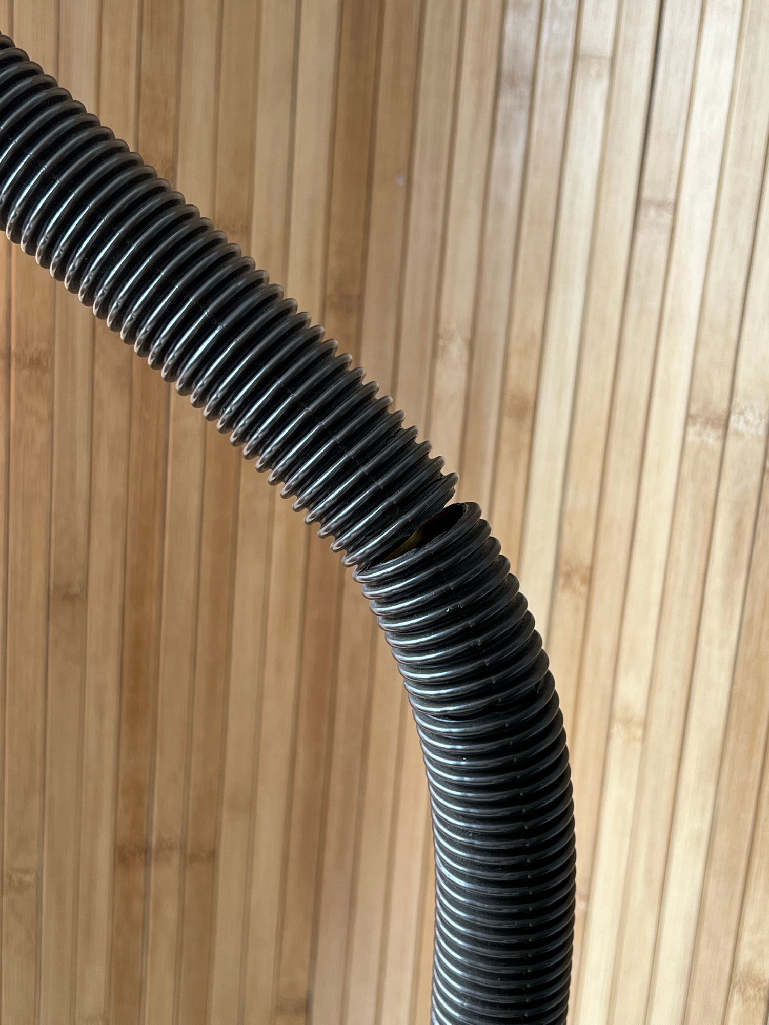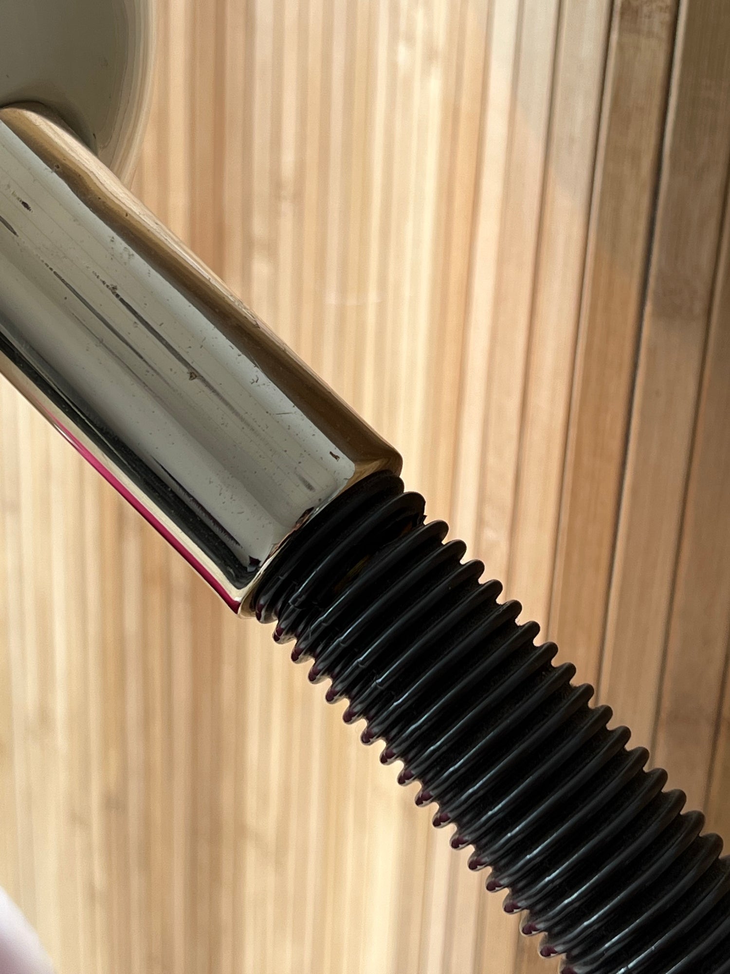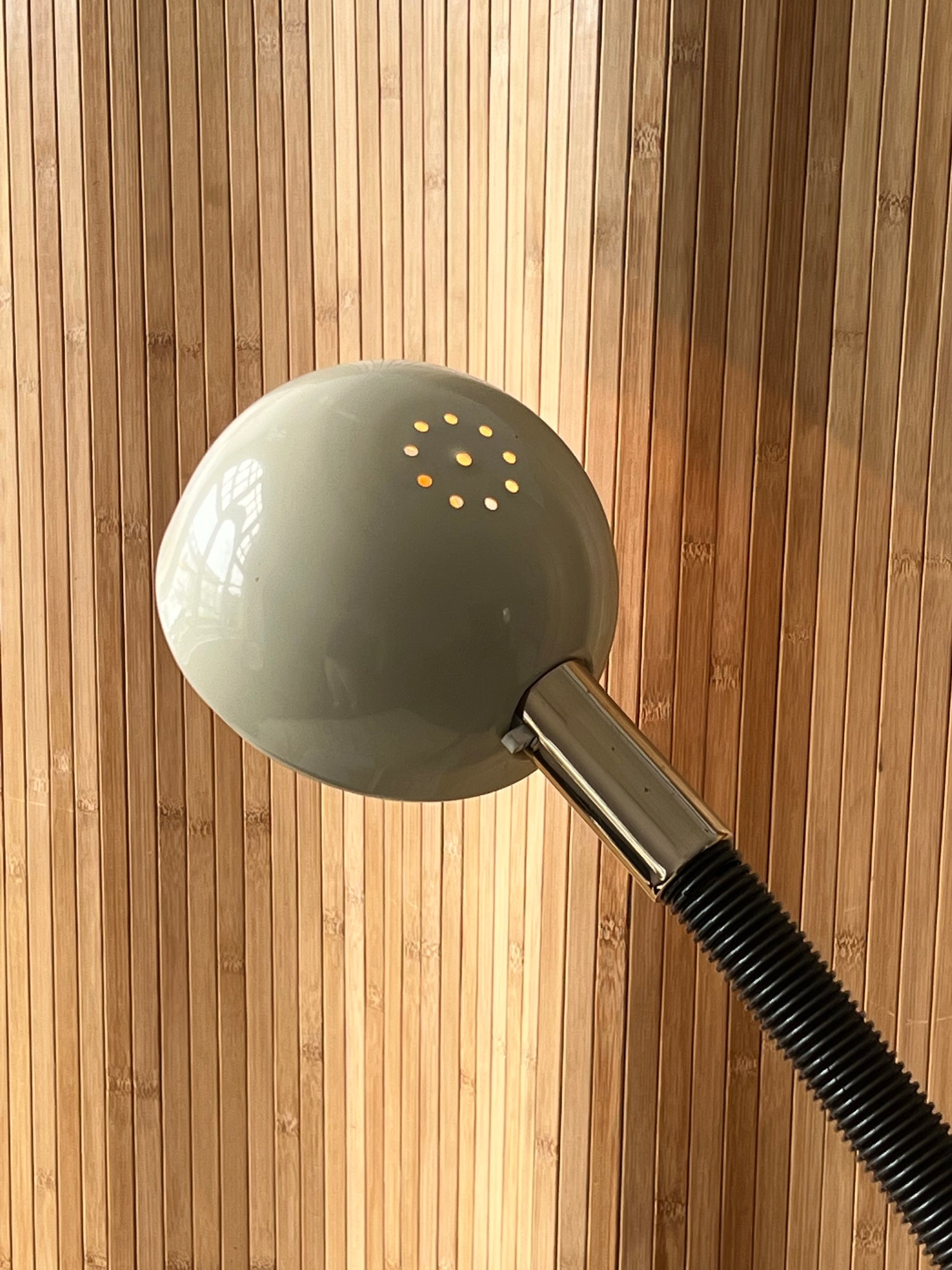 Gooseneck has some splits in it (photographed) Still in good used condition. Some light scratches and markings on the chrome (and metal shade is slightly bent). Overall still great aesthetic. Lamp in working order.