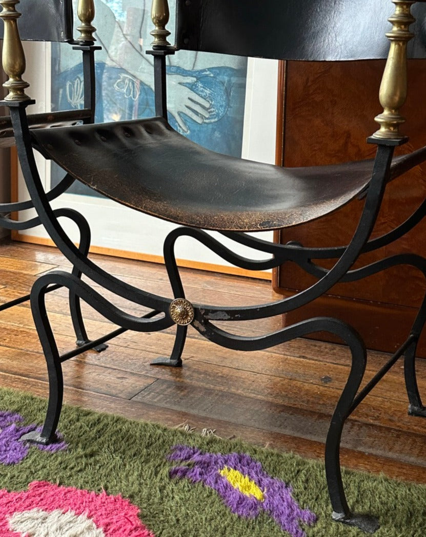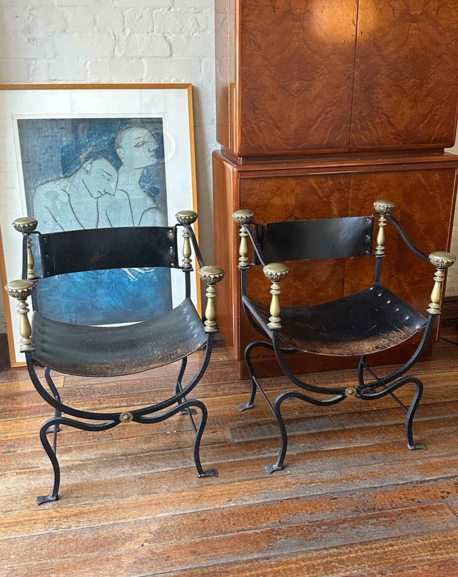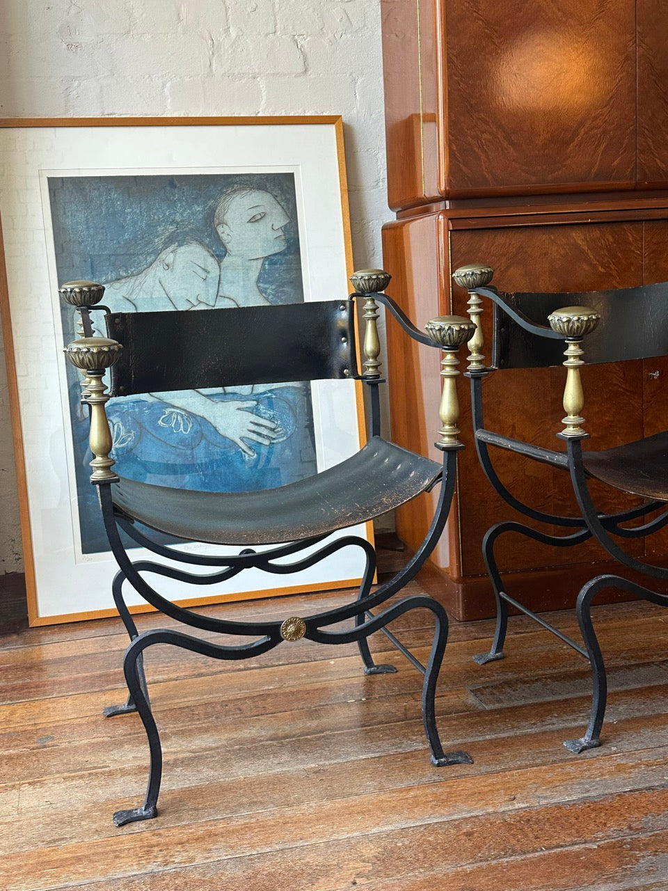 Pair of Wrought Iron & Brass Savonarola Armchairs