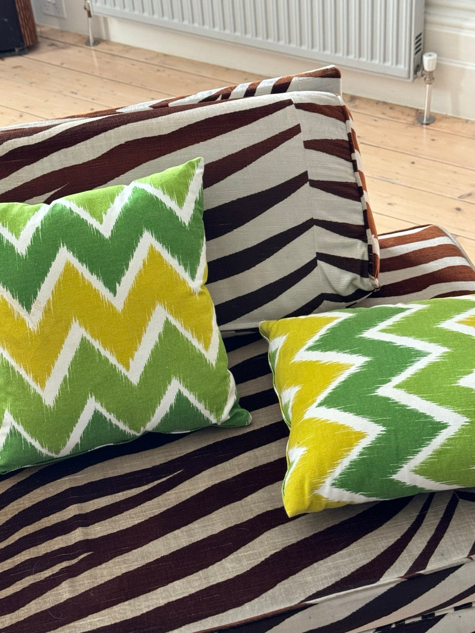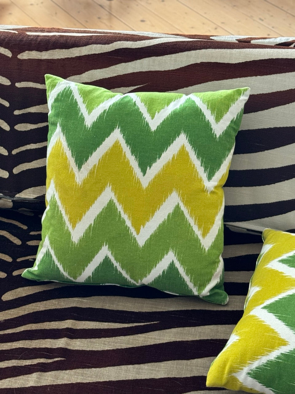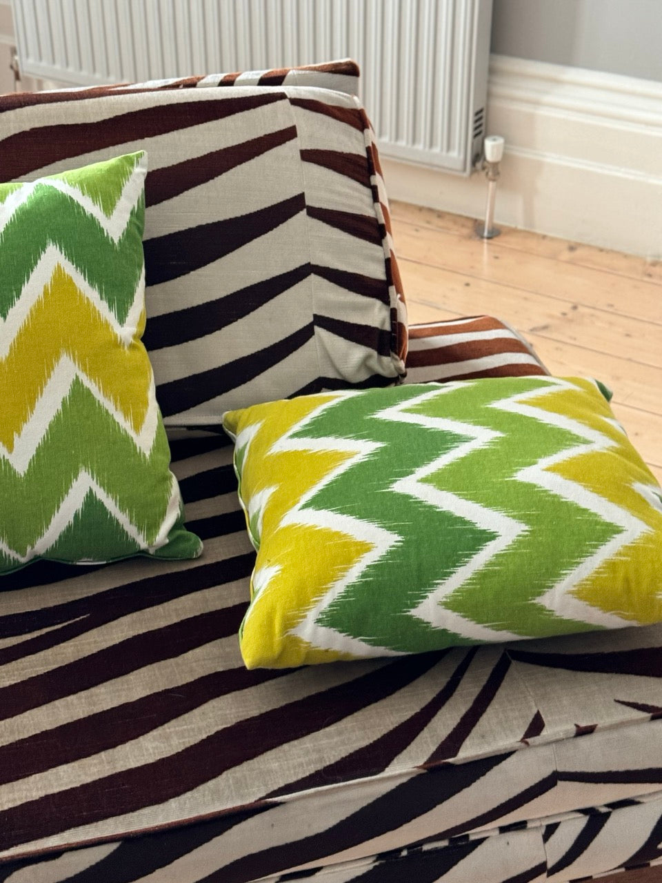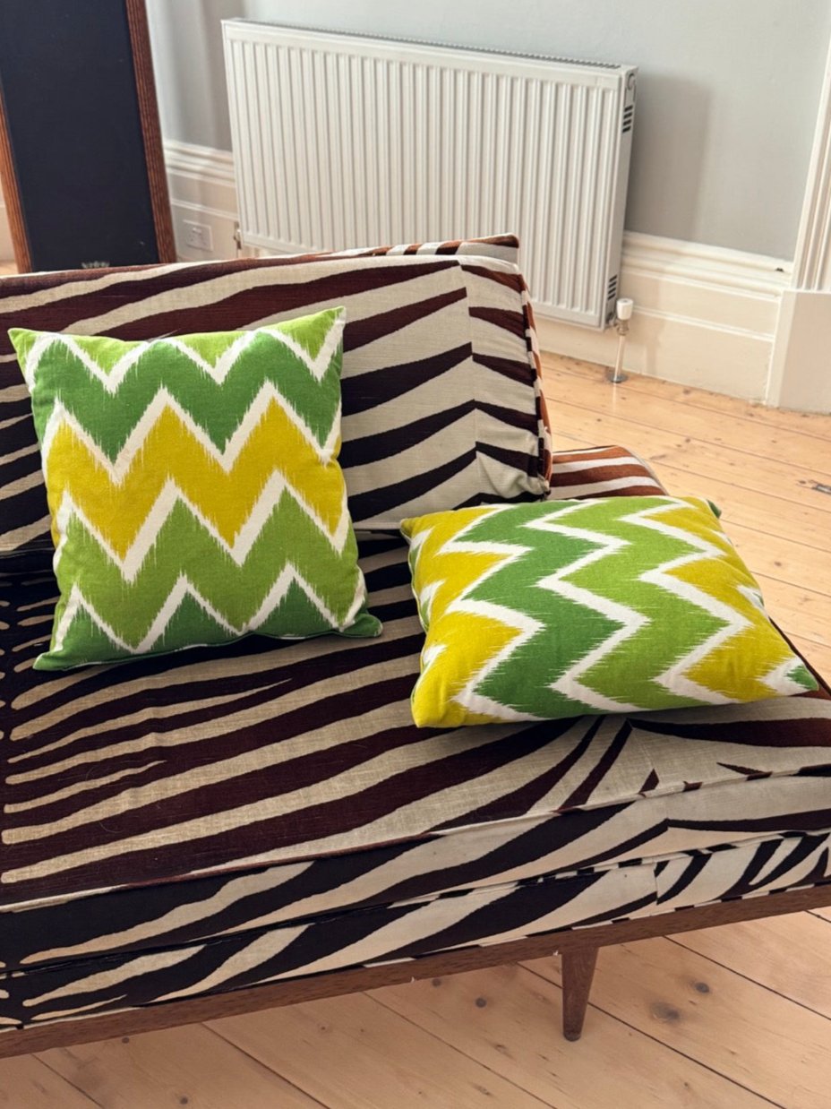 Pair of vintage cushions in green, yellow and white zig zag pattern