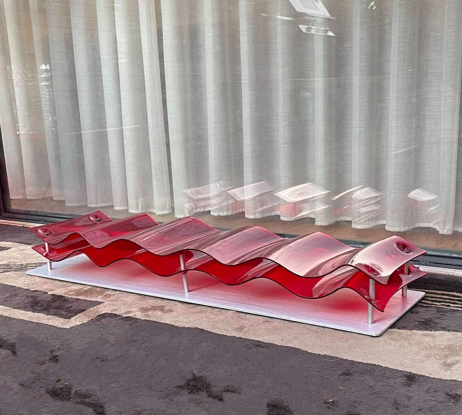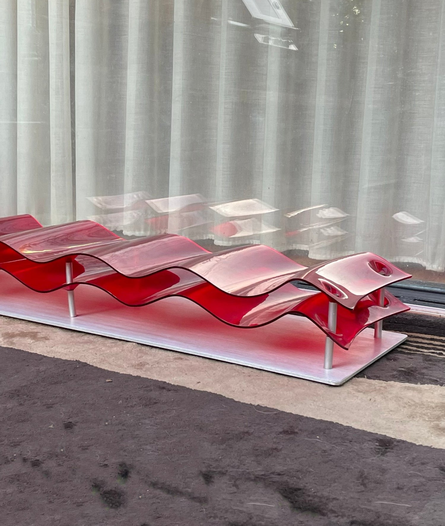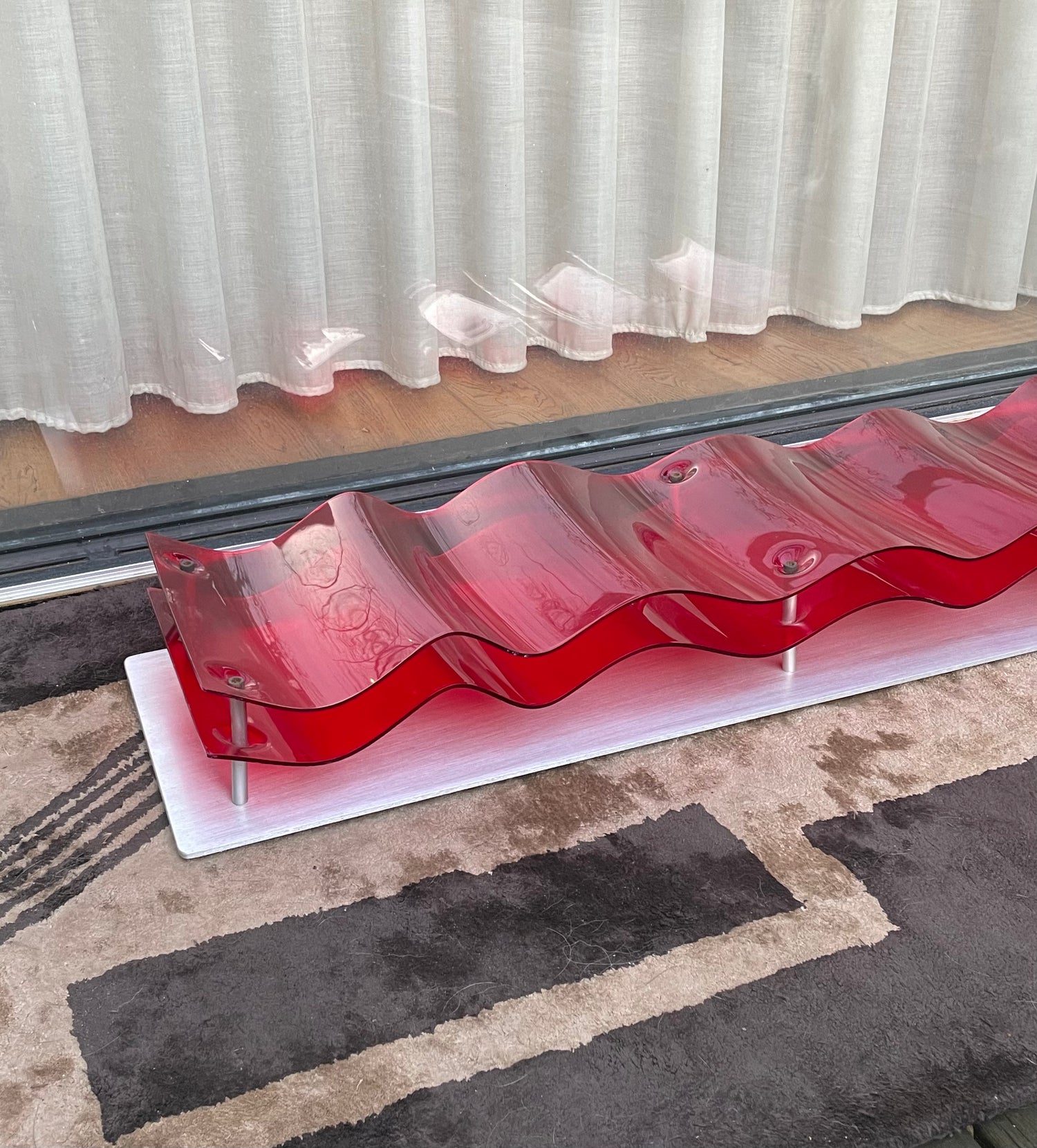 Two piece wave of red perspex mounted on an aluminium plate. Rubber feet suggests it's designed to lay flat, however can be hung.