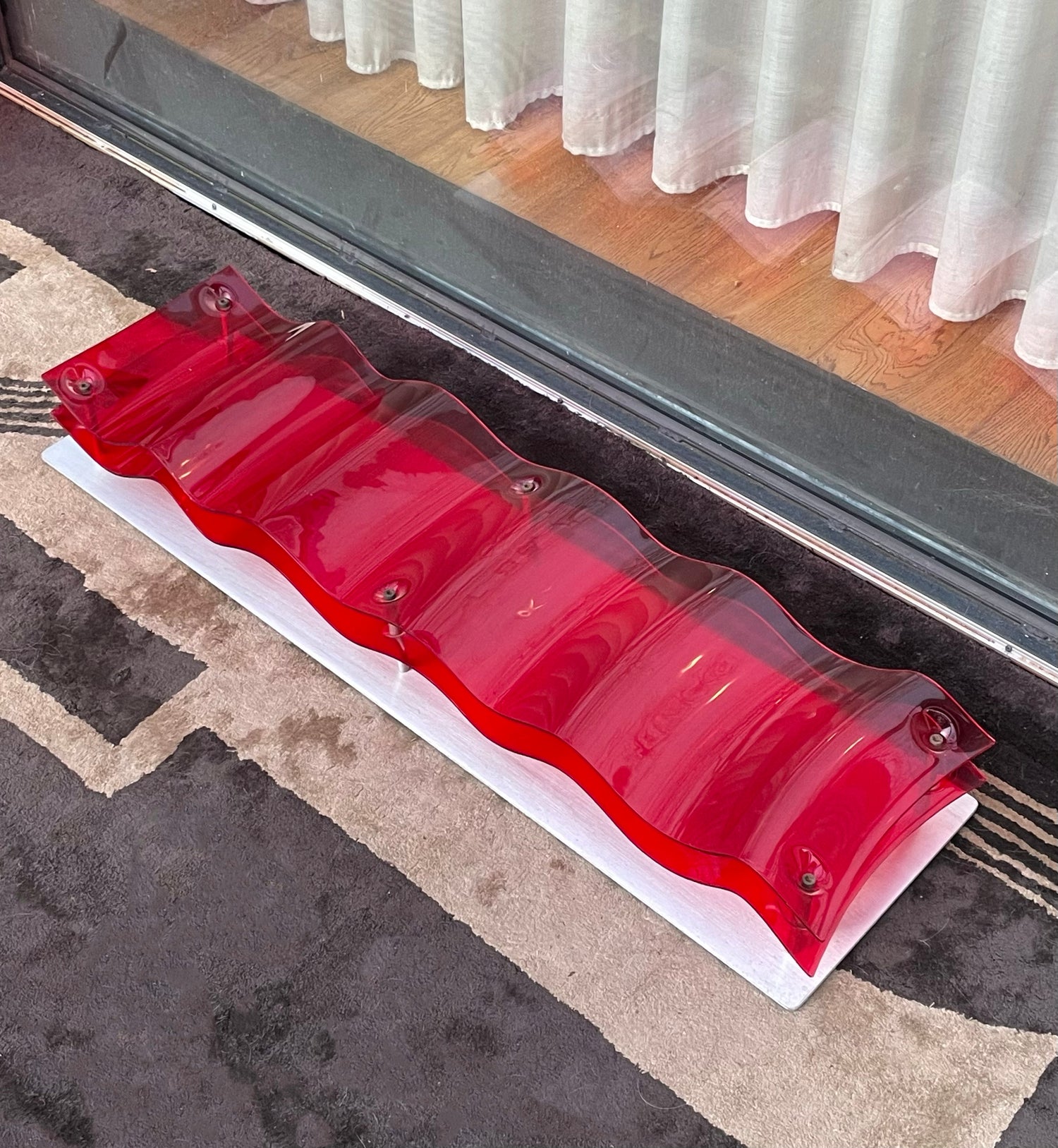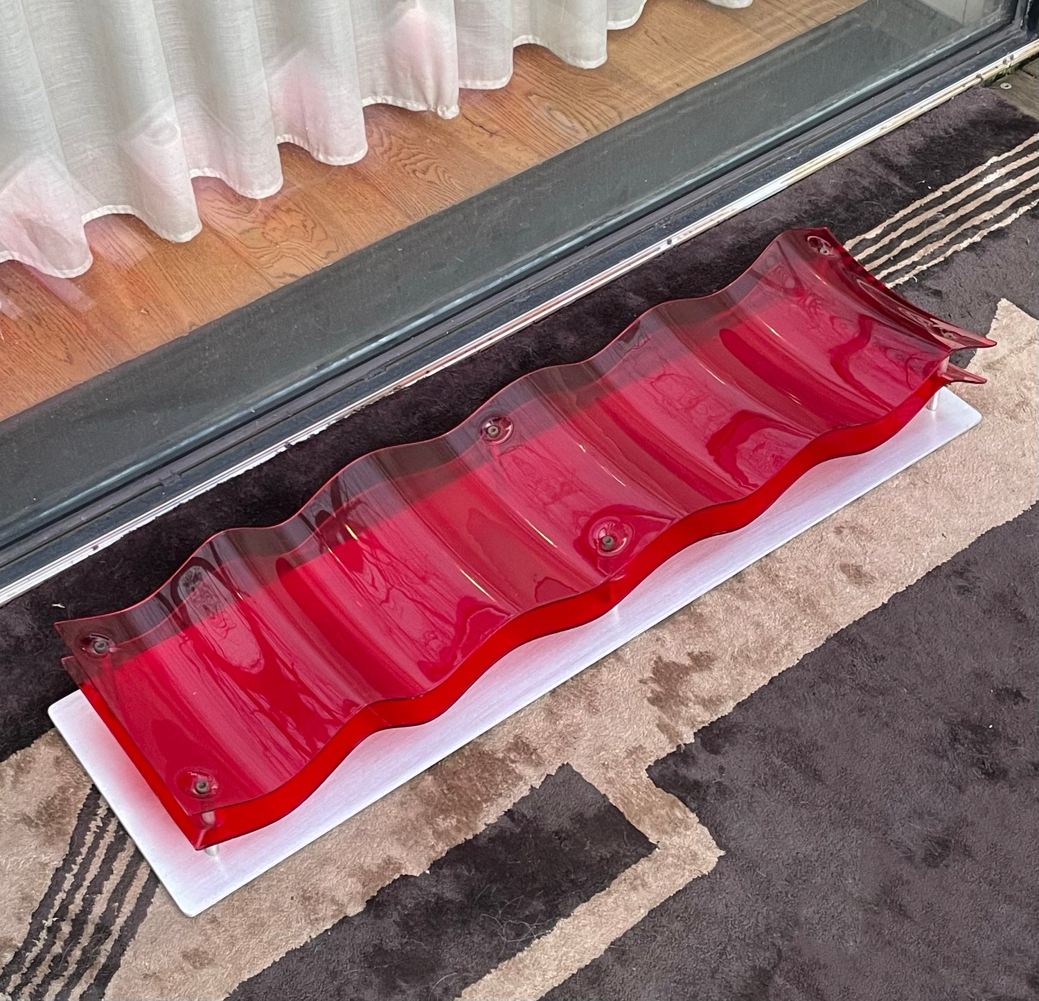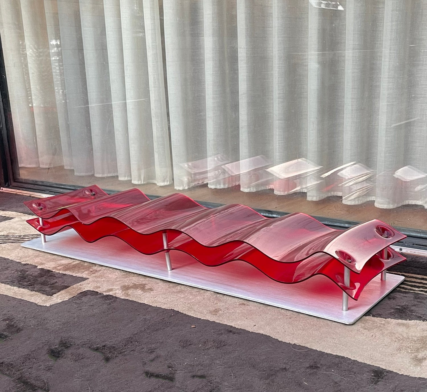 Two piece wave of red perspex mounted on an aluminium plate. Rubber feet suggests it's designed to lay flat, however can be hung.
