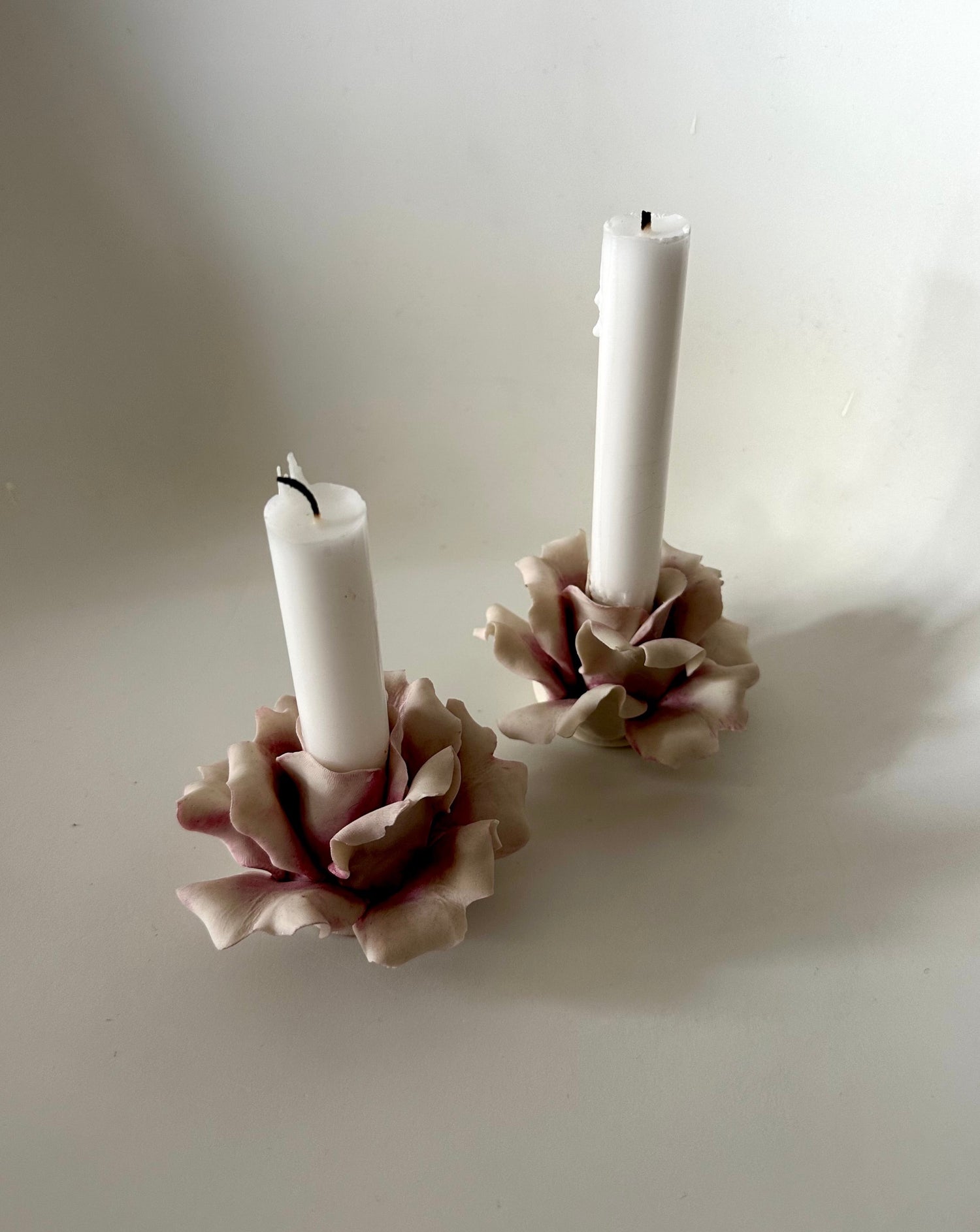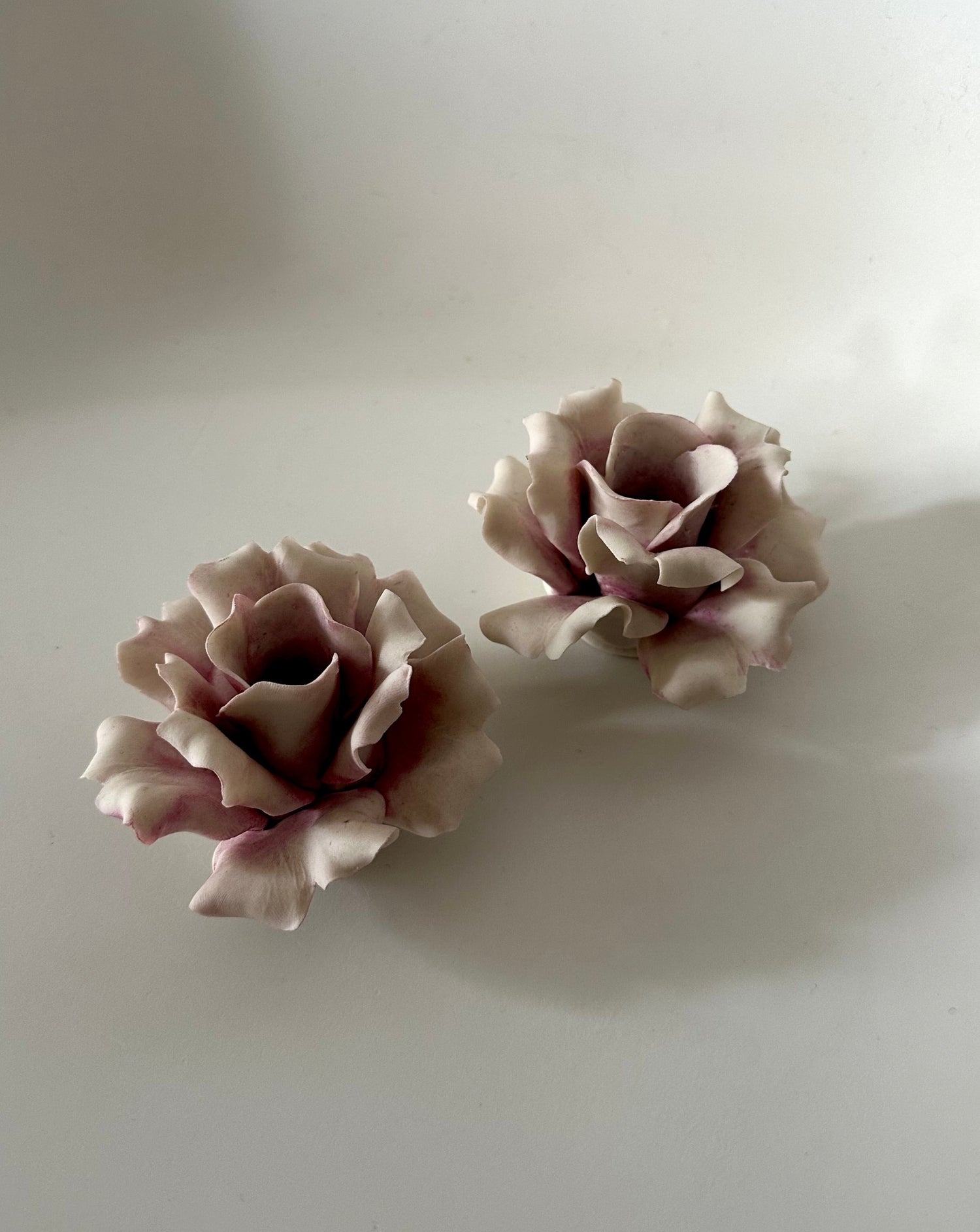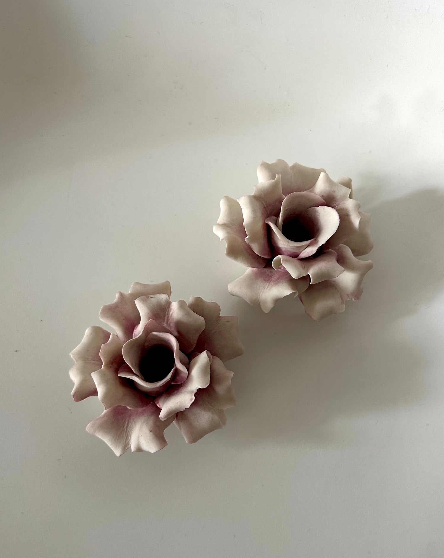 Vintage 1960s pink porcelain rose candle holders, Nuova Capodimonte, Italy.