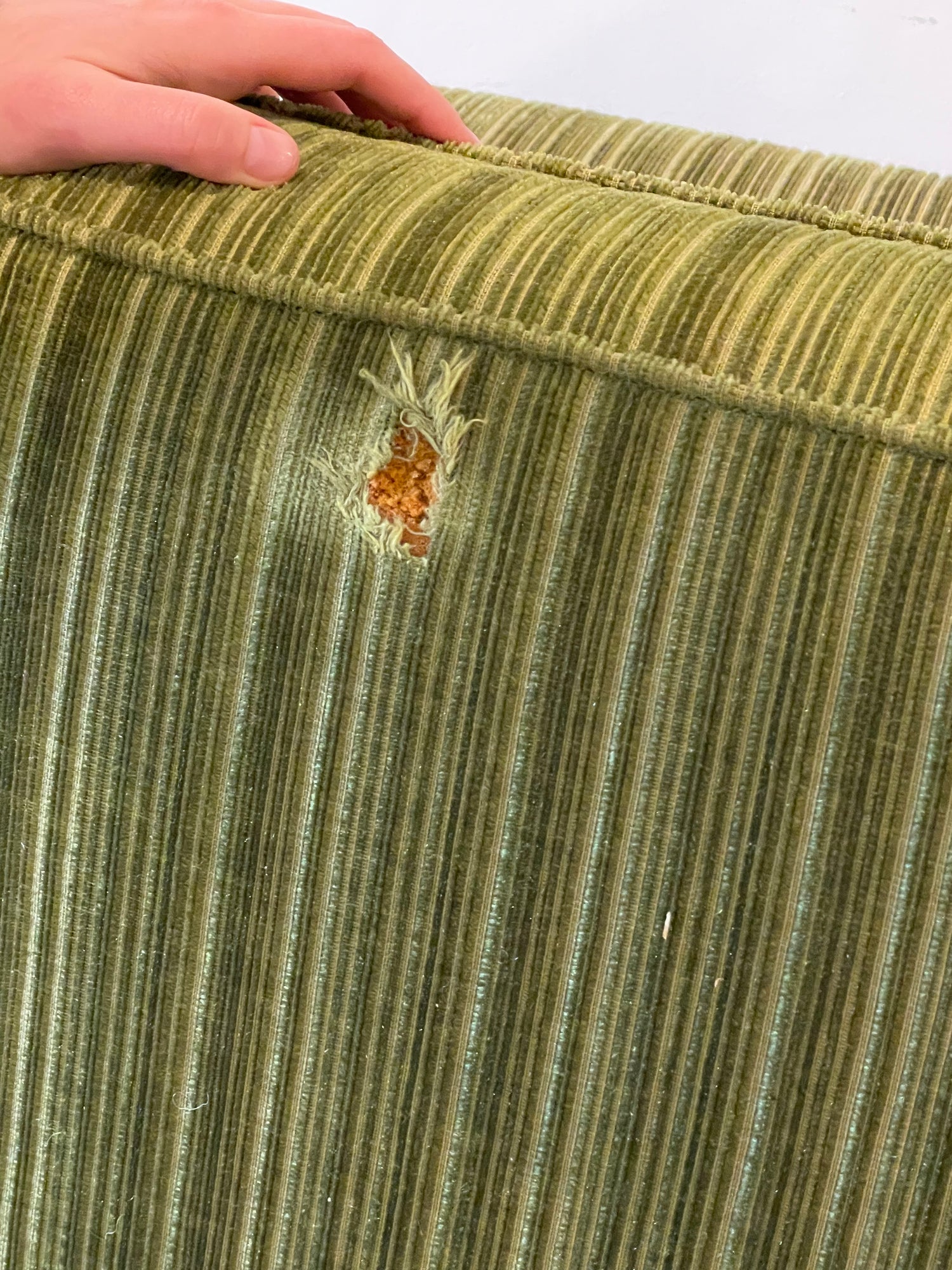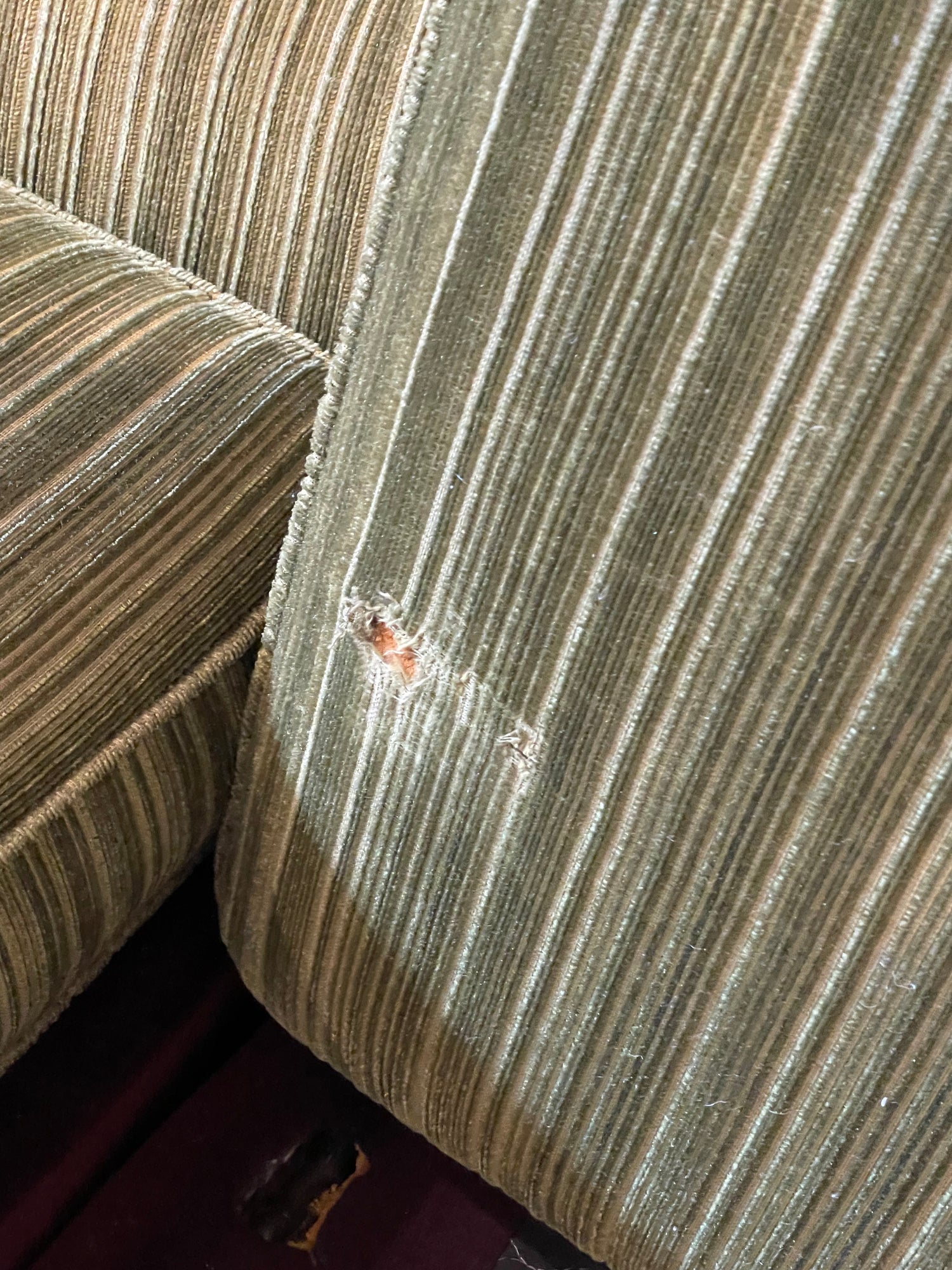 Condition is good, there are two light marks on the material that are not very noticeable, underneath two of the cushions are small holes in the fabric of the base of the sofa and on the bottom side of the cushion. This is not noticeable when cushions are on. Damage is shown in the images attached.