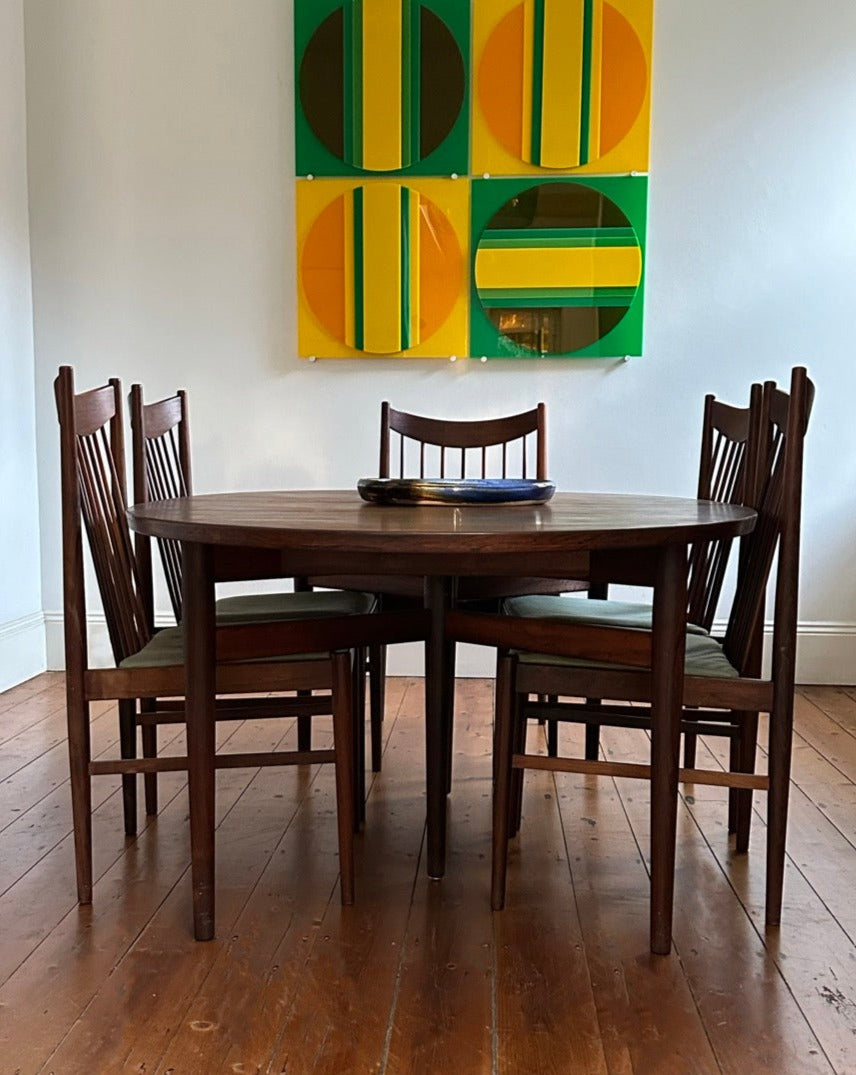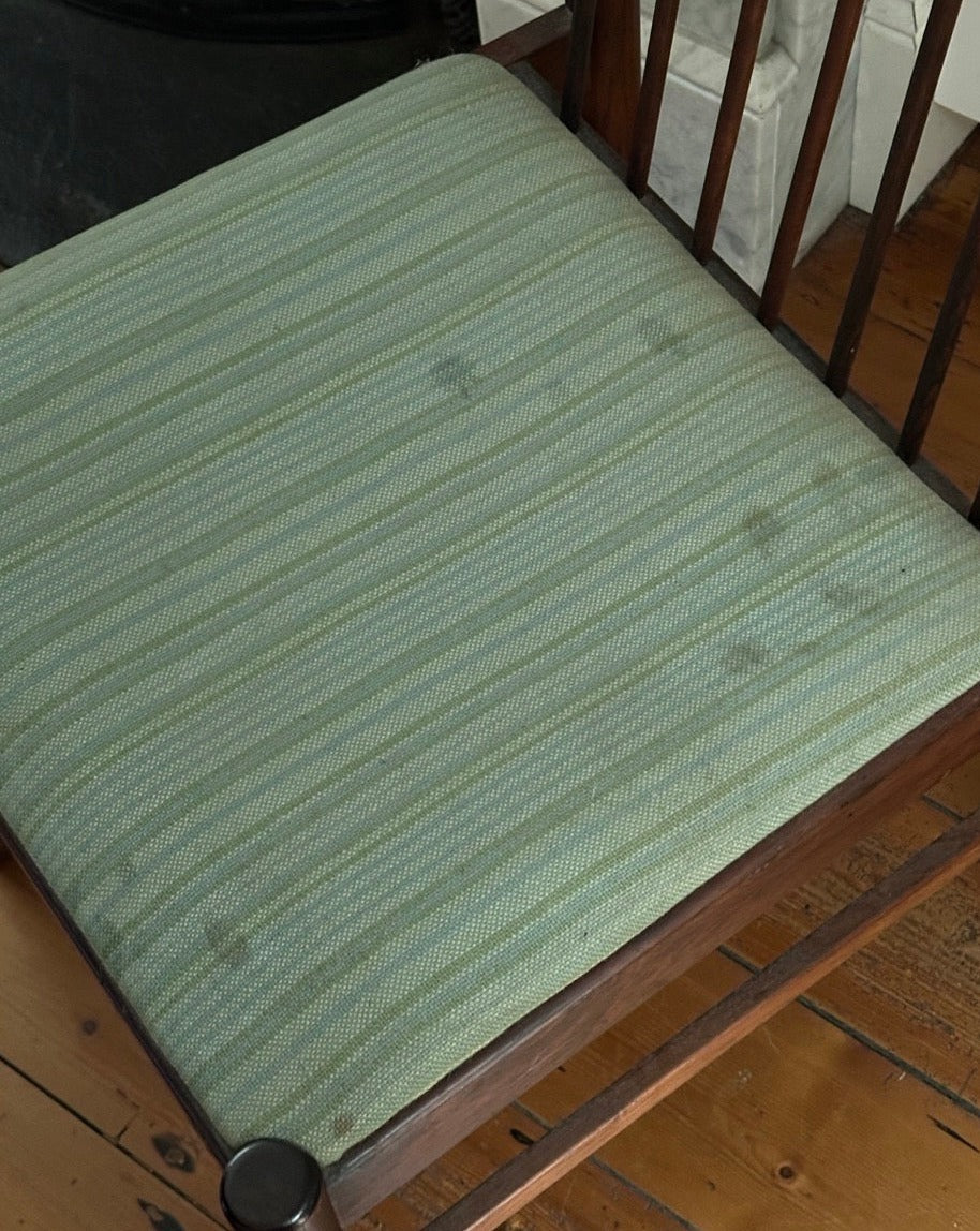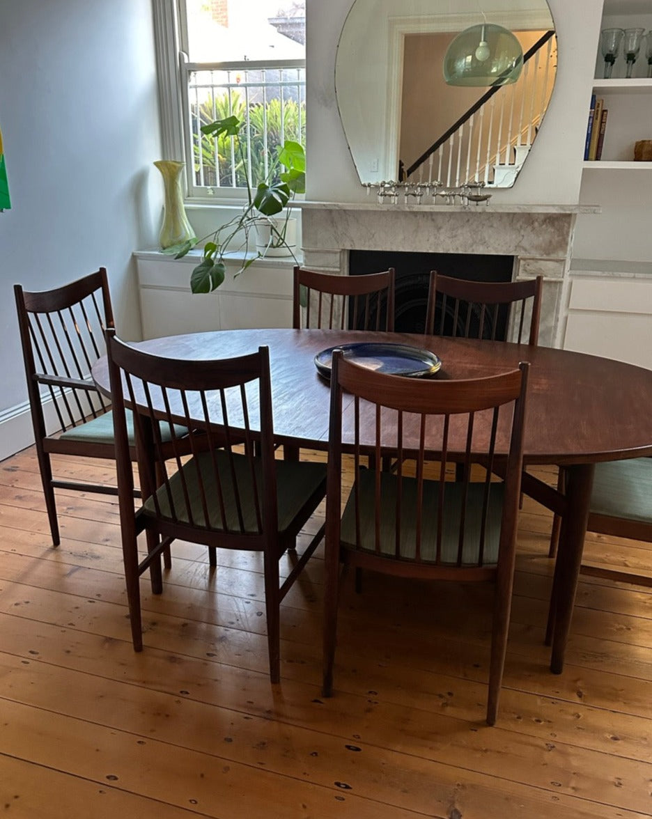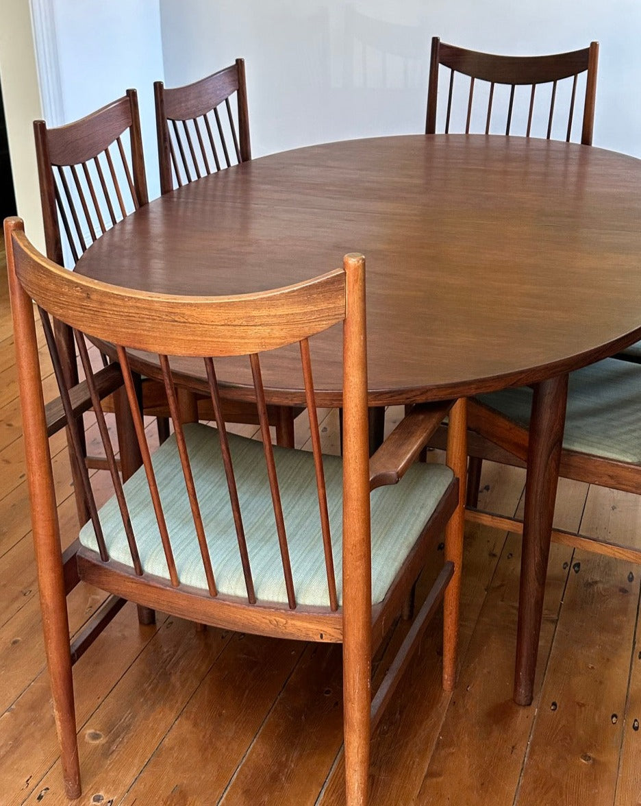 Good condition. The table is in great condition apart from a few marks and only needs a light oil. The seats are all intact and look great, apart from one spindle on one chair that has broken off, but can be glued back on. The foam has deteriorated and there are some light marks to the fabric that could probably come out with a steam clean. The chair in the least favourable condition is shown in the last photo.