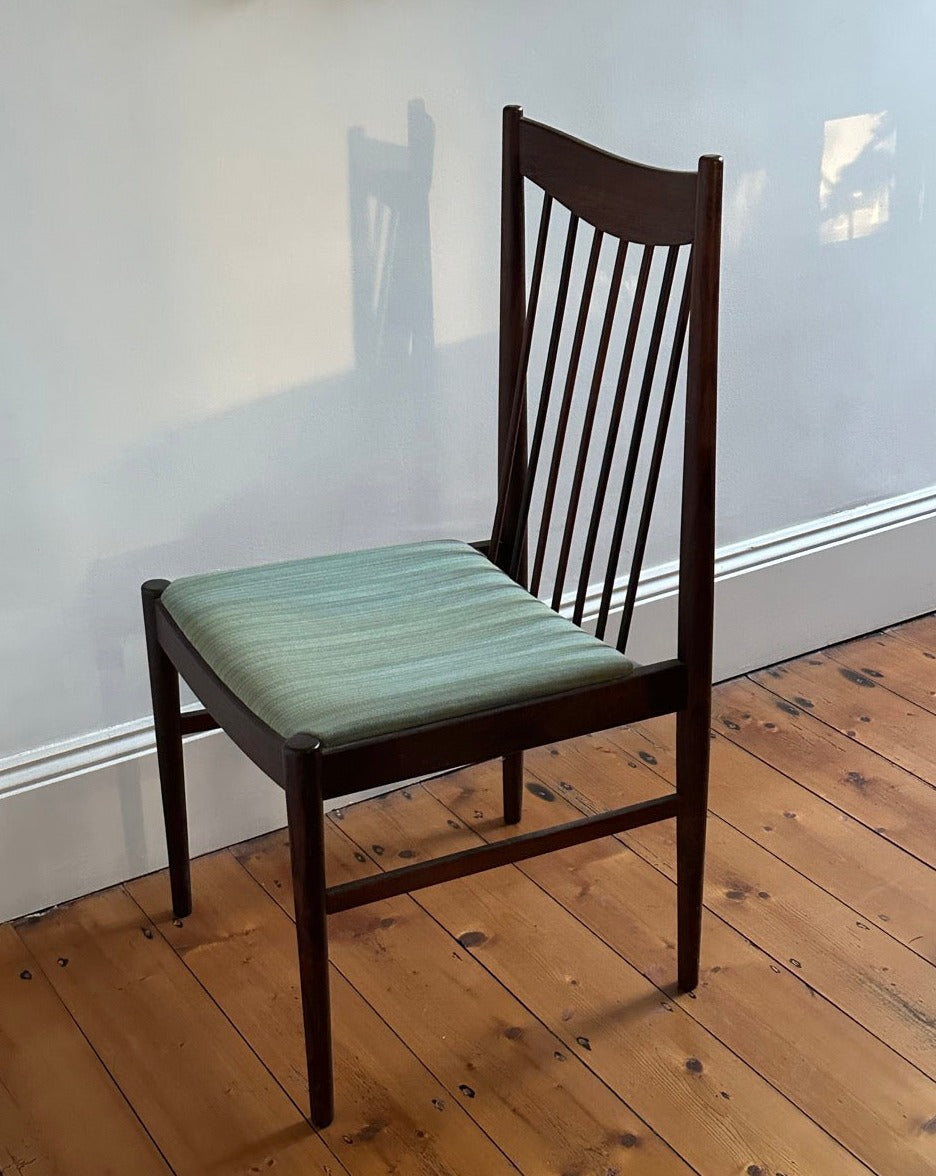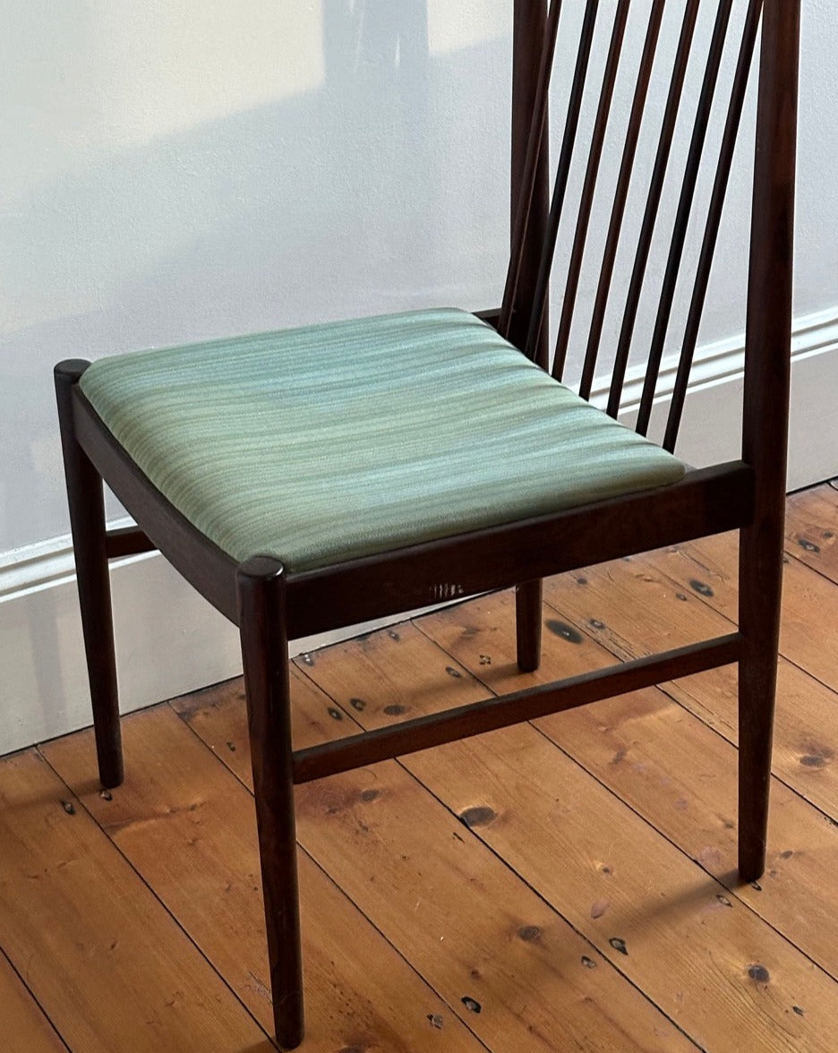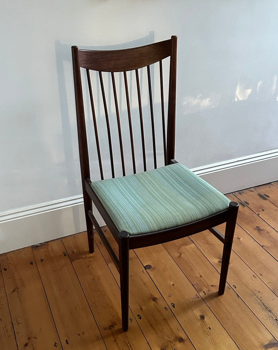 These high-back dining chairs feature slender rosewood frames with slanted dowels joined to a graceful curved backrest. They retain their original blue and green striped fabric seats.