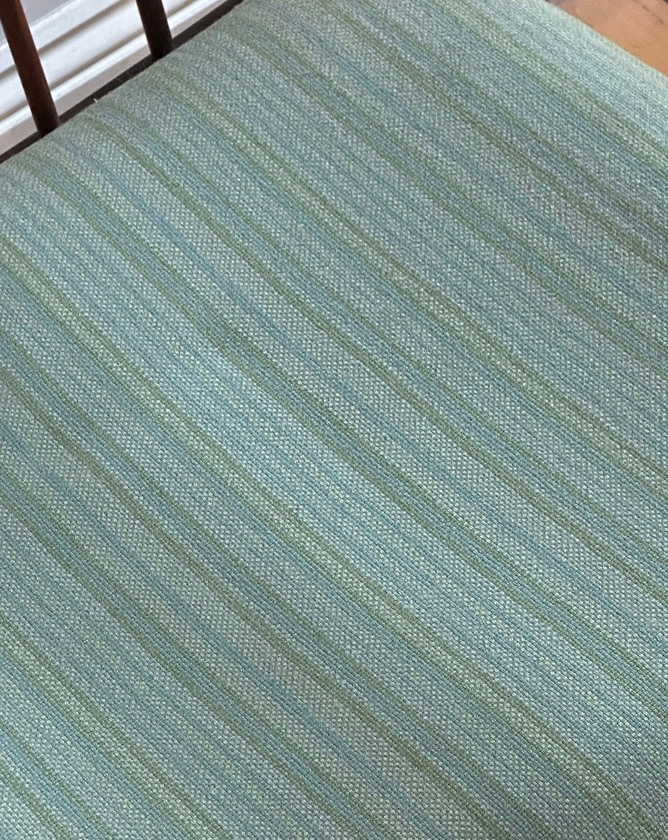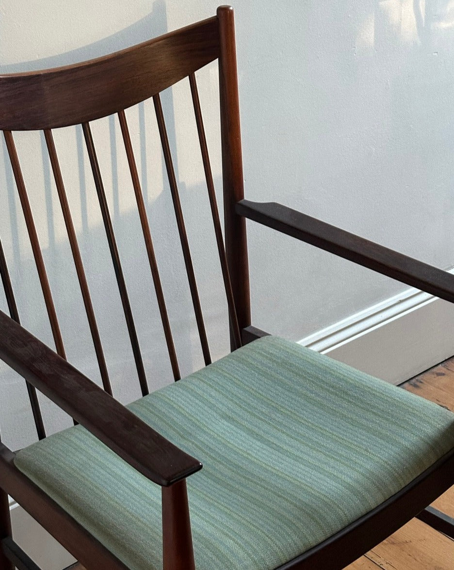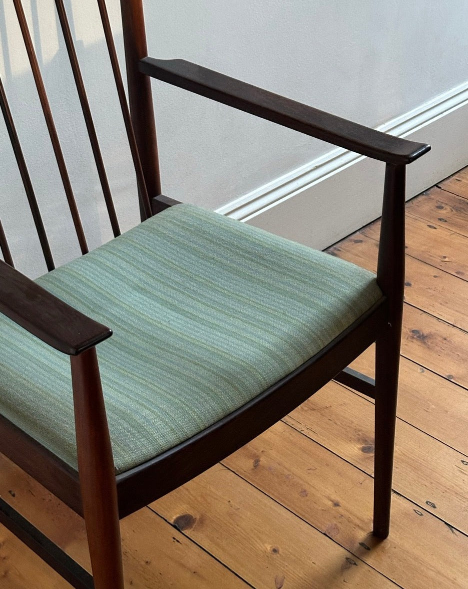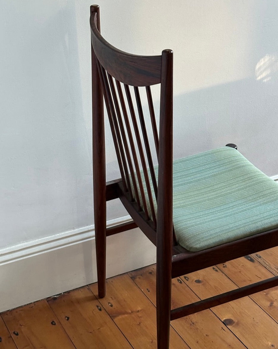 These high-back dining chairs feature slender rosewood frames with slanted dowels joined to a graceful curved backrest. They retain their original blue and green striped fabric seats.