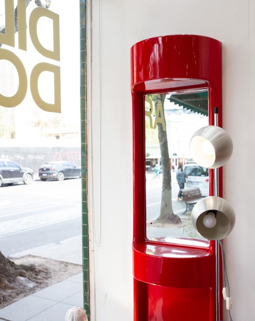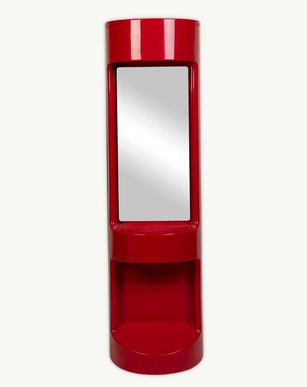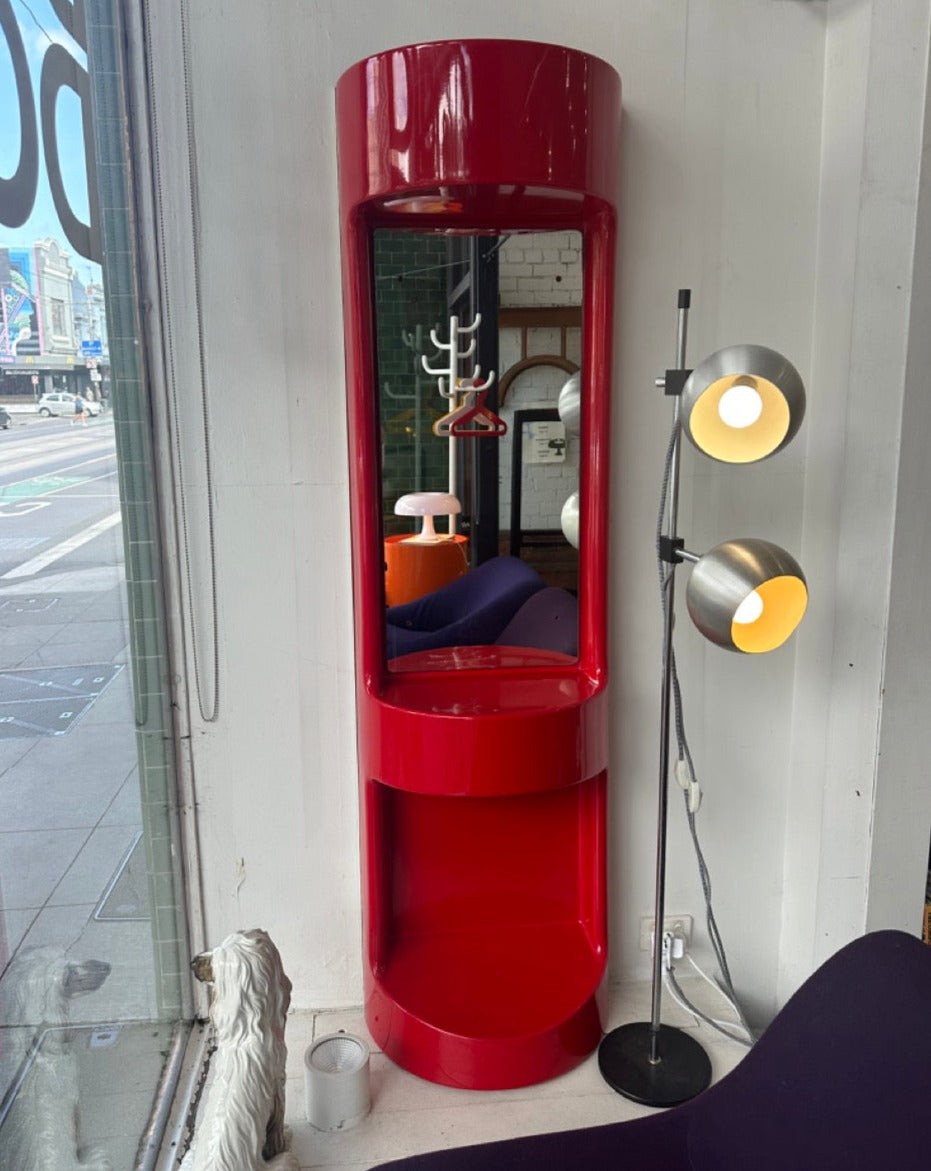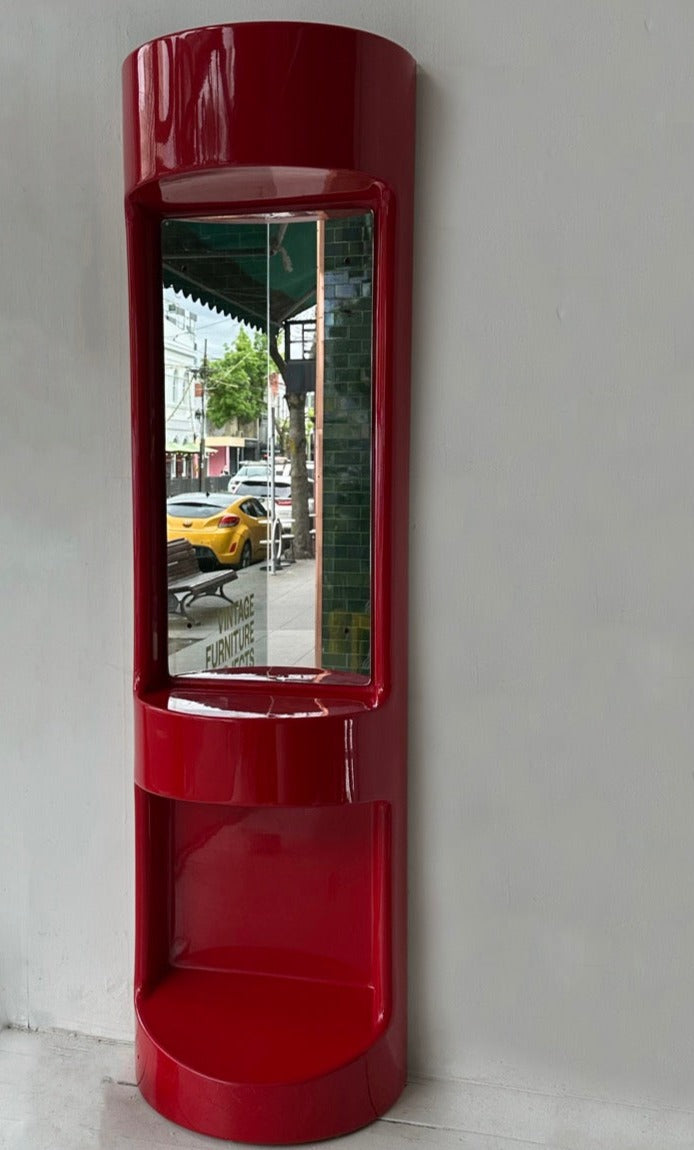 A very unique piece with an original red fibreglass body and a central mirror. Wooden backing allows the vanity to be mounted to a wall or simply left free standing.