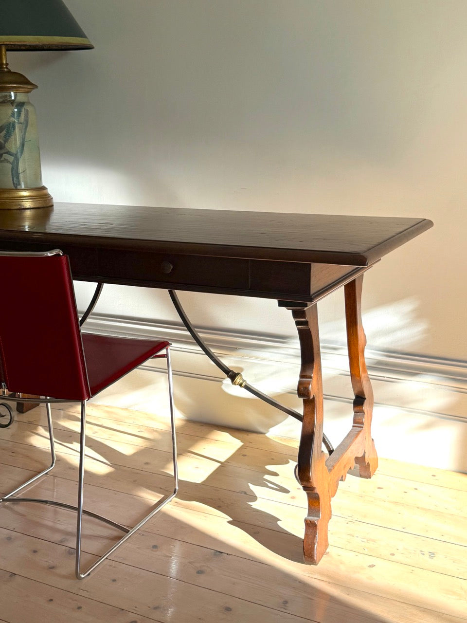 On trestle legs with a wrought iron stretcher, brass detailing and two drawers