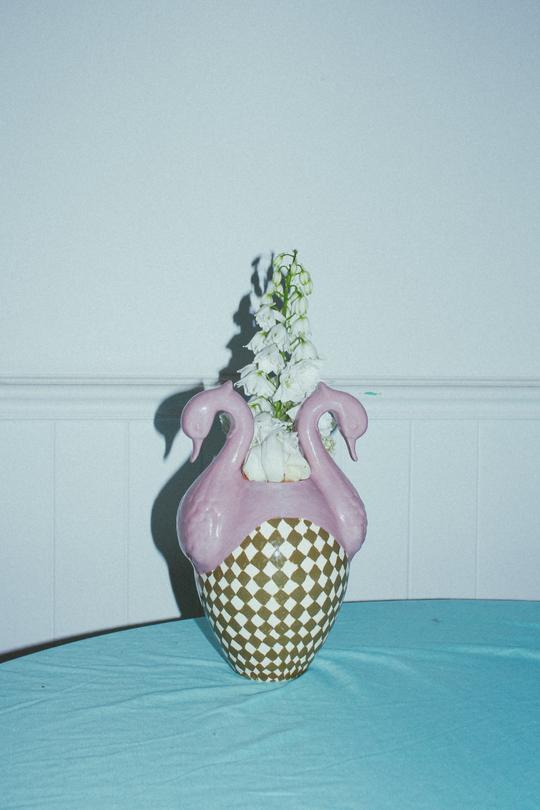 Ceramic swan vase formed from earthenware clay, featuring two swan heads adorning the opening of the vase. Painted with olive and lilac underglaze, with diamond chequer details adorning the centre and base of the vase and finished with a high gloss glaze.